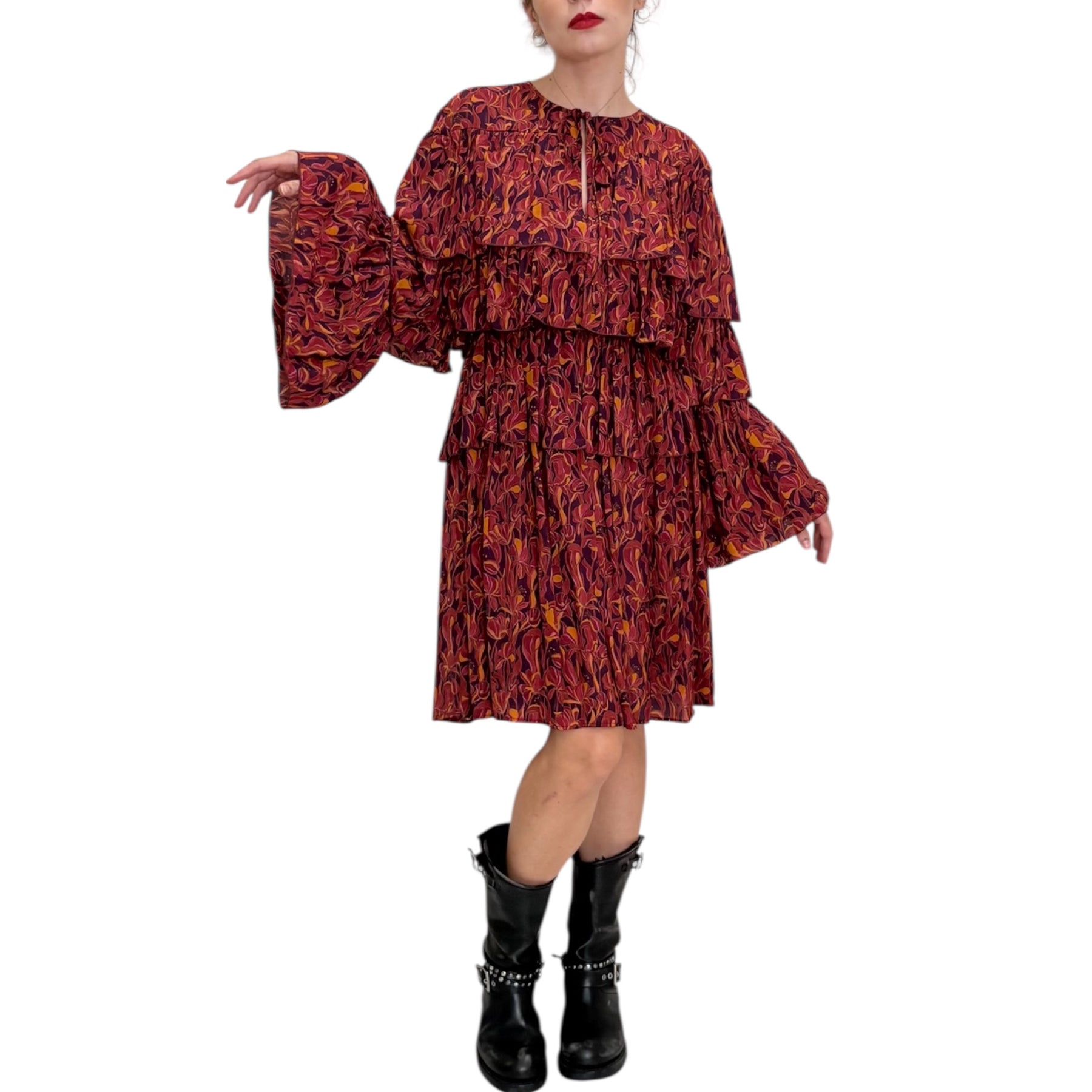 Abito girocollo in sableè crepe di viscosa in fantasia con collo alla coreana , elastico in vita con arricciatura , balze a mantellina nel corpino e manica svasata .