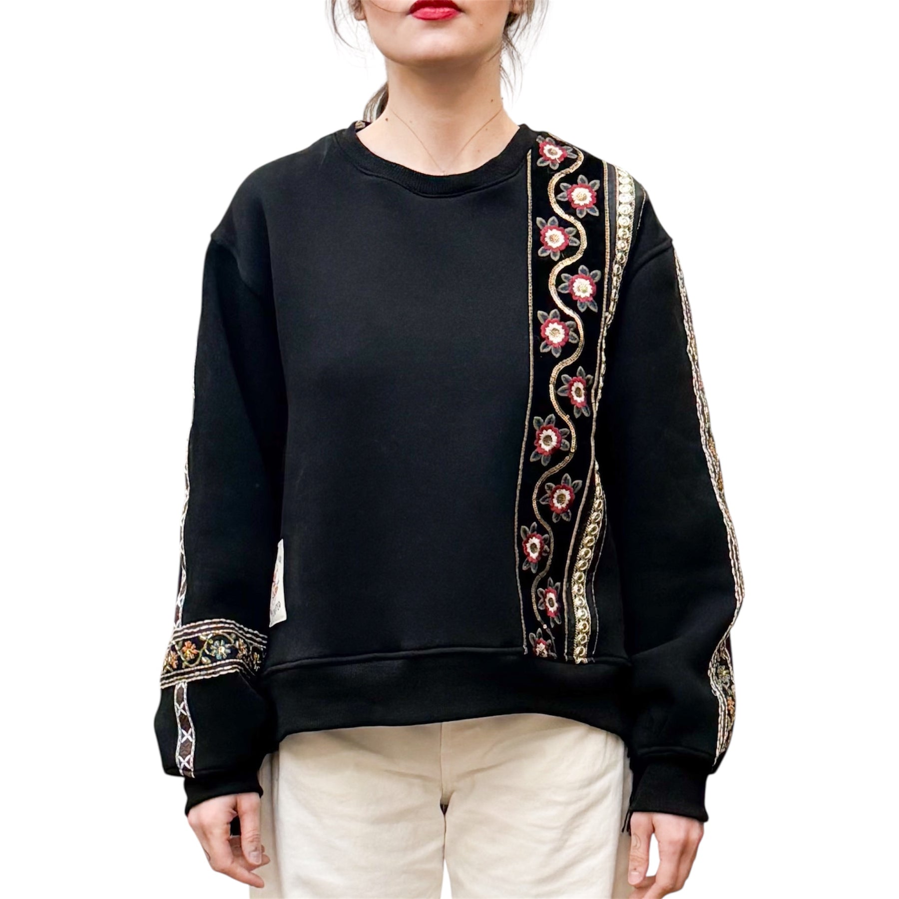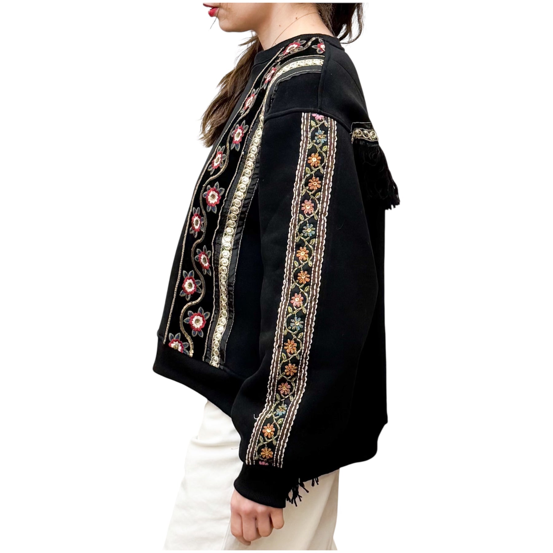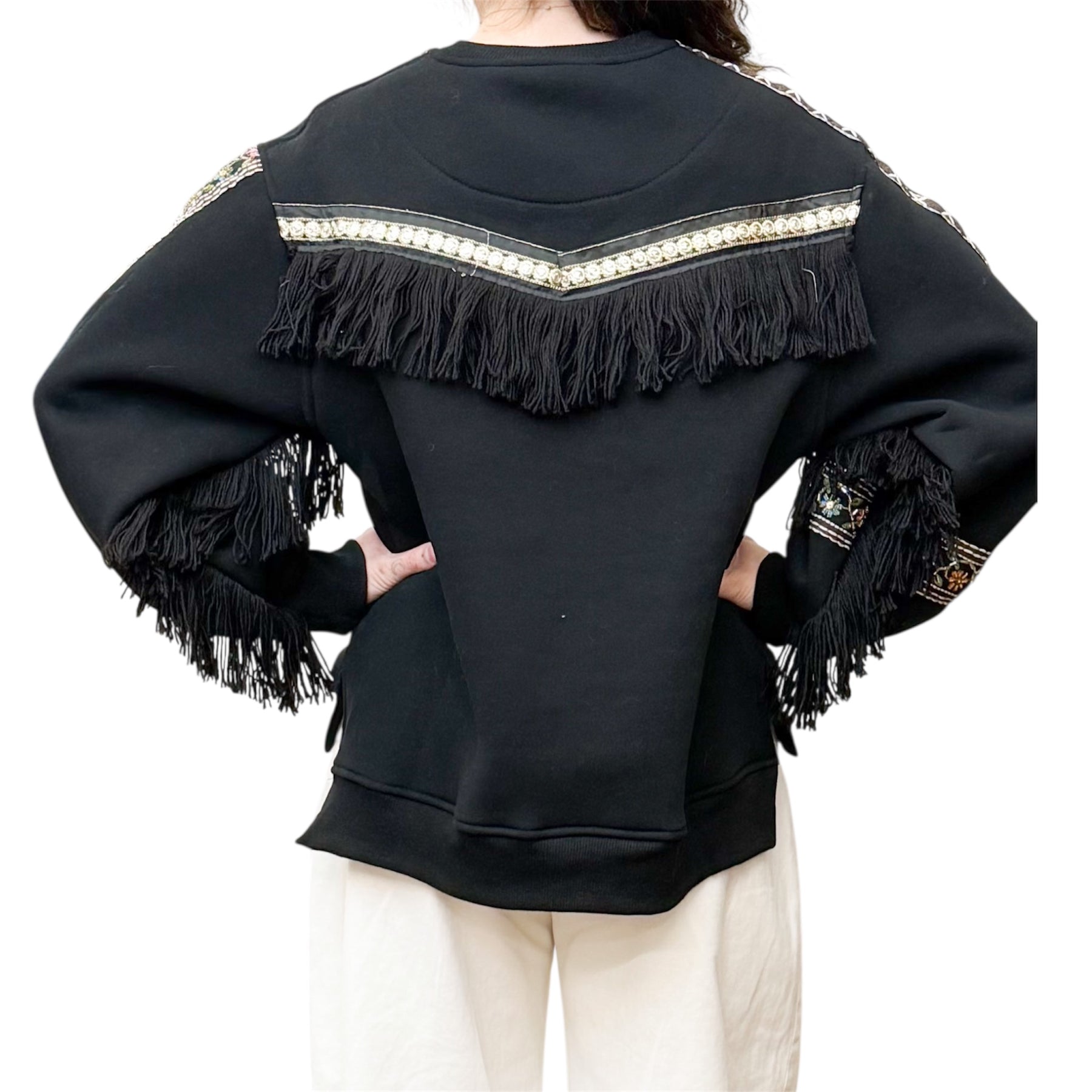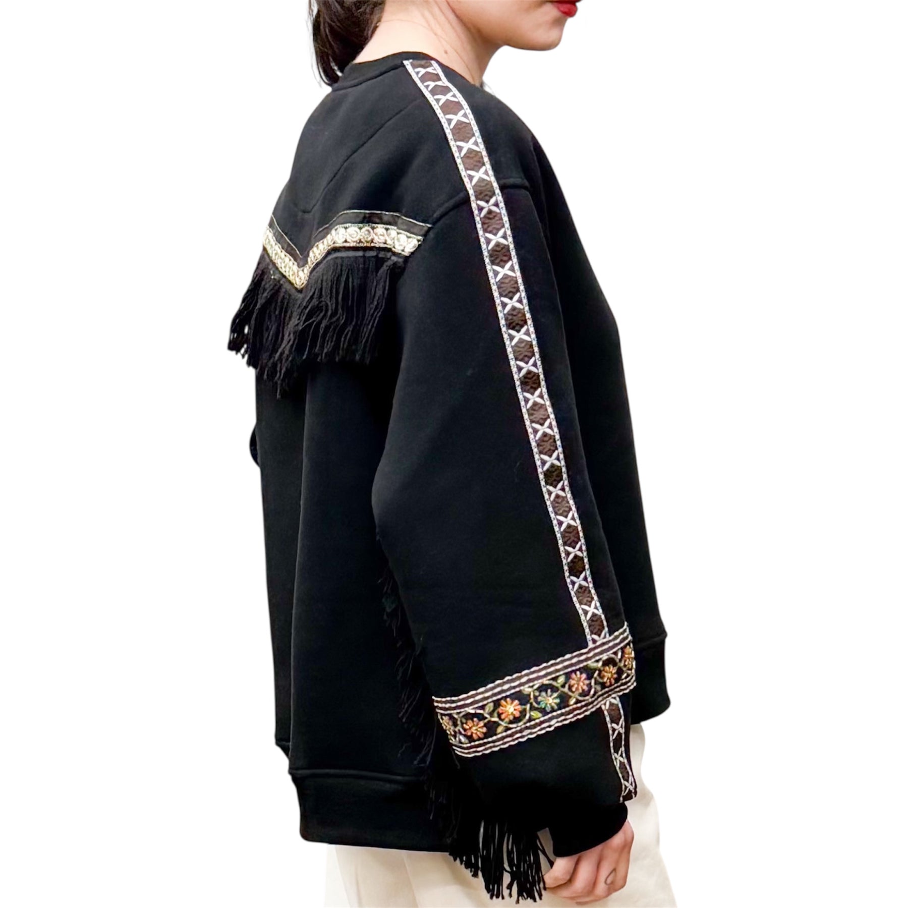 Felpa girocollo pesante con dettagli di passamaneria e frange.