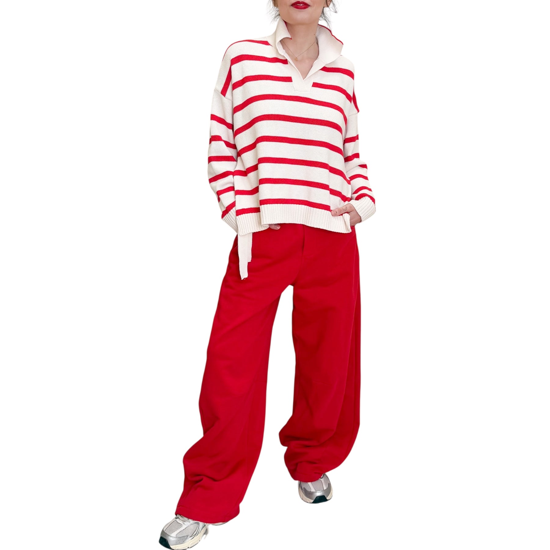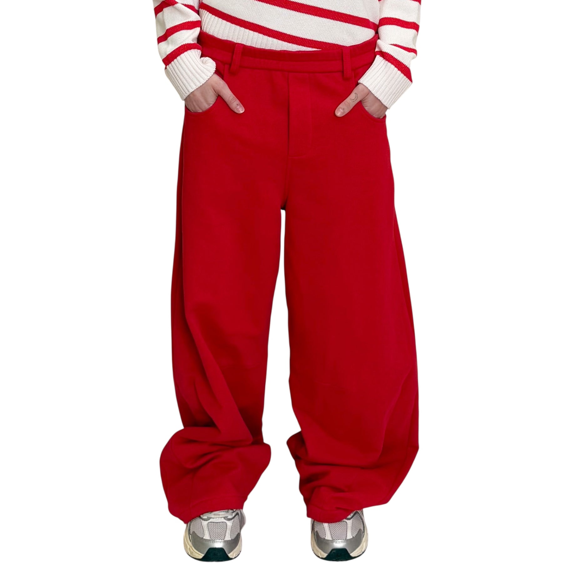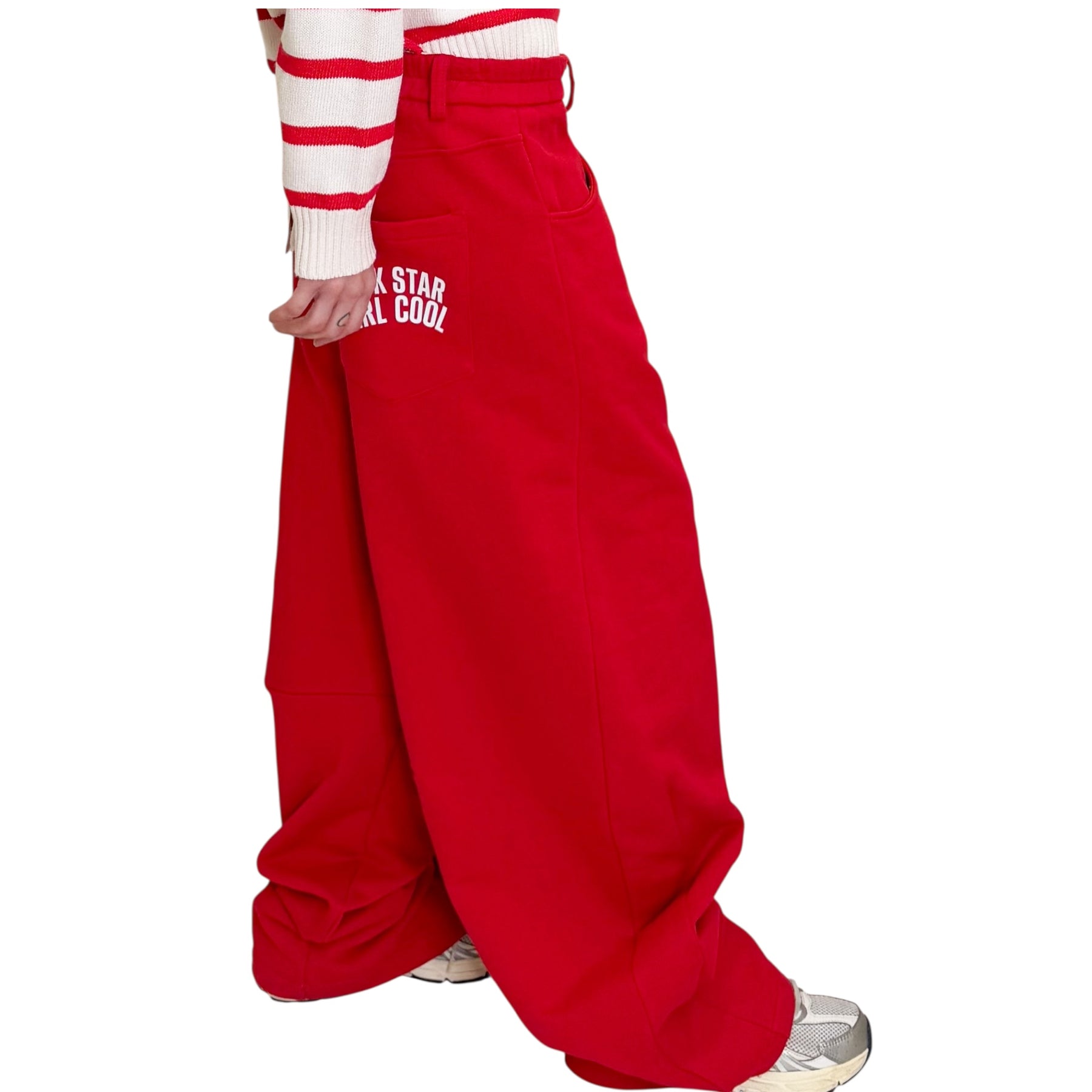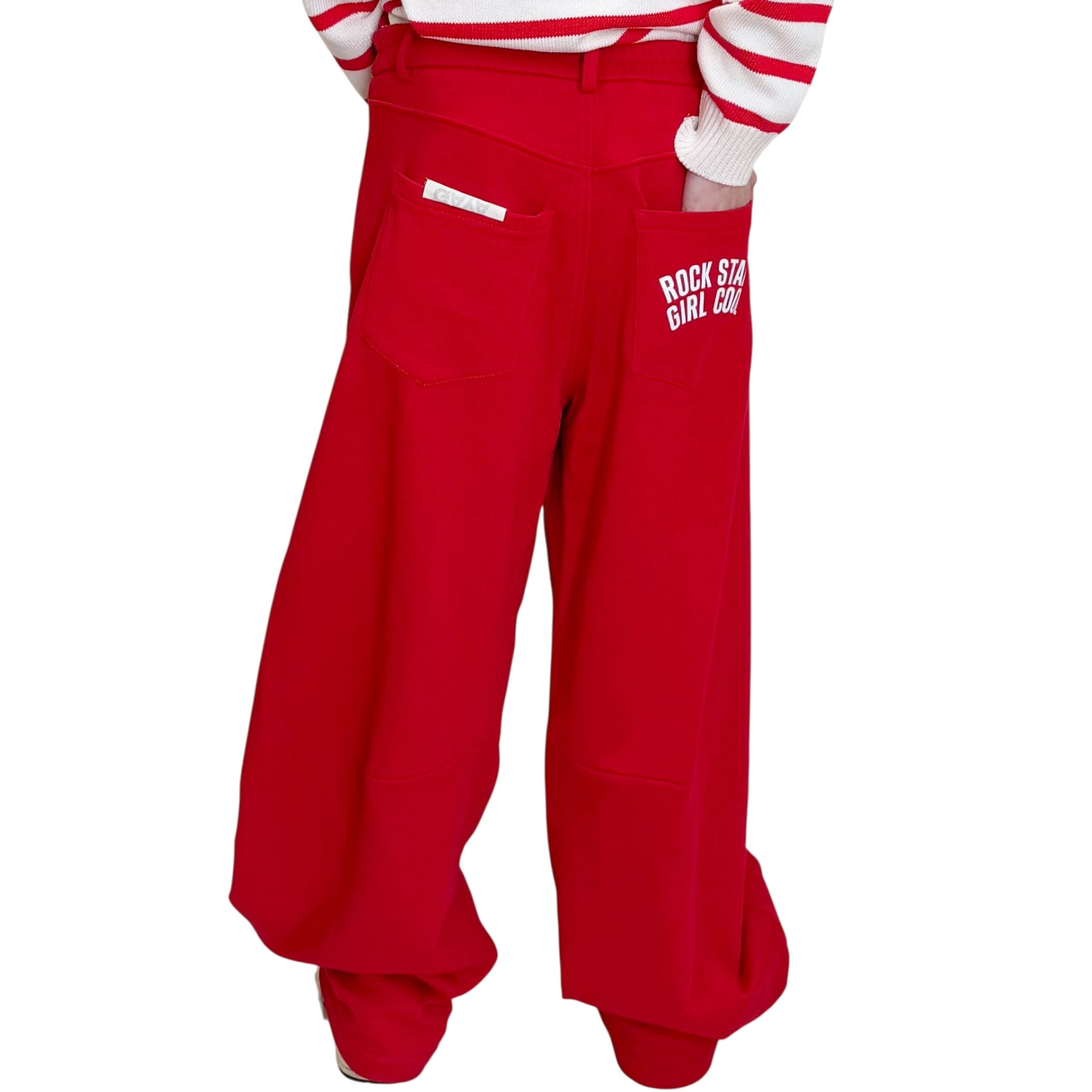 Pantaloni in felpa di cotone con linea a uovo , elastico in vita nel dietro e scritta .