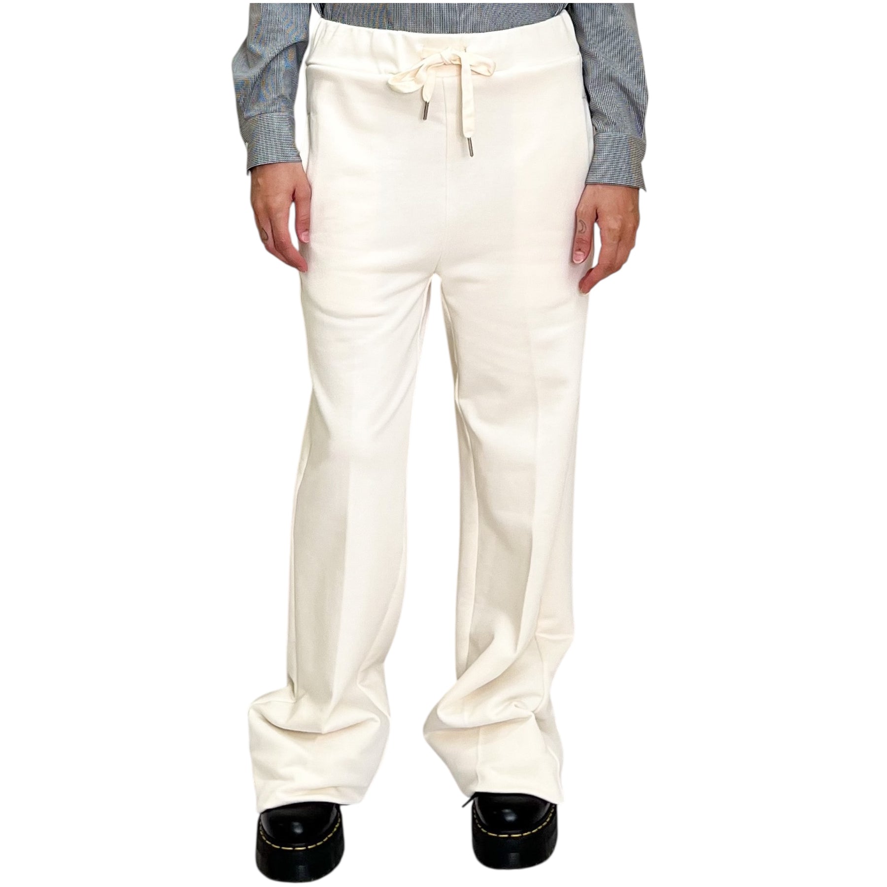 Pantaloni in felpa di cotone garzata con linea leggermente svasata sul fondo , elastico in vita con coulisse e tasche .