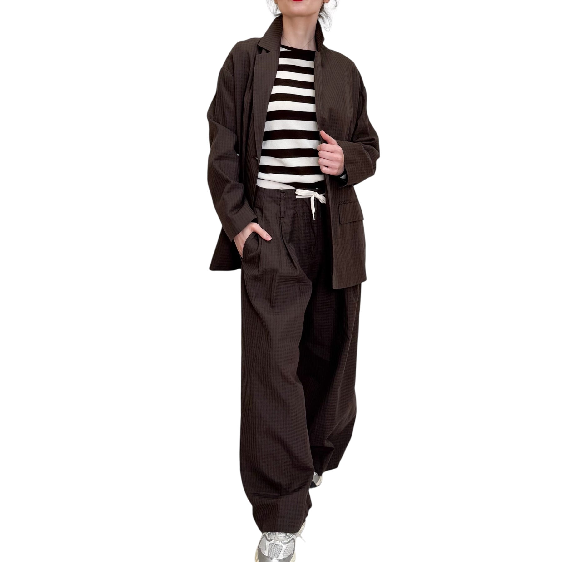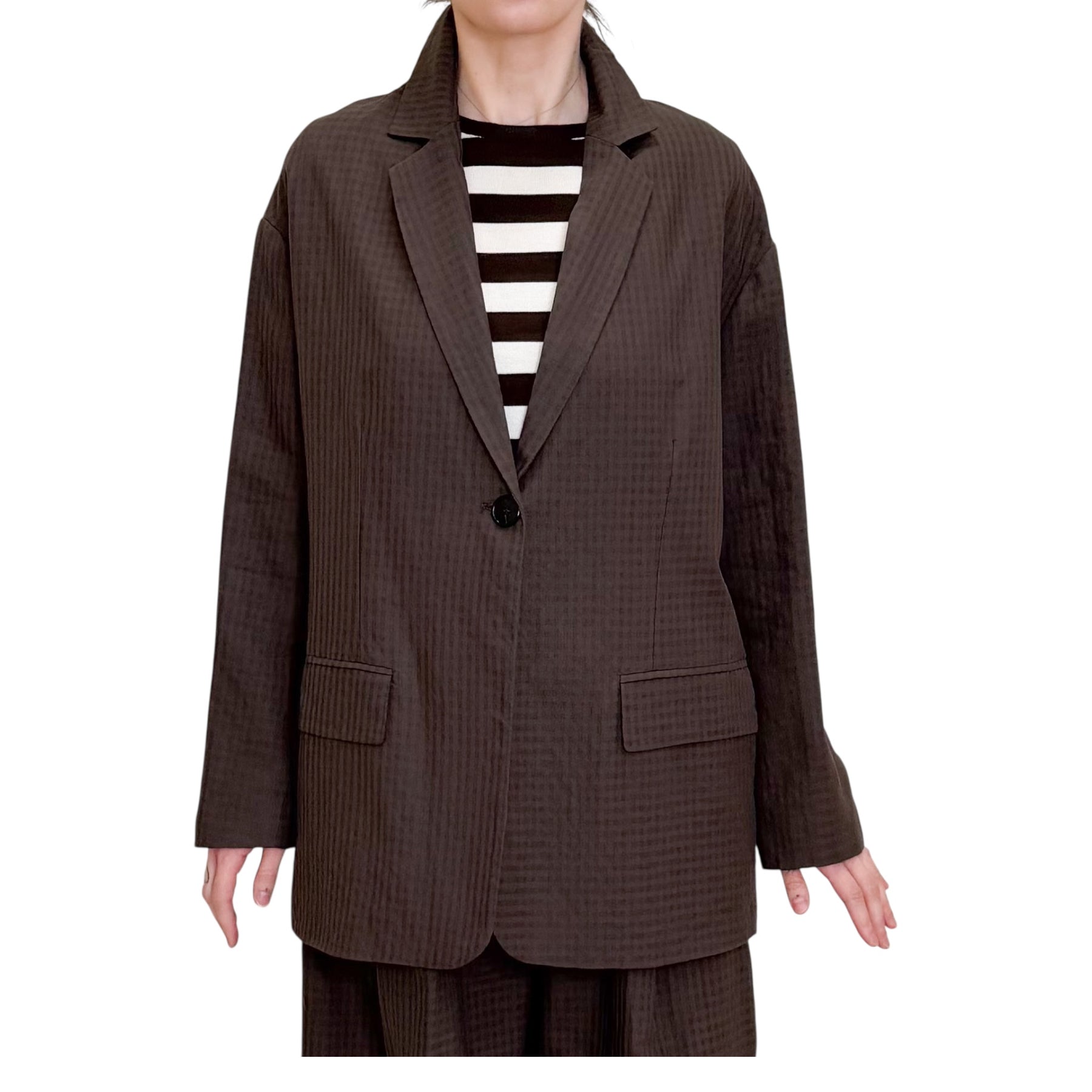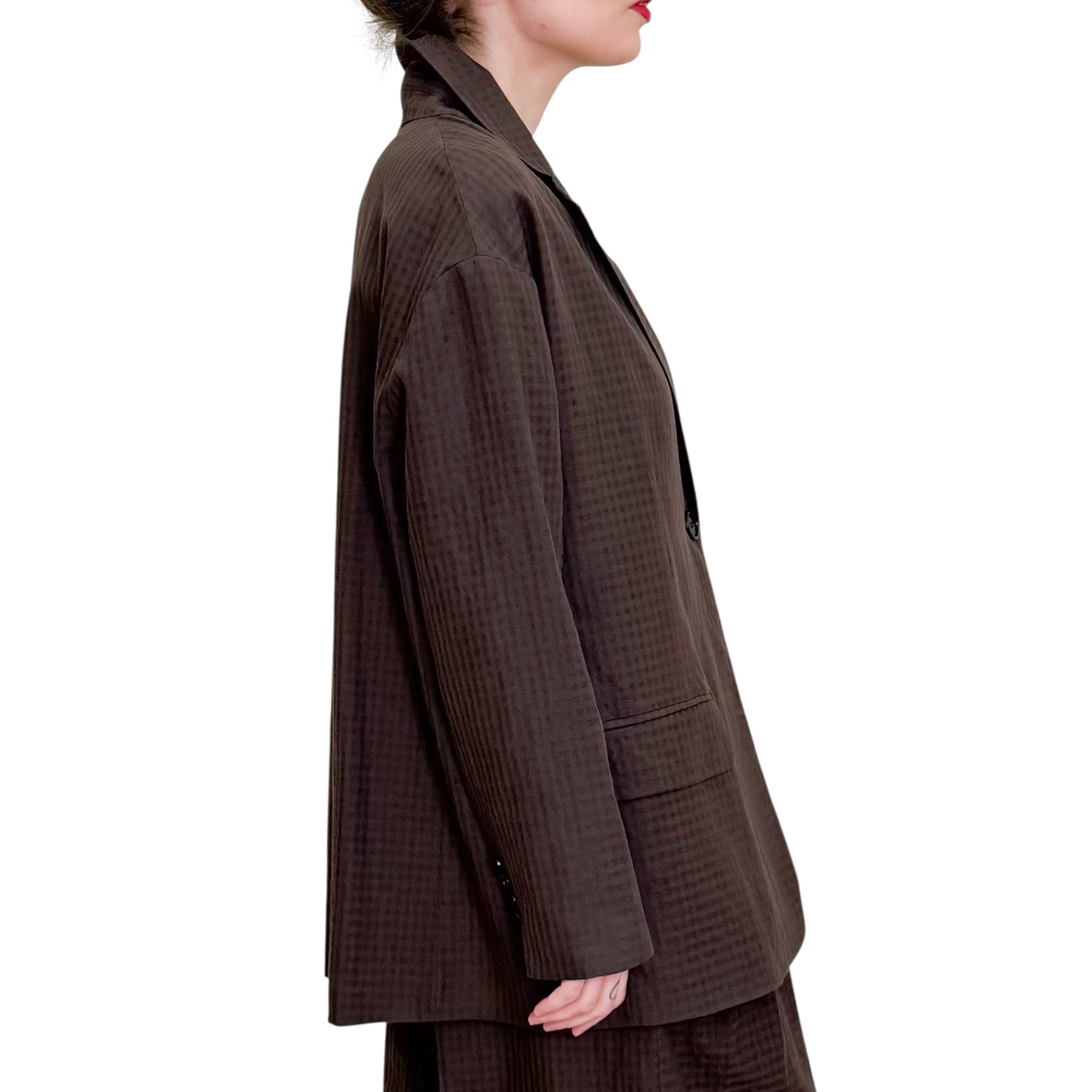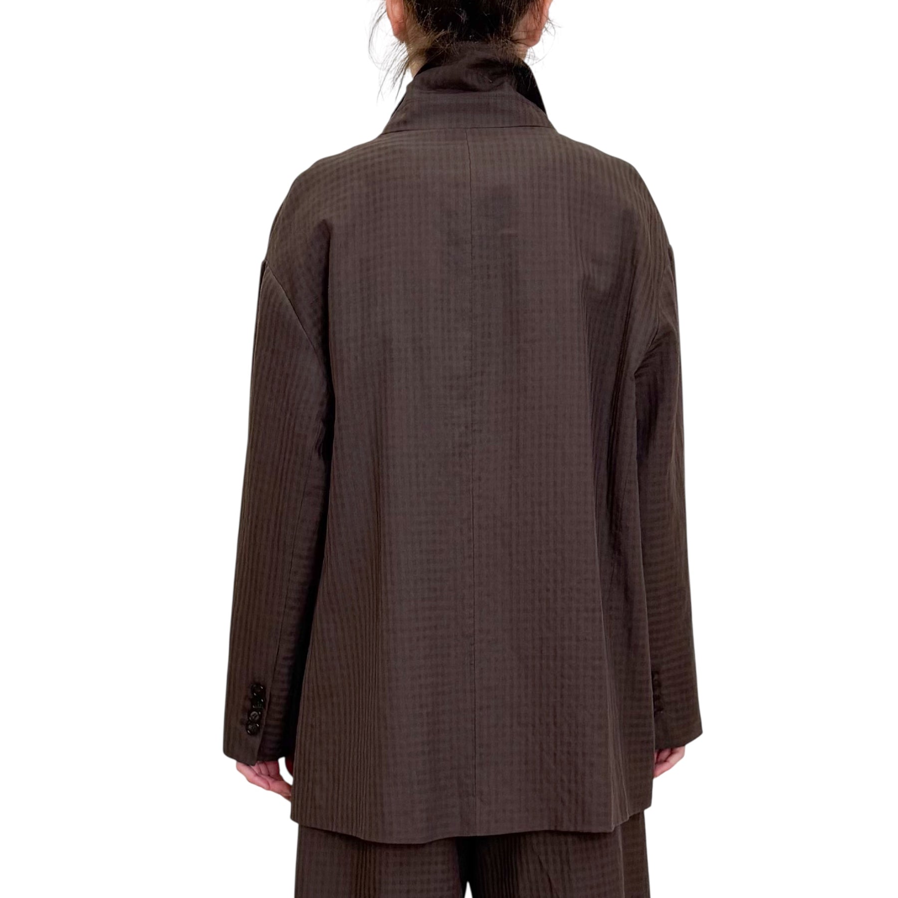 Giacca over un bottone in seersucker di cotone e lino con microcheck tono su tono , manica scesa e tasche .