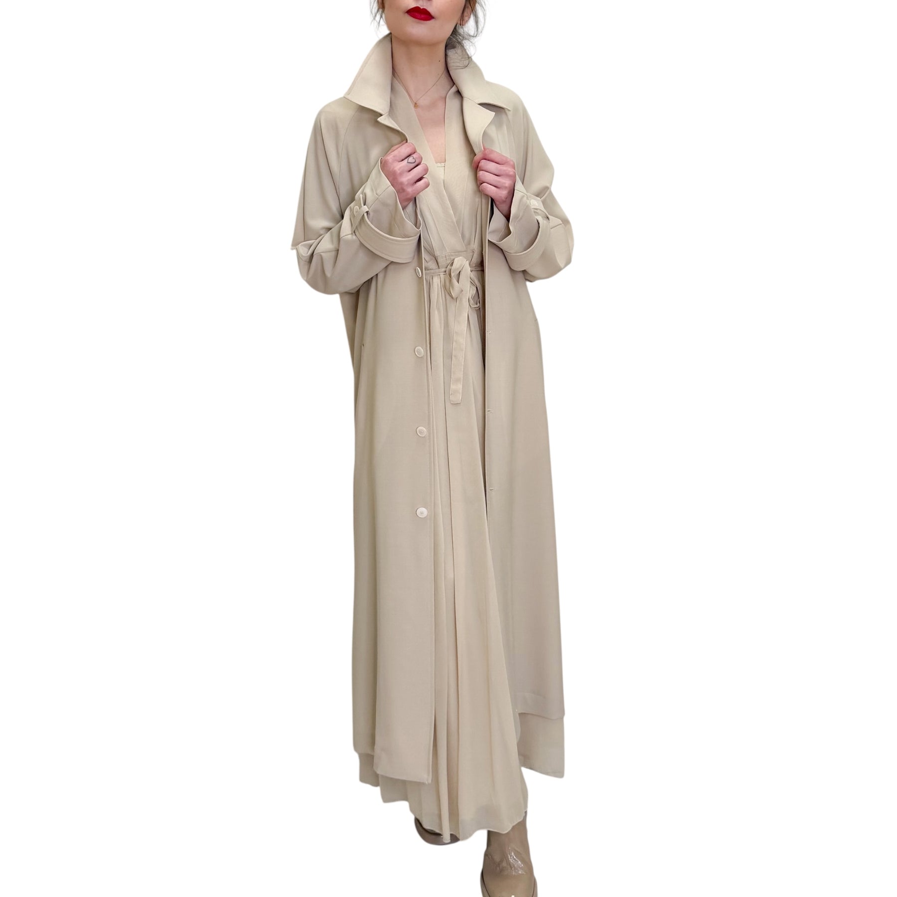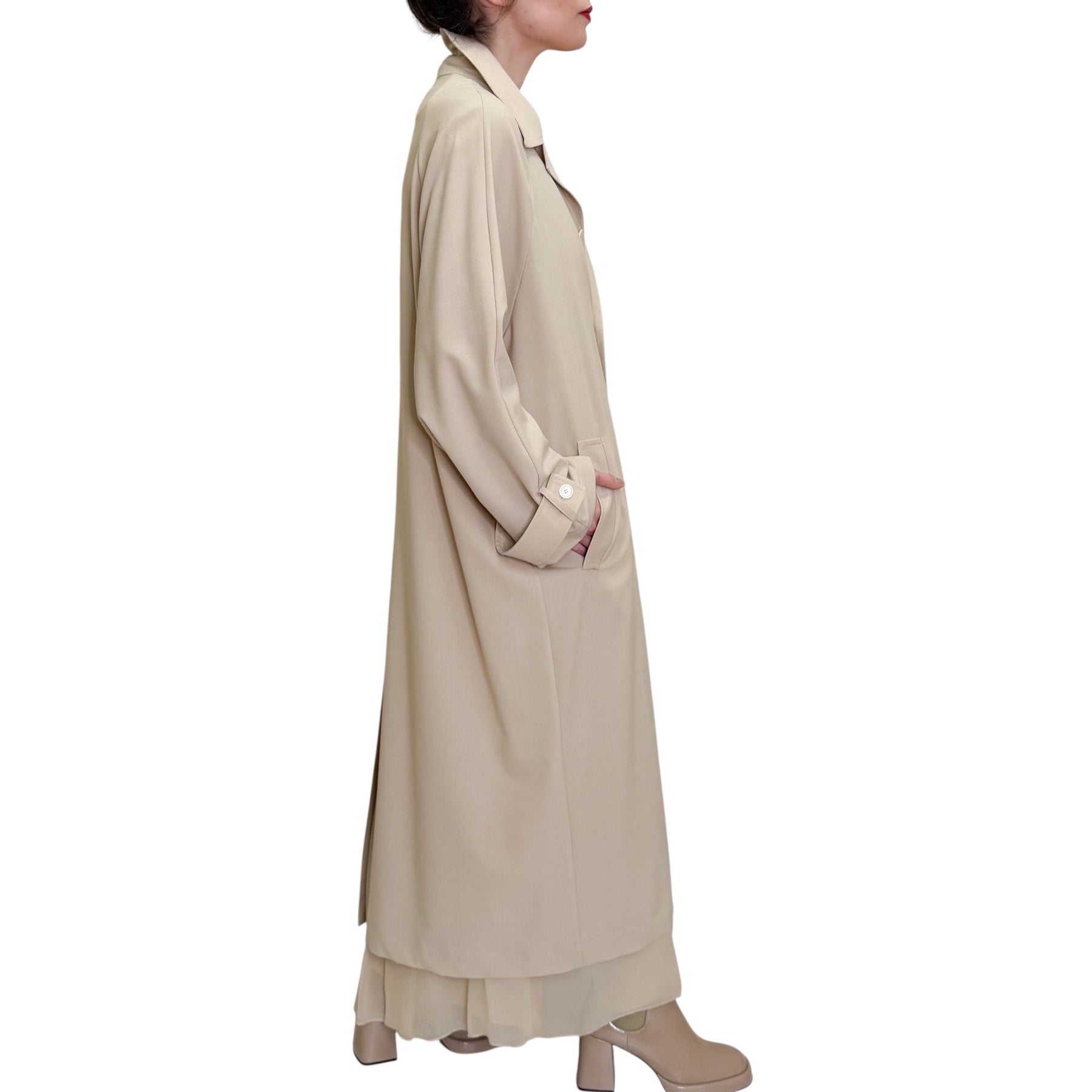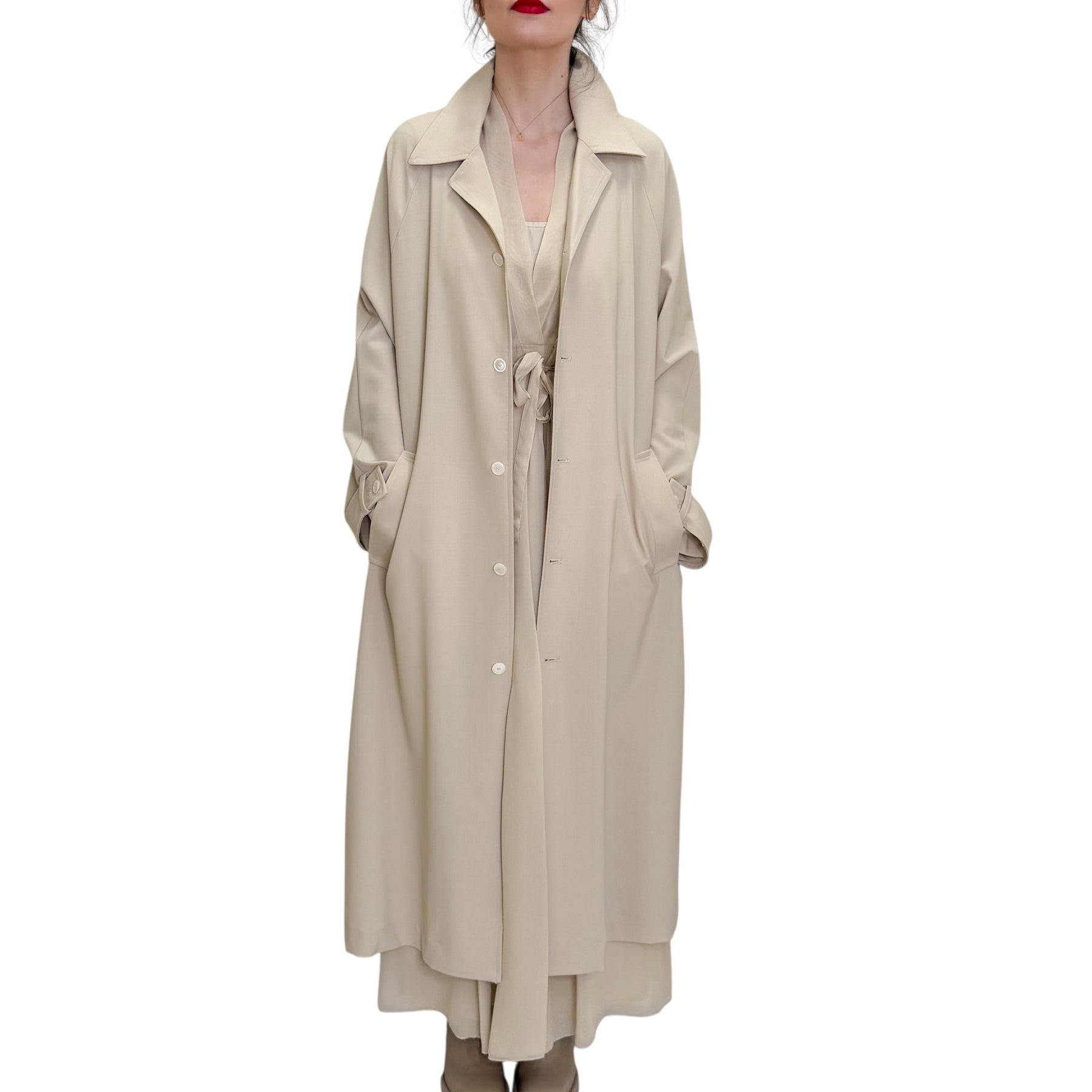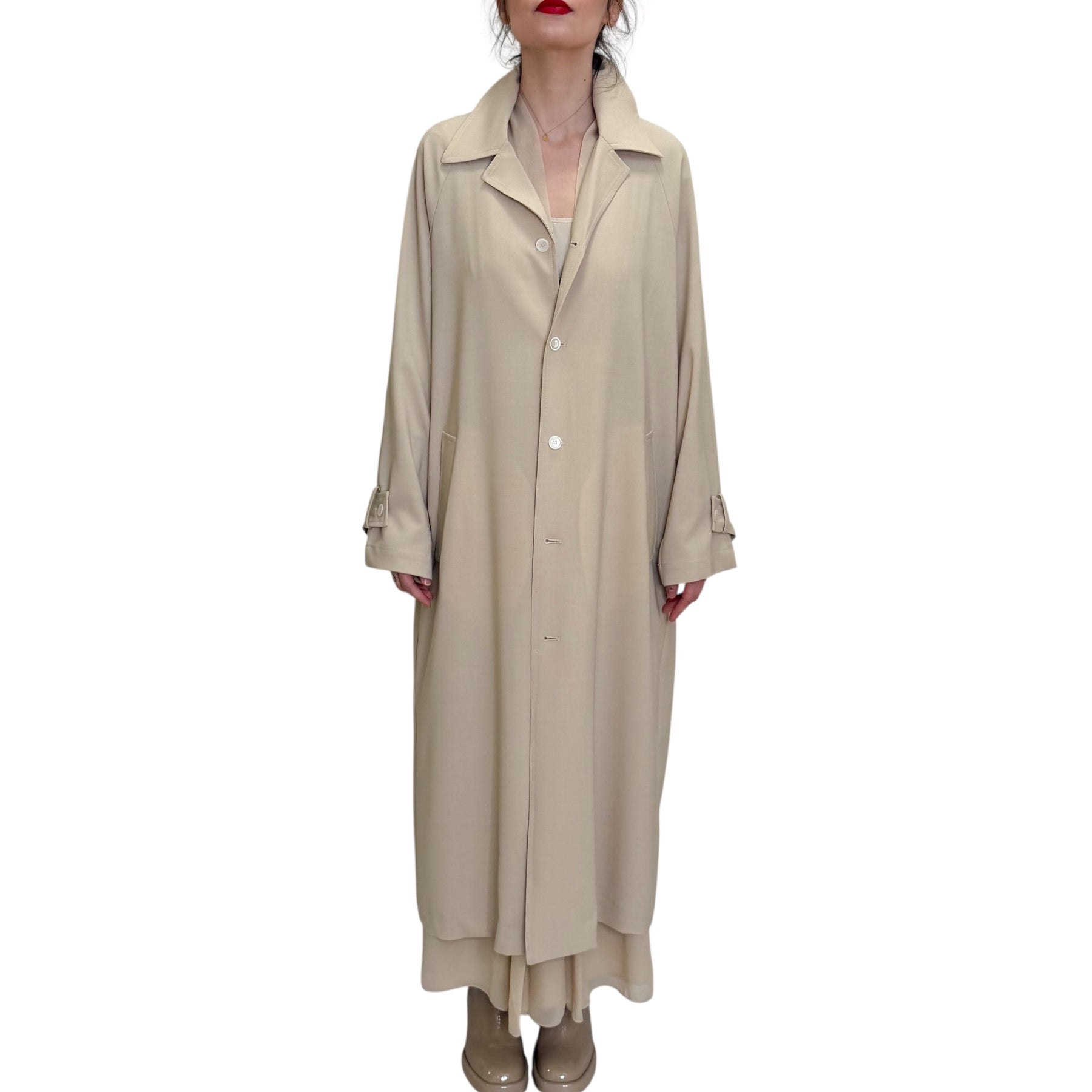 Spolverino over lungo in fresco di lana elasticizzato con allacciatura con bottoni in contrasto , spacco alto nel dietro e tasche .