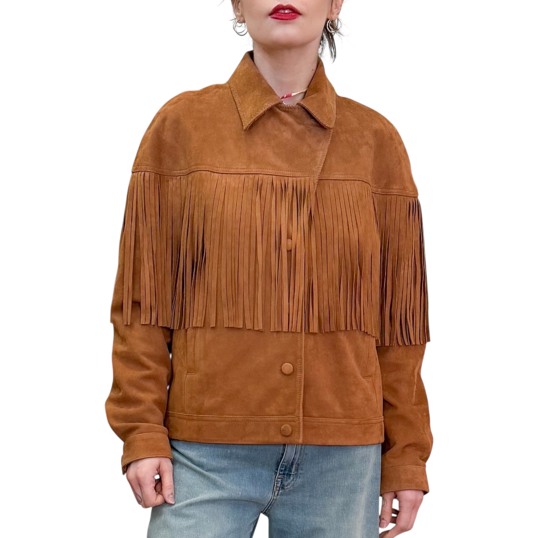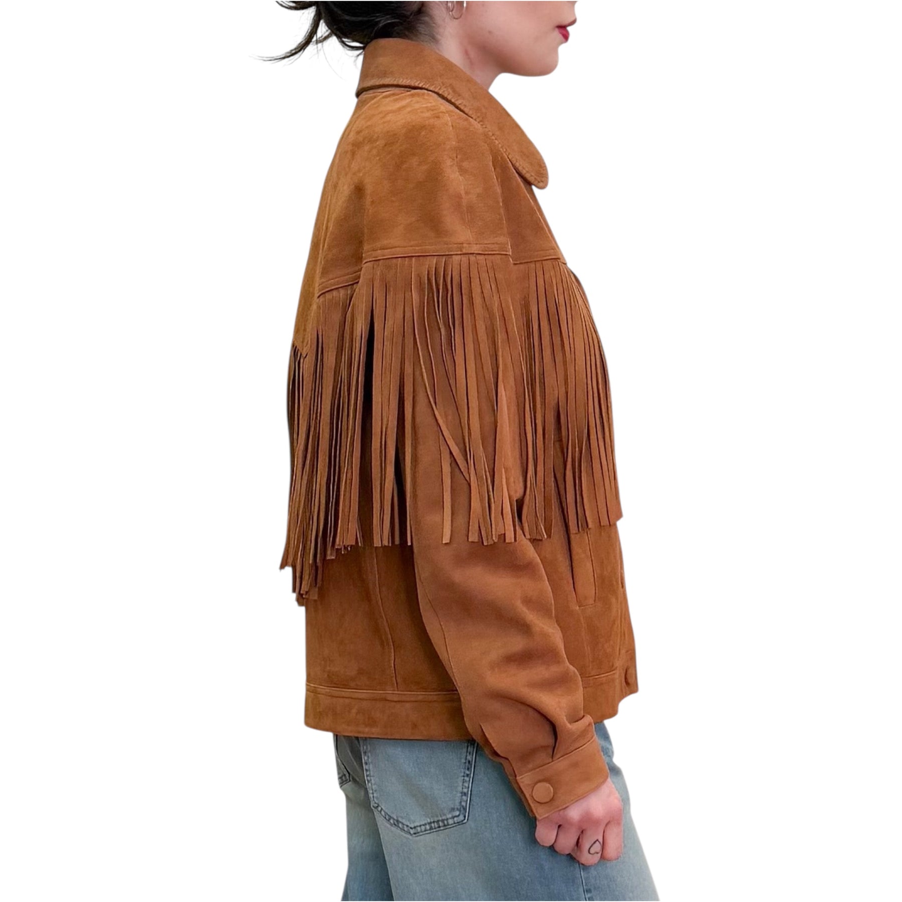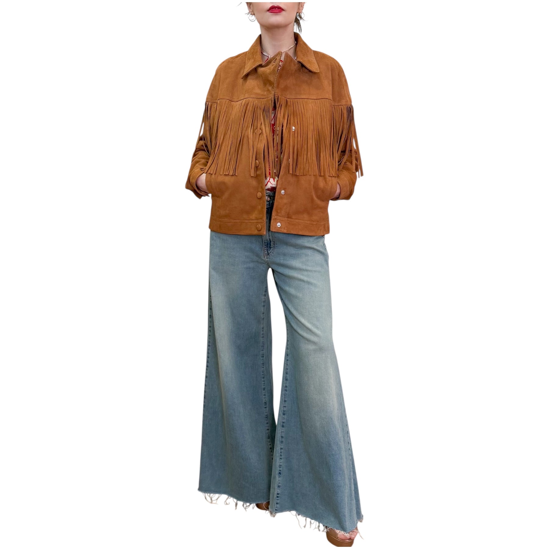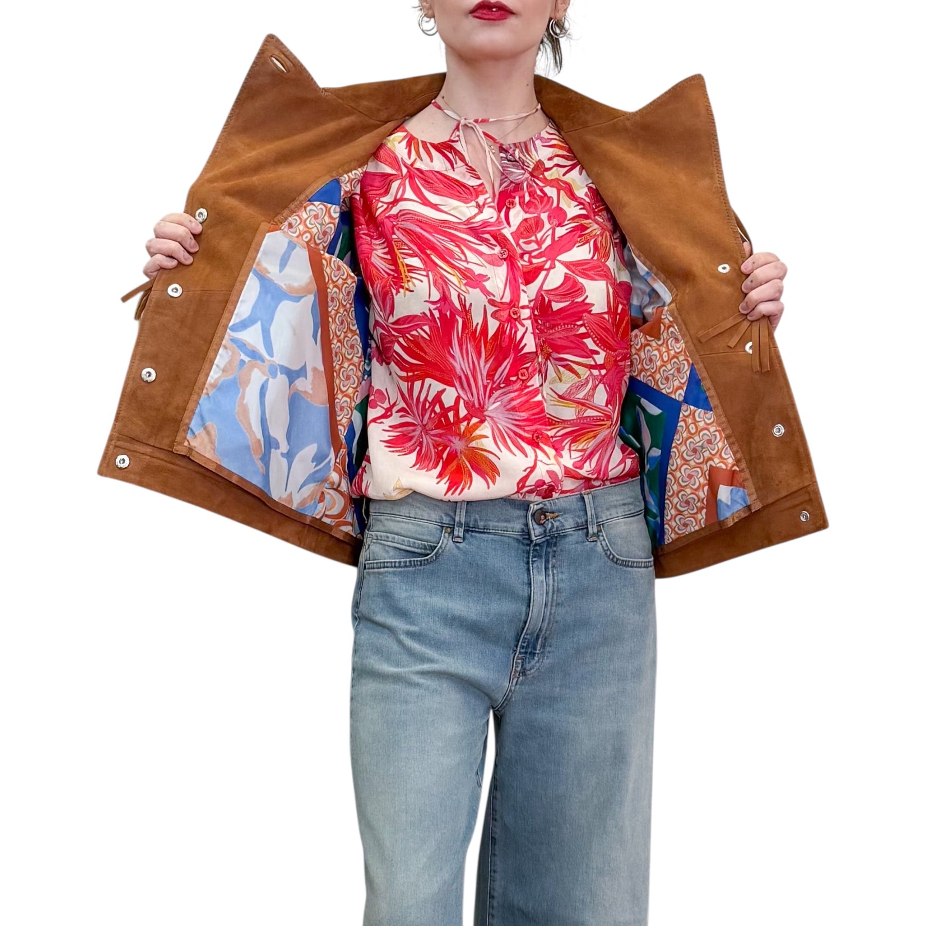 Giacca da motociclista in morbida pelle scamosciata con lunghe frange sul carré anteriore e posteriore , chiusuta con bottoni a pressione rivestiti in pelle e possibilità di doppia chiusura sul collo , fodera con un patchwork di stampe di stagione.