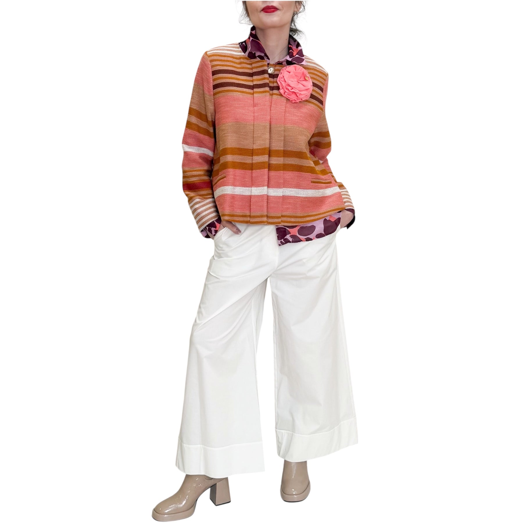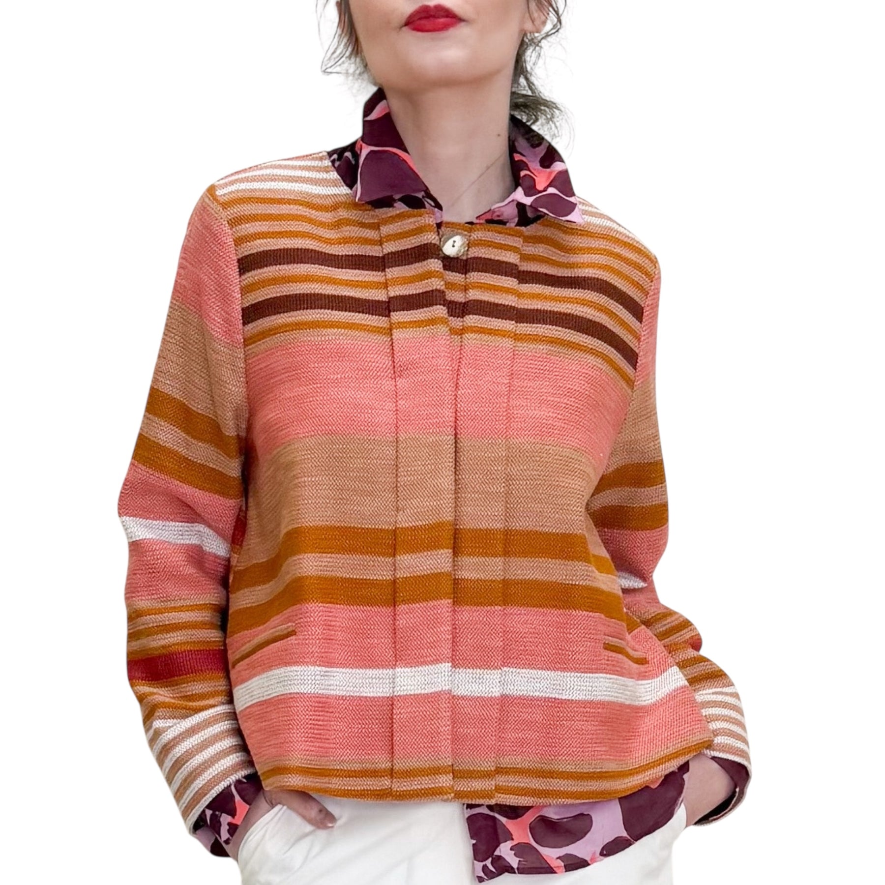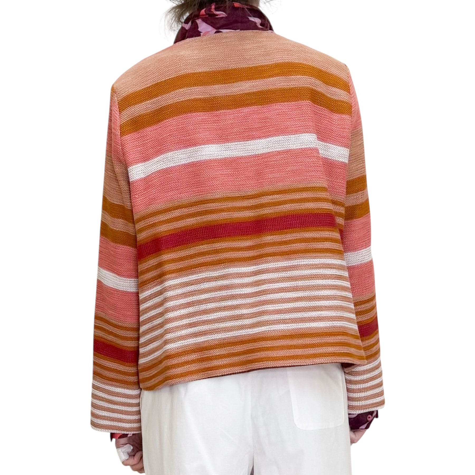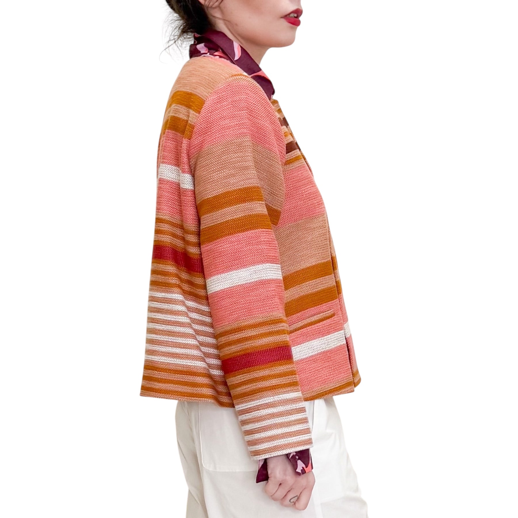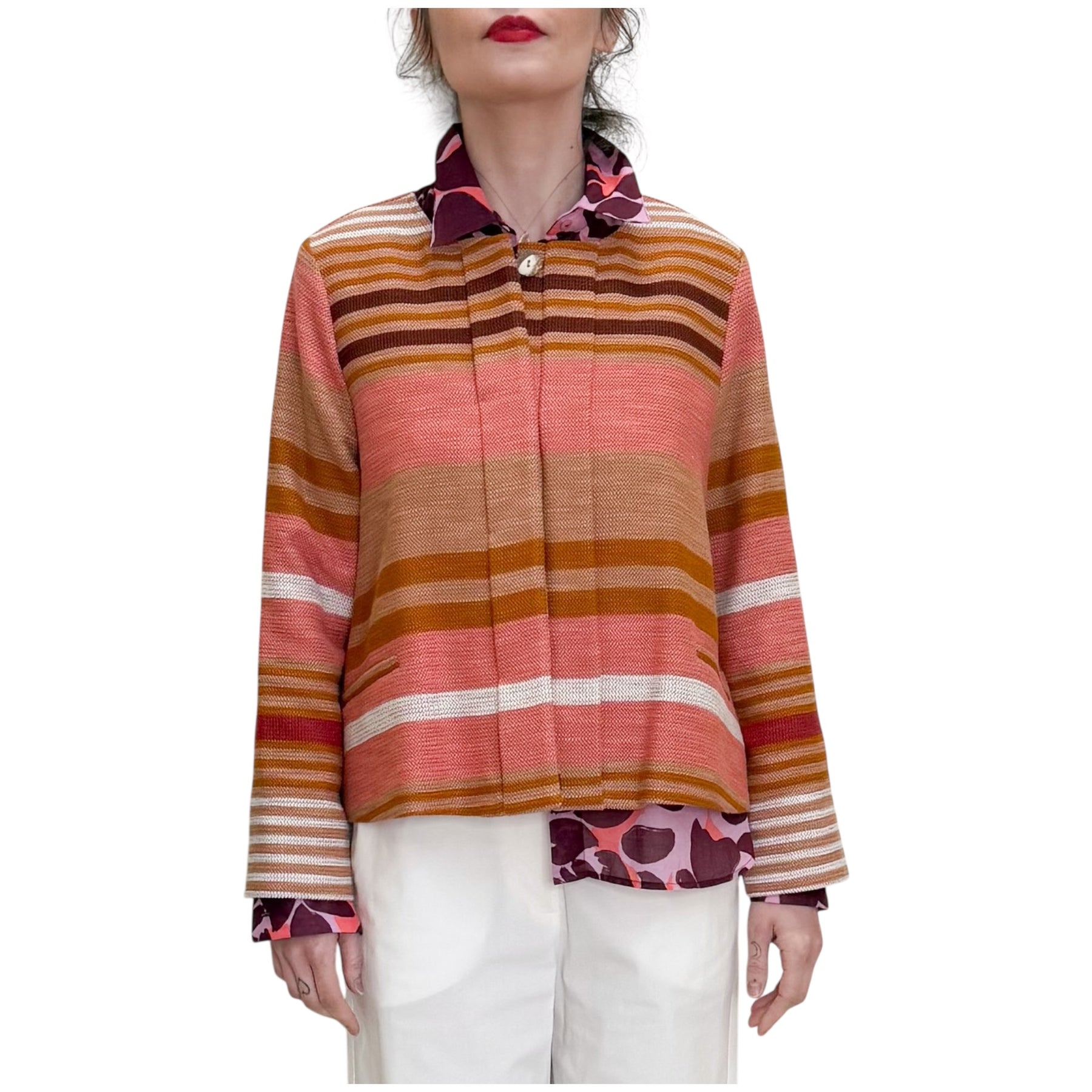 Giacca girocollo con linea a scatola in stuoia di cotone , viscosa e poliestere con motivo jacquard a righe multicolor, allacciatura nascosta e tasche .