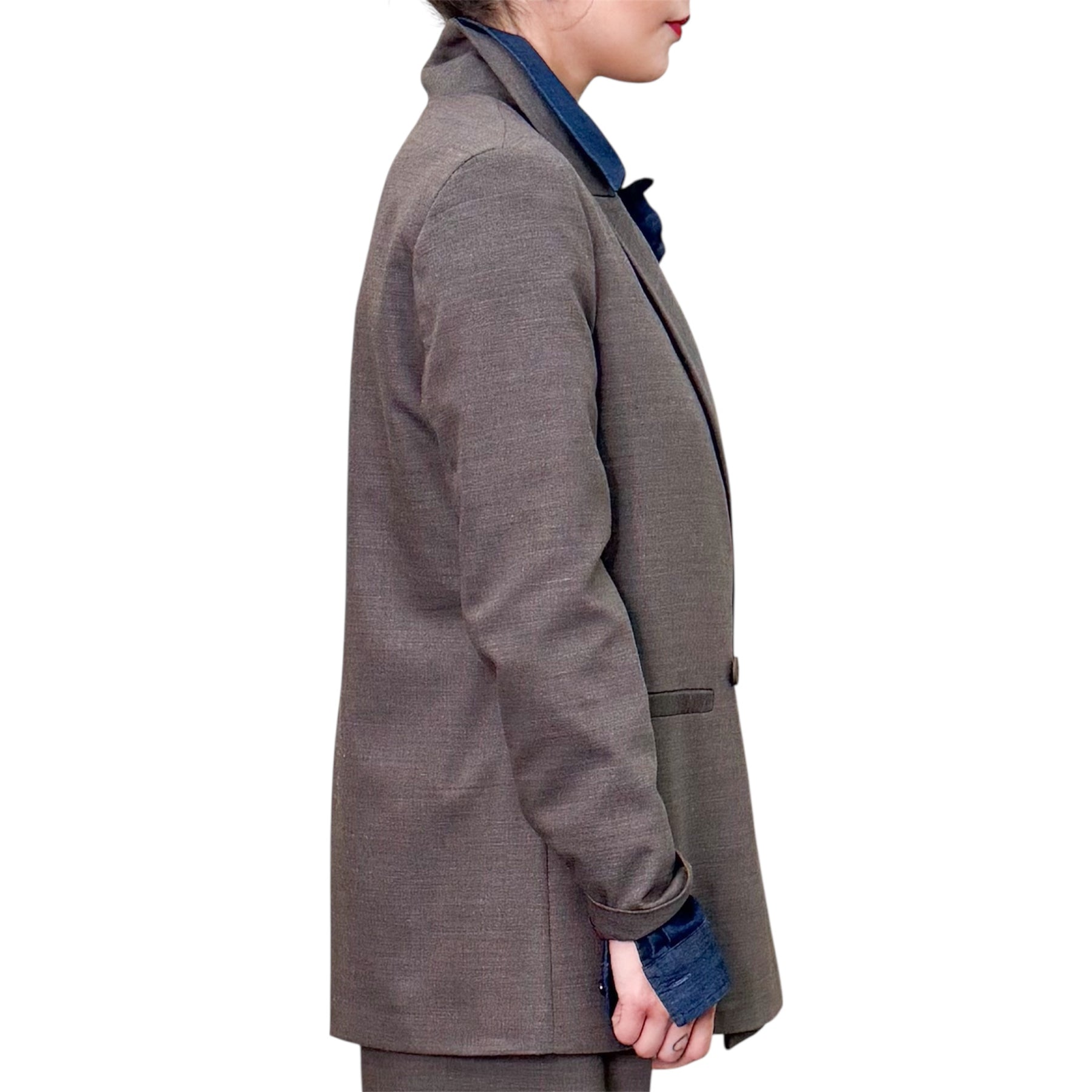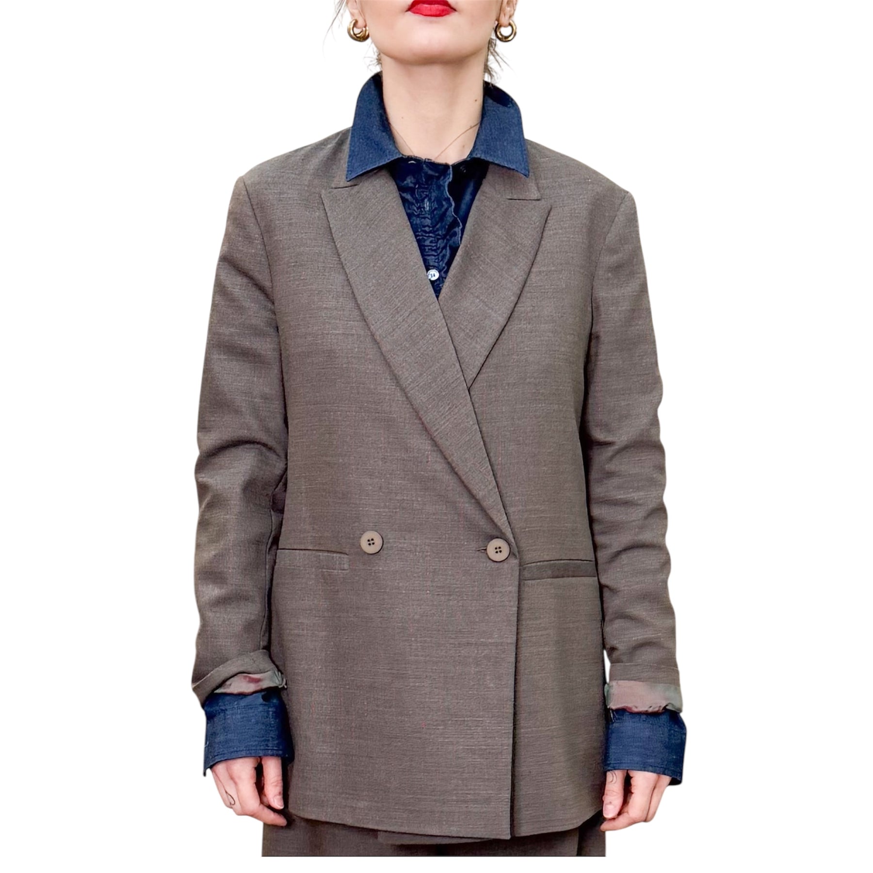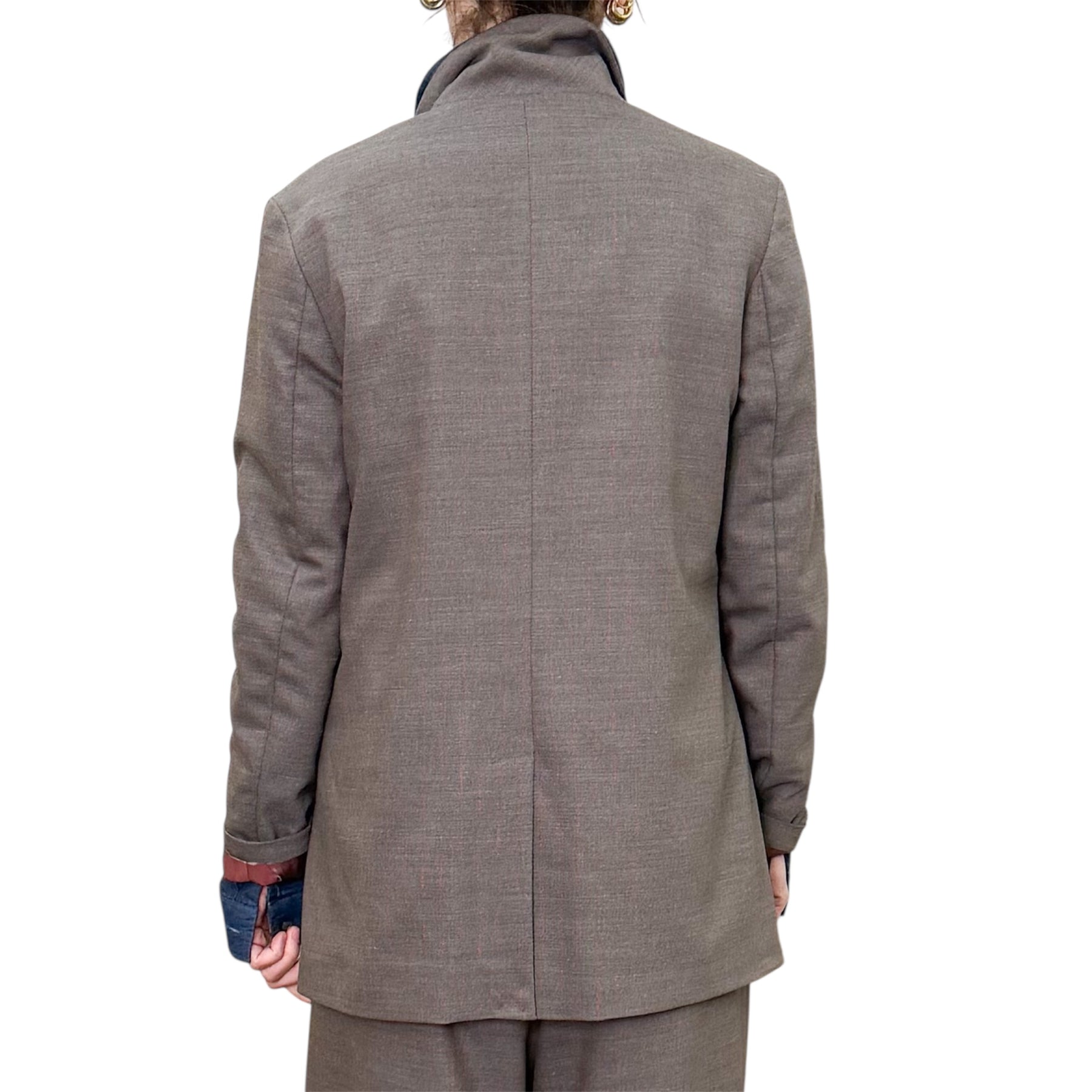 Giacca doppiopetto con linea morbida in staglia di lana, viscosa , iliestere ed elastam color nocciola con gessatura bordeaux con spacco nel centro dietro e tasche .