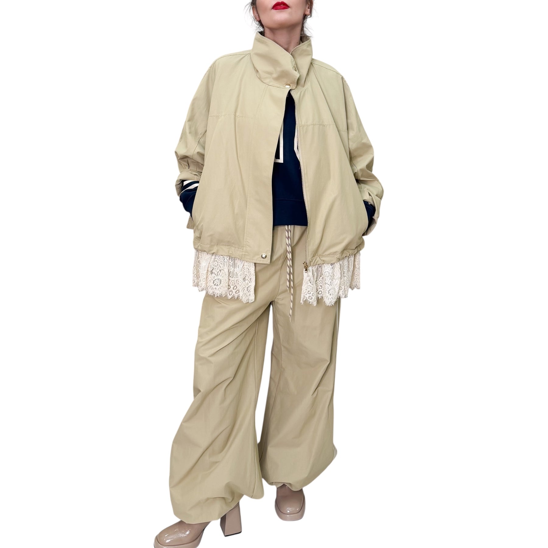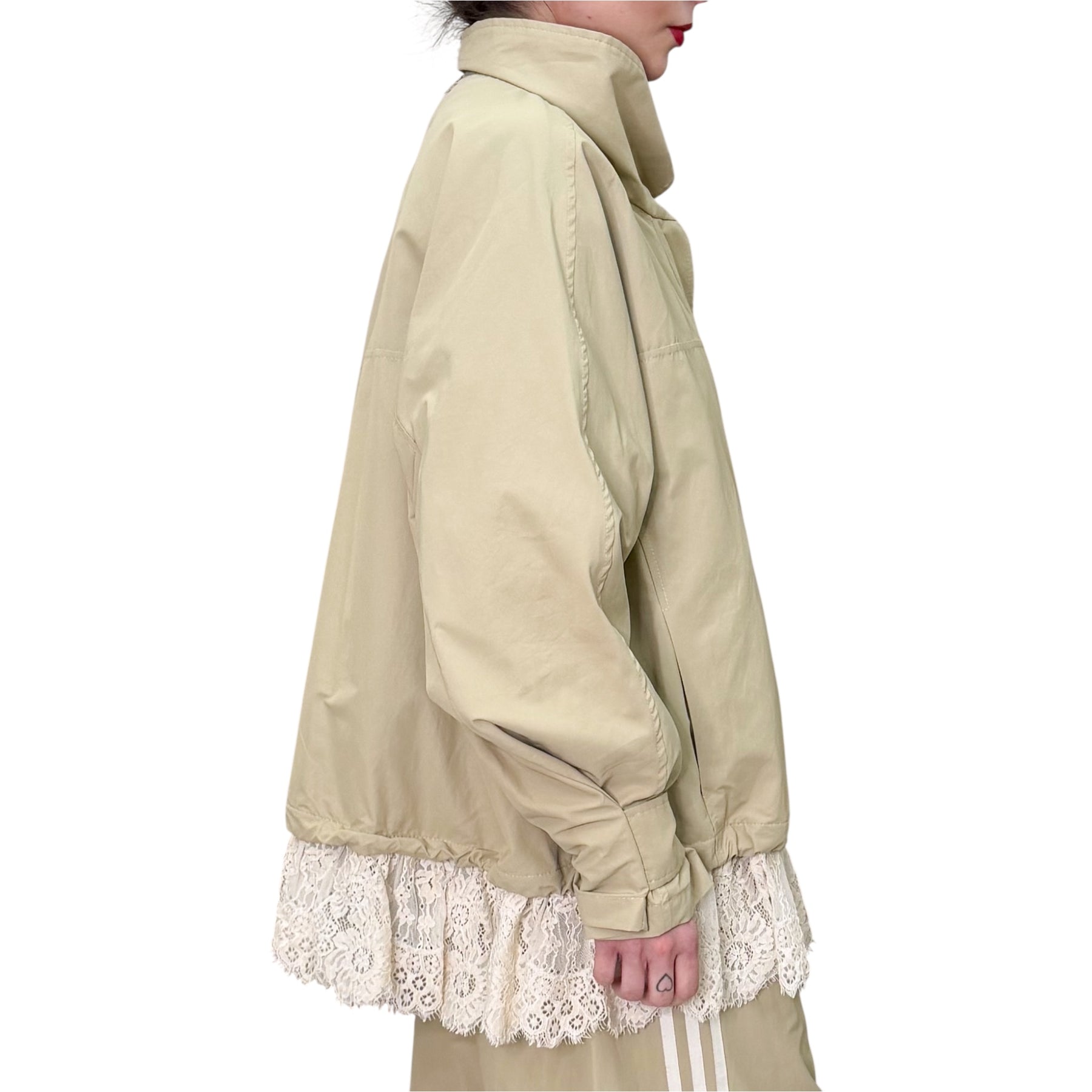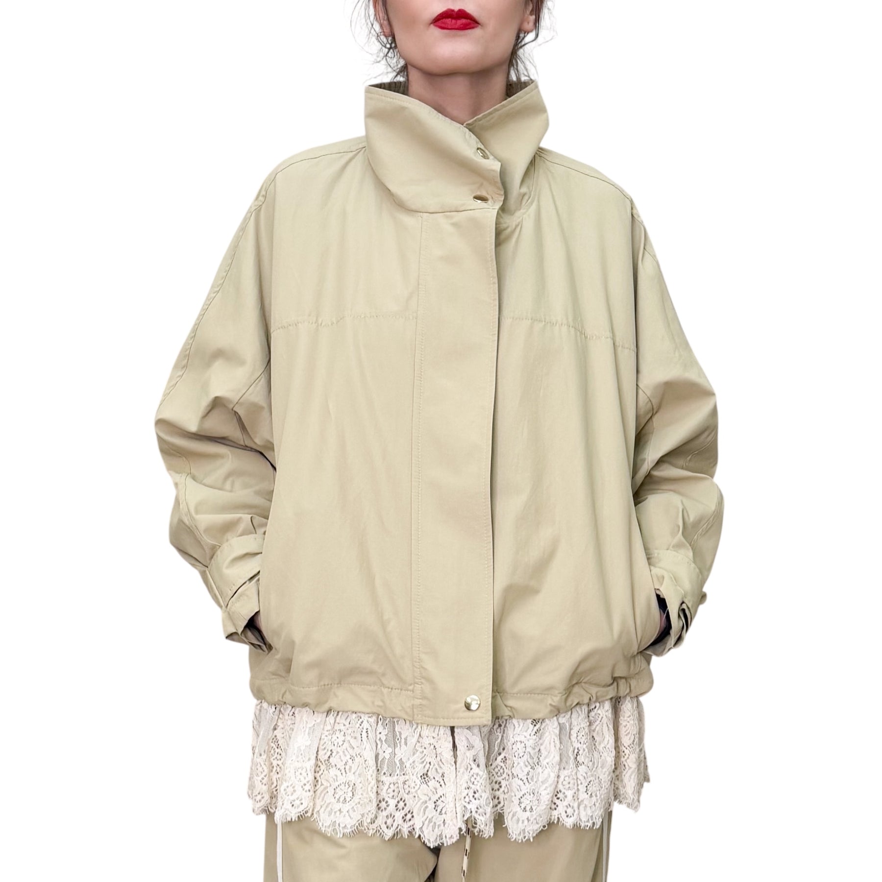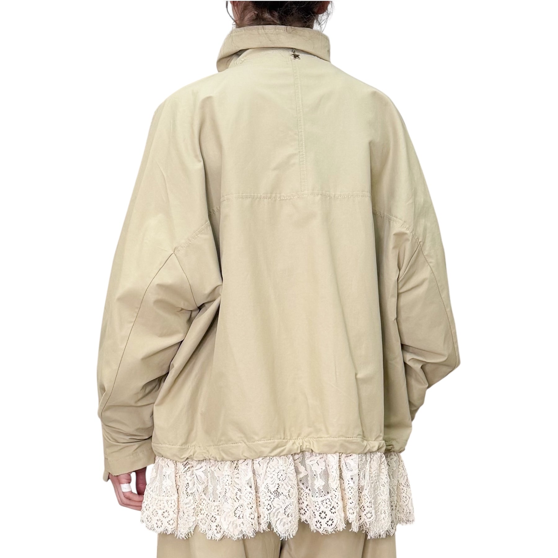 Giubbotto in tessuto tecnico di cotone e nylon con linea over , allacciatura con zip e bordo in pizzo .