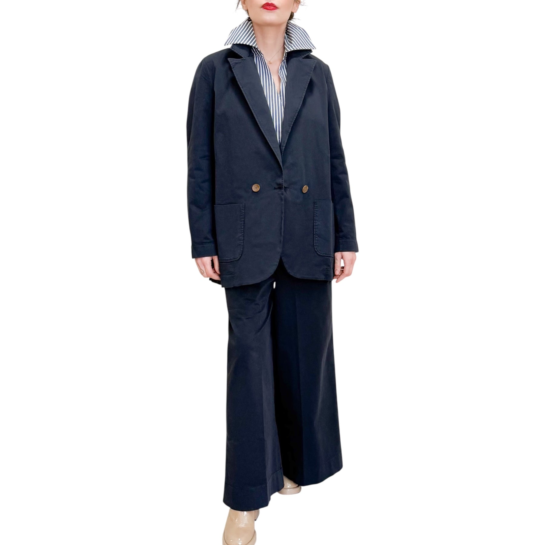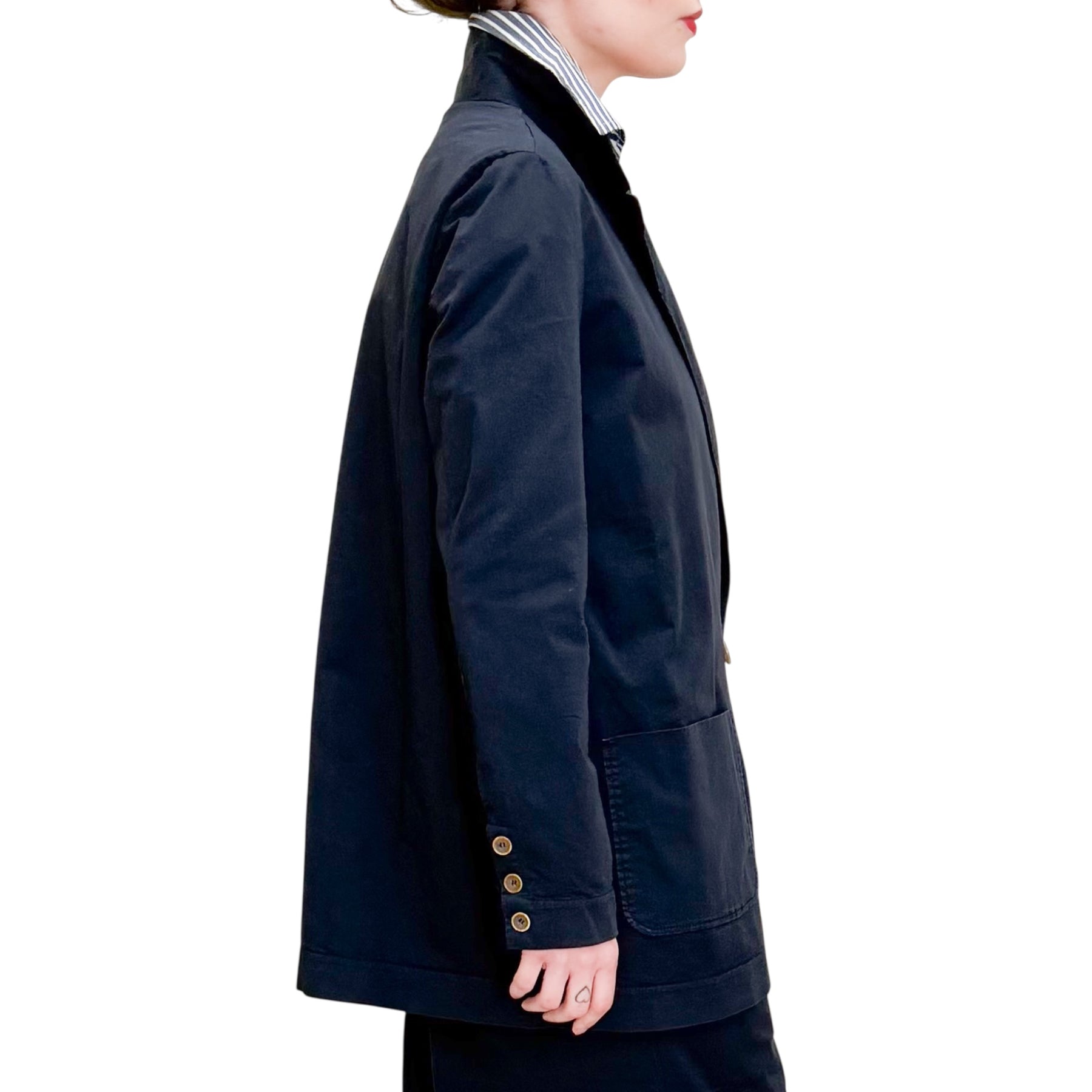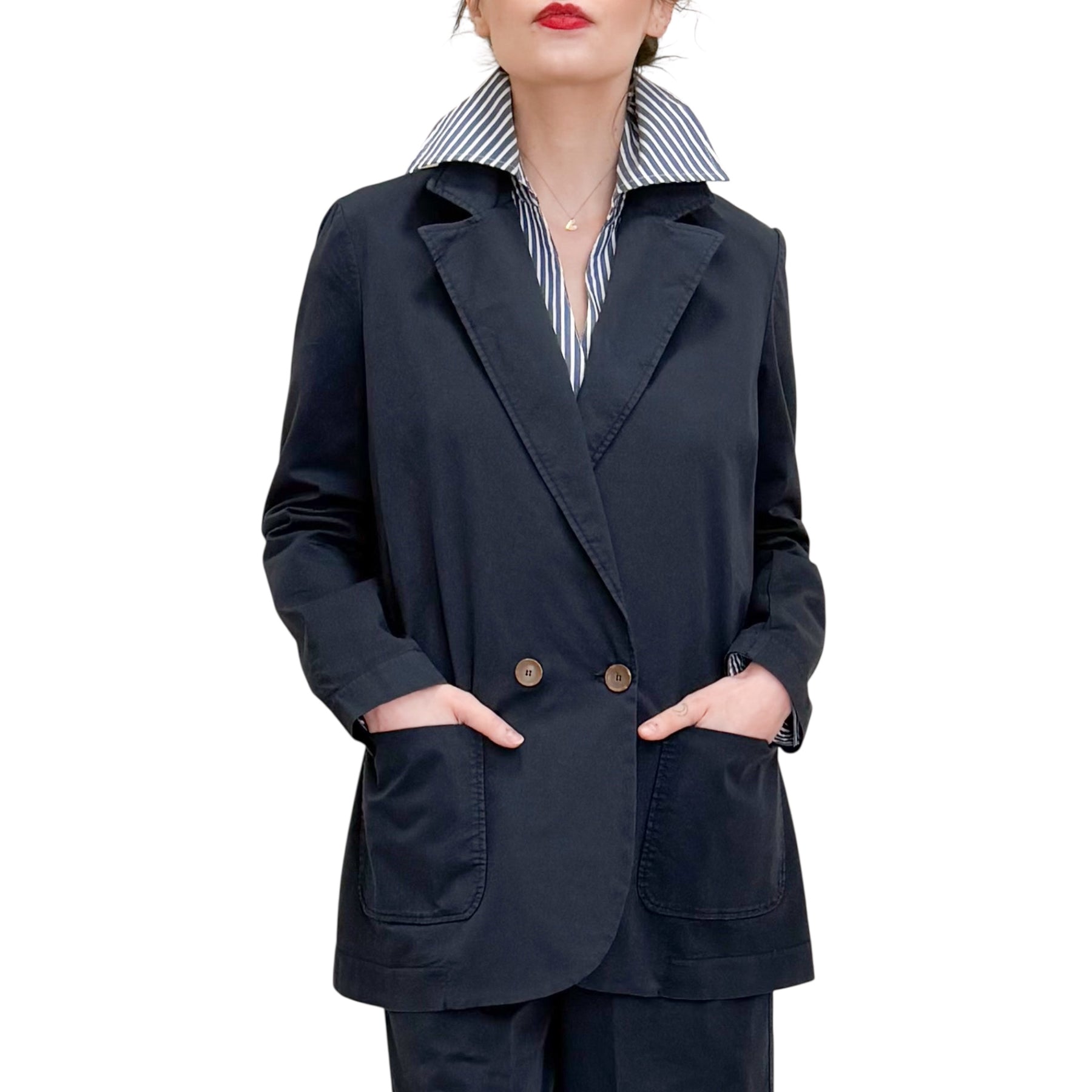 Giacca doppiopetto con linea over in gabardine di cotone con spacco centrale nel dietro e tasche .