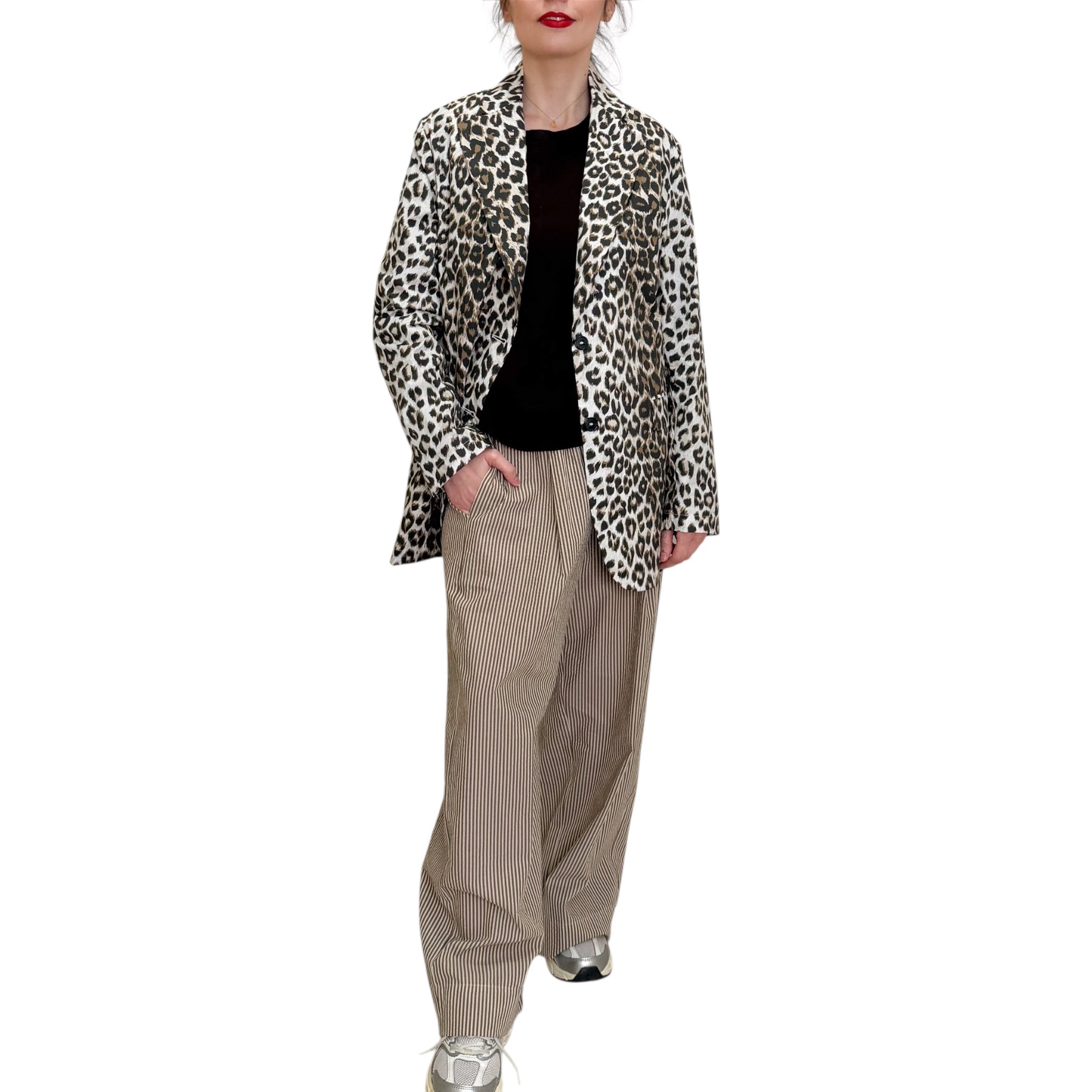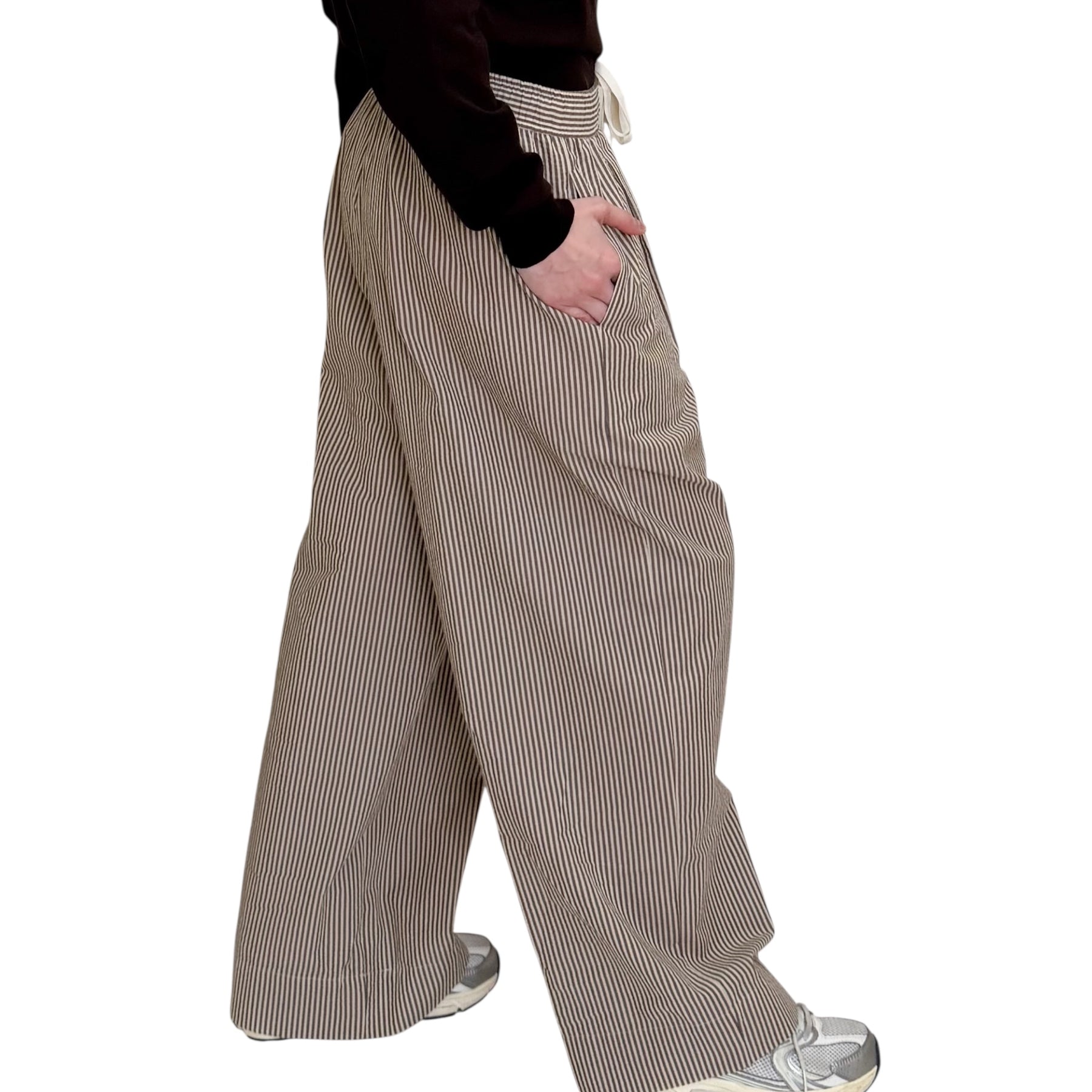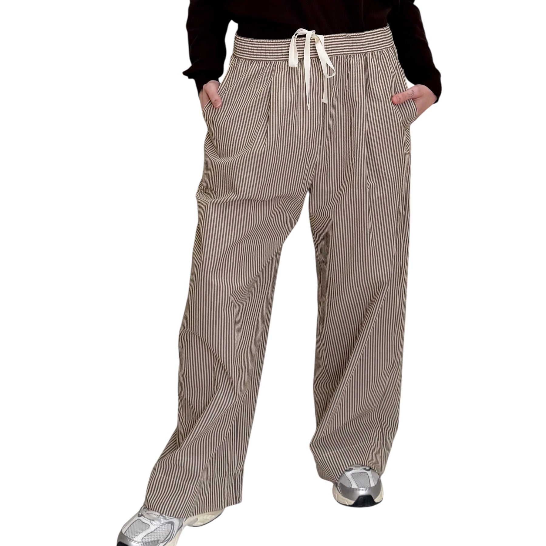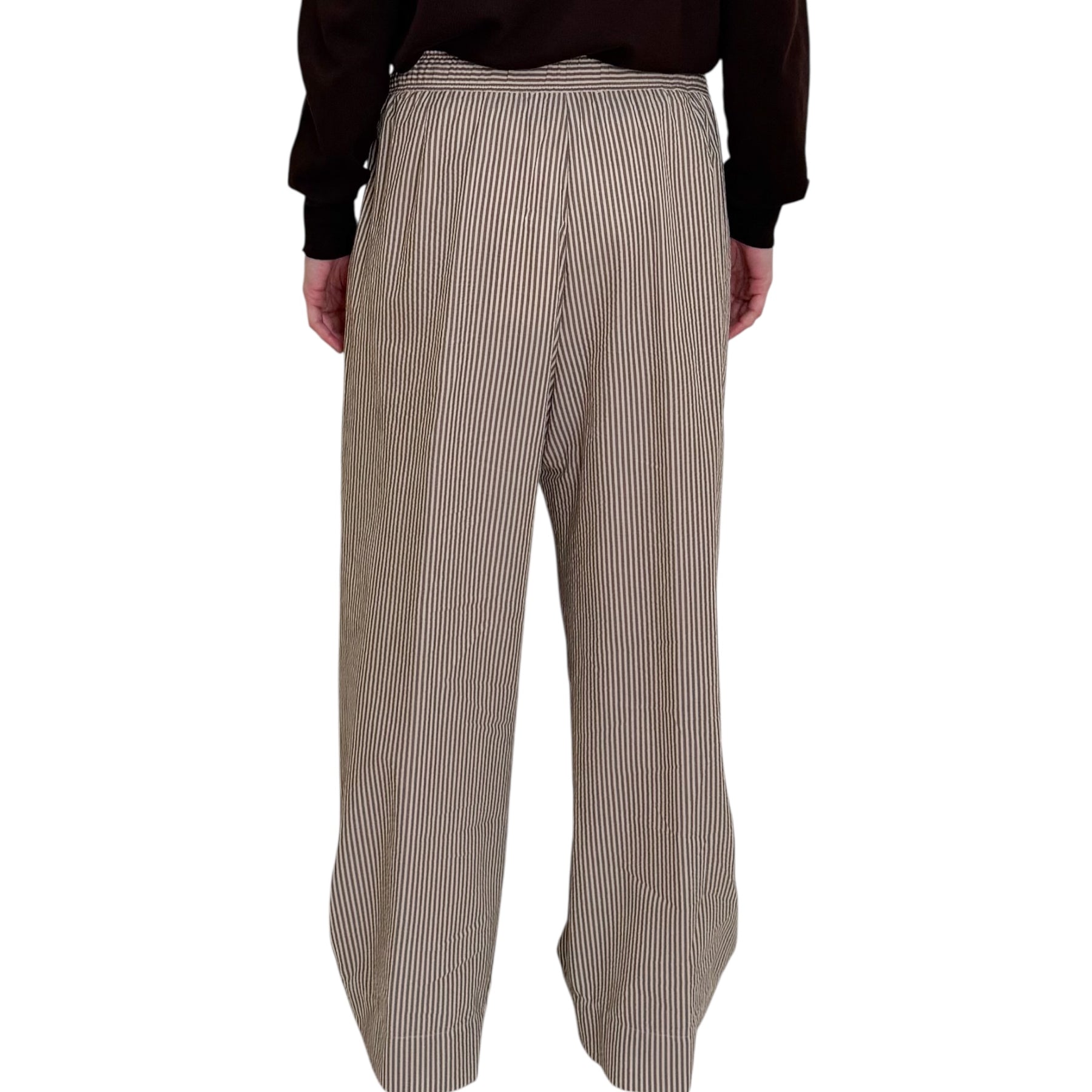 Pantaloni larghi con Pinces in cotone seersucker a righe almond e caffè con tasche e elastico in vita con coulisse.