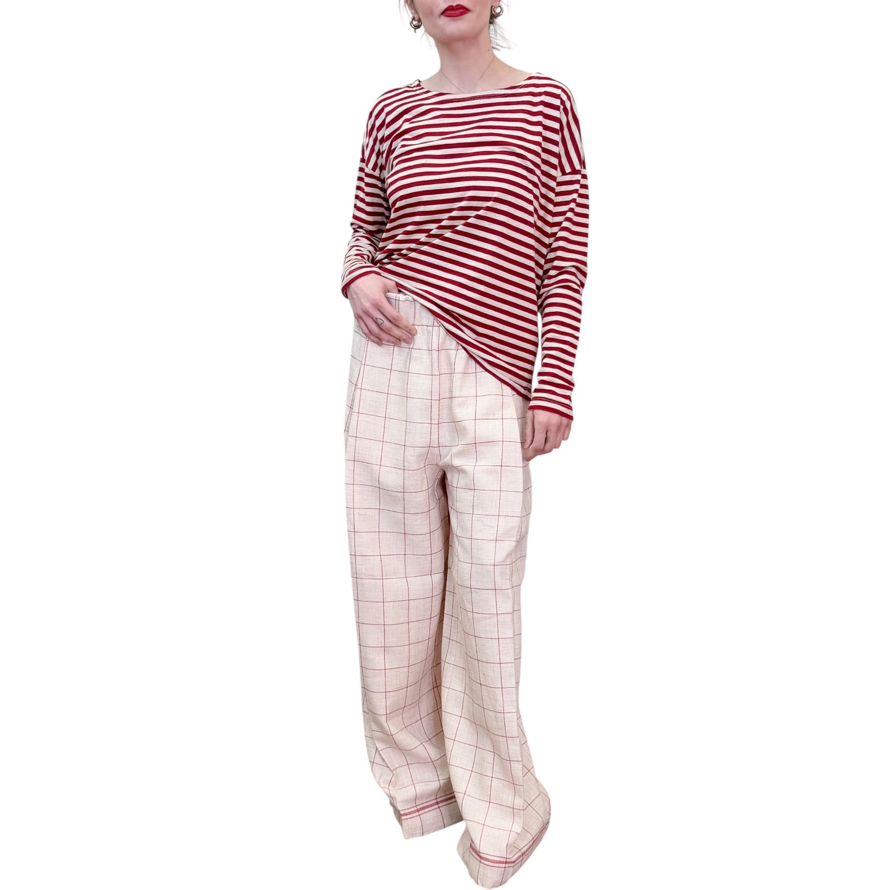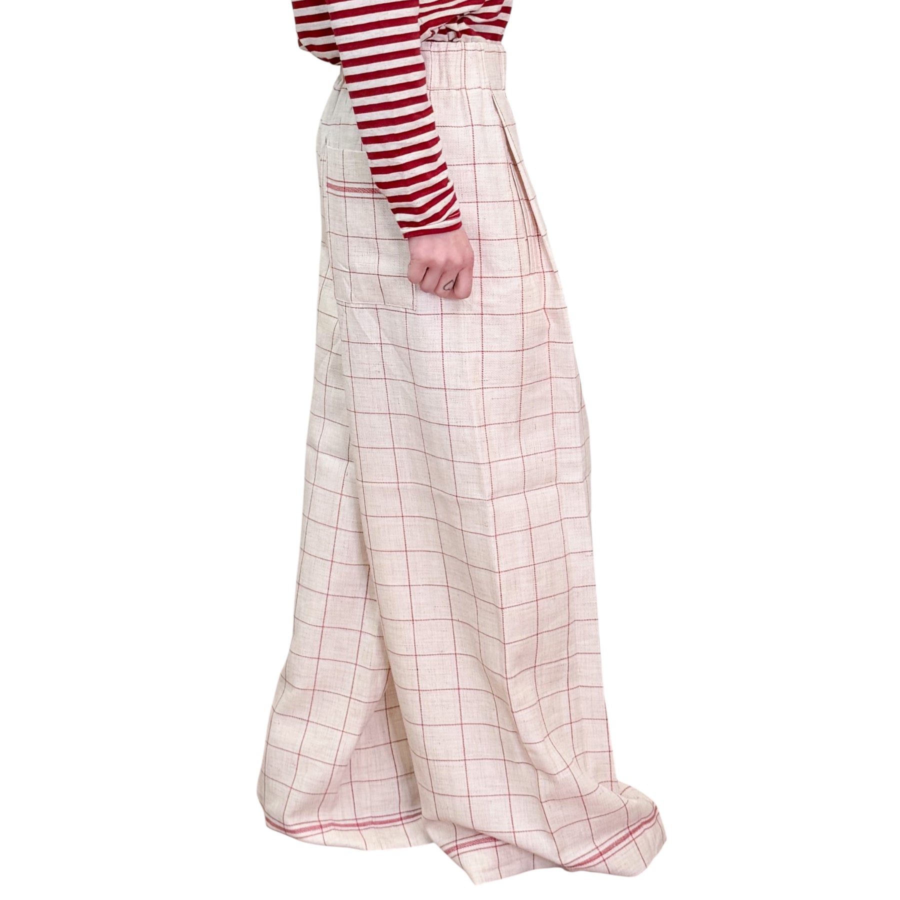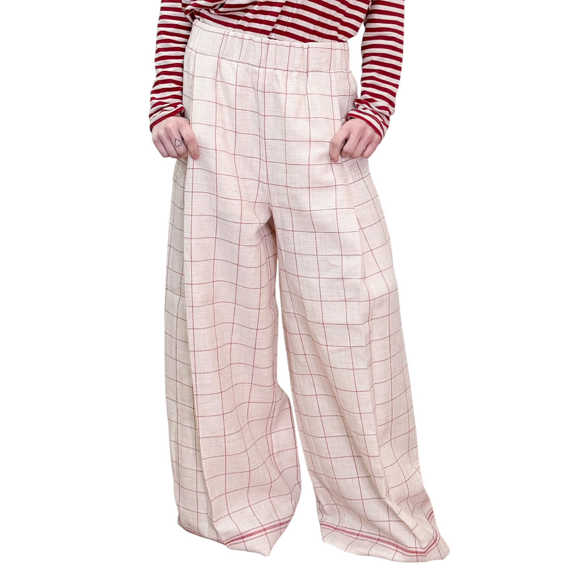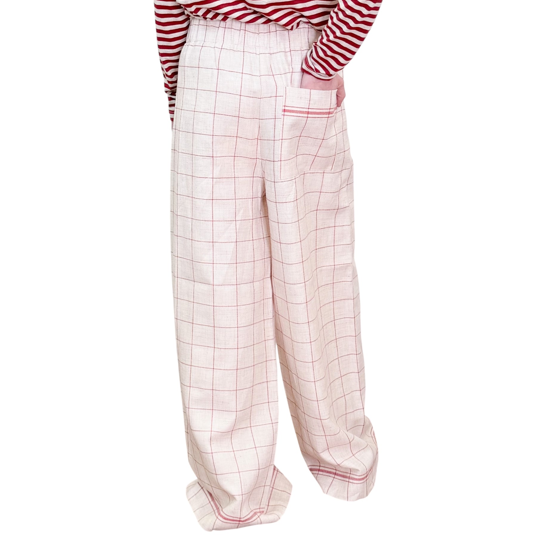 Pantaloni palazzo in stuoia di lino e cotone check naturale e rosso con Pinces piatta , tasca ed elastico in vita .
