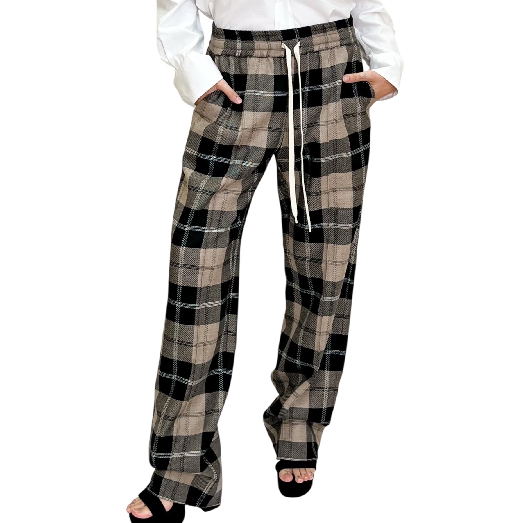 Pantaloni diritti in lana , cotone e acrilico con check neri e beige , elastico in vita con coulisse e tasche .
