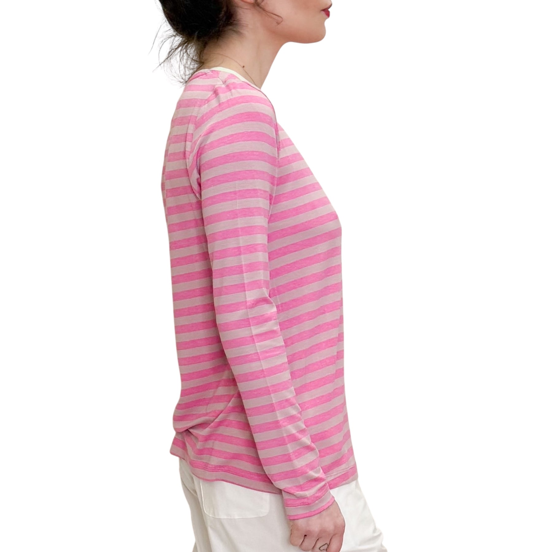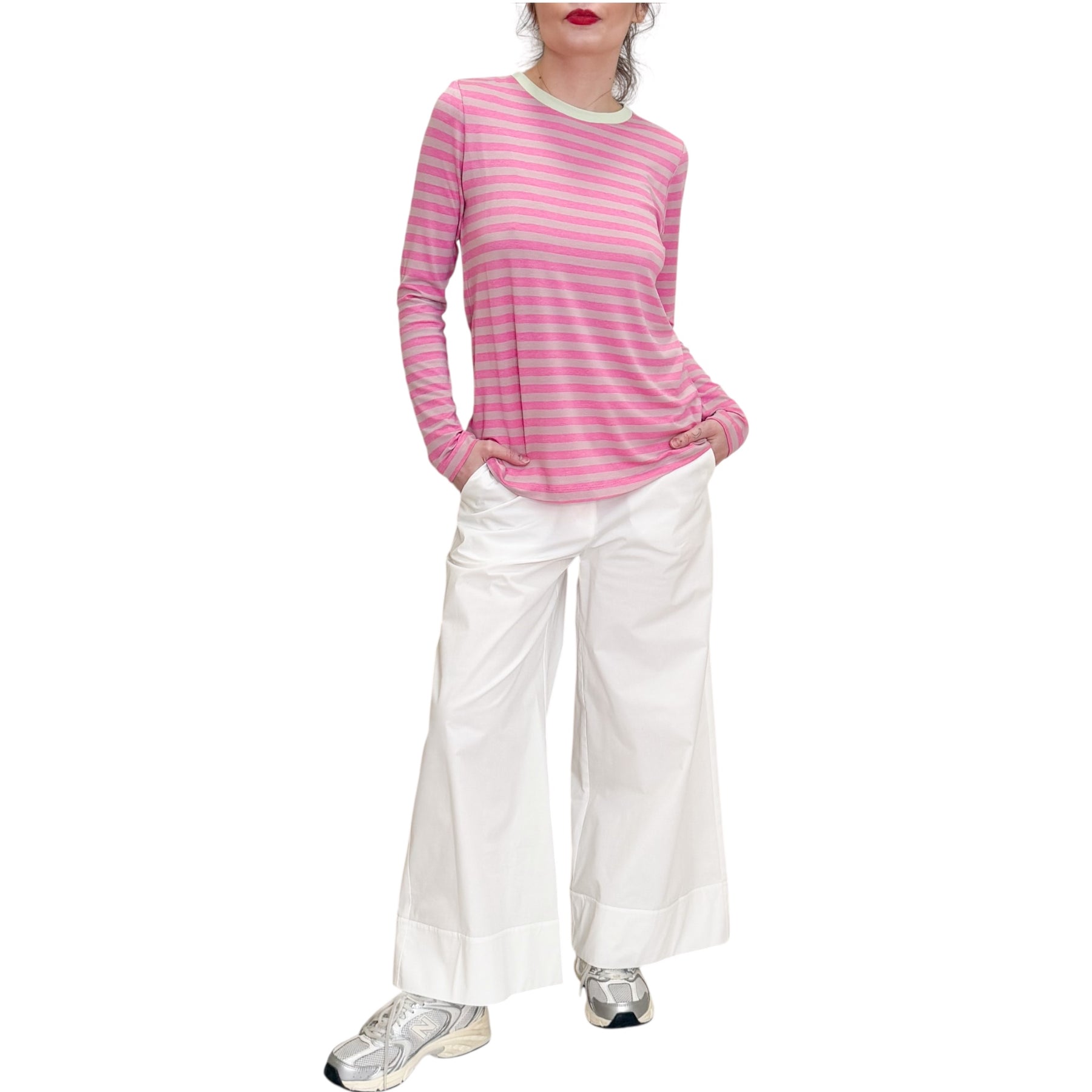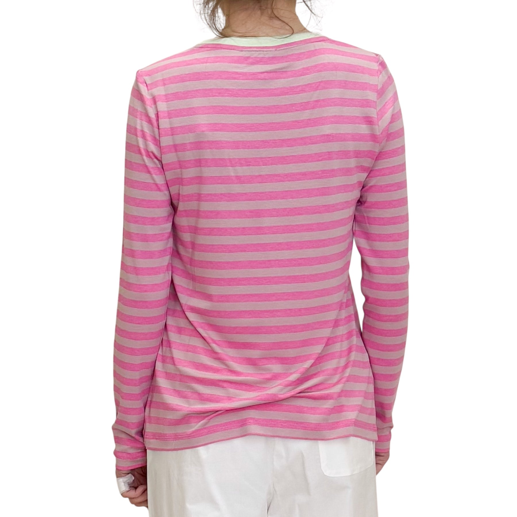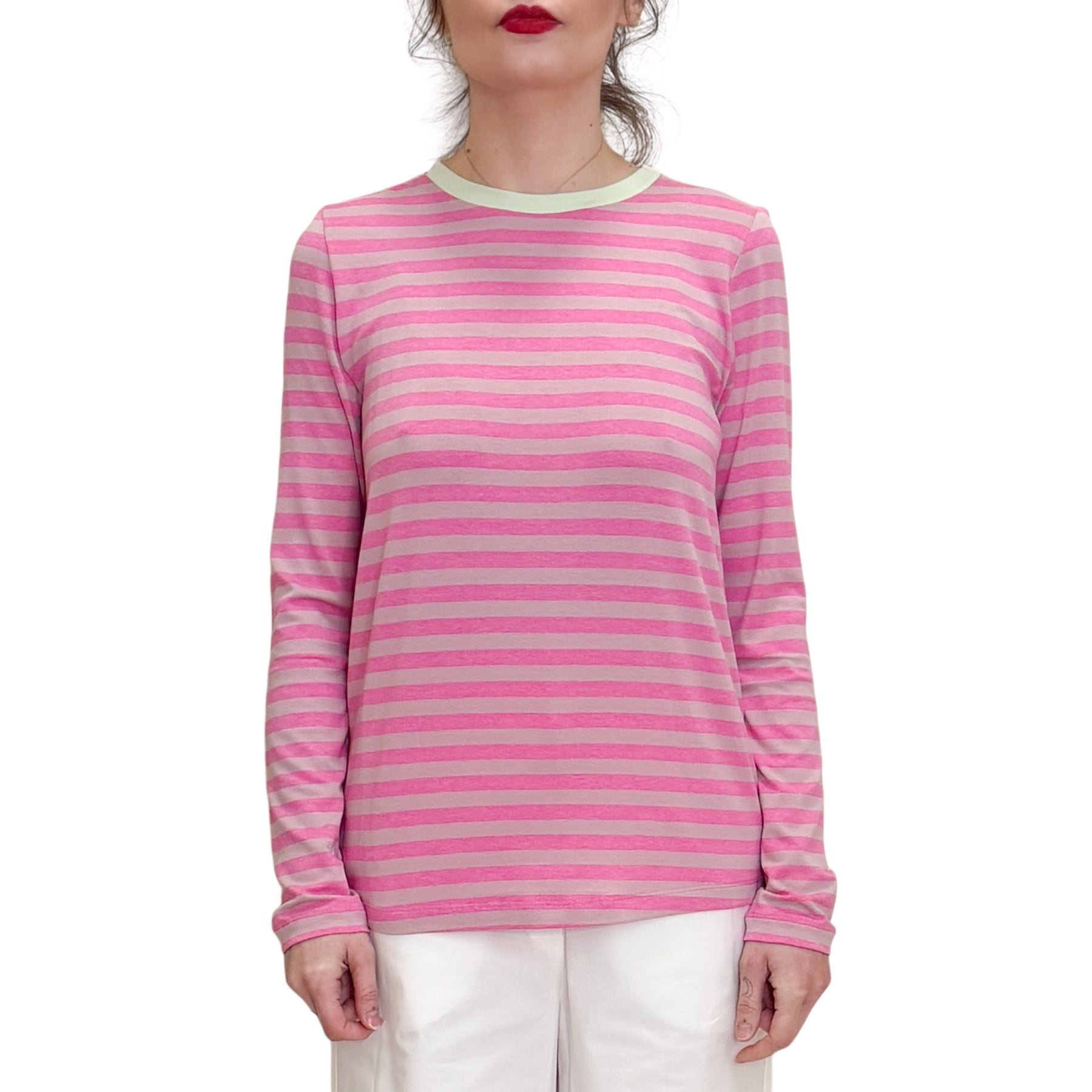 T-Shirt over in jersey di viscosa elasticizzata a righe Fuxia e rosa con bordo in contrasto verde acqua