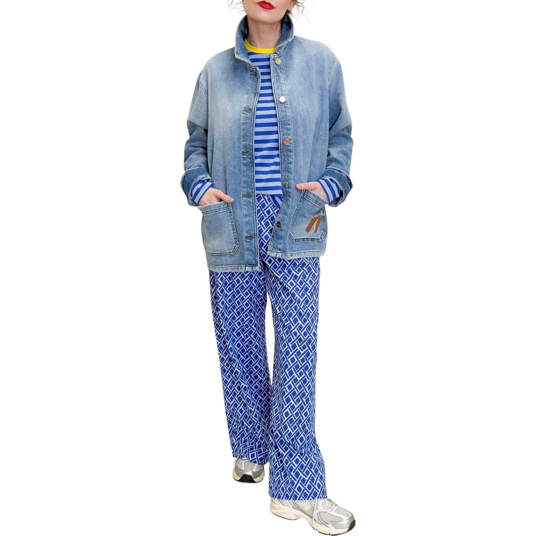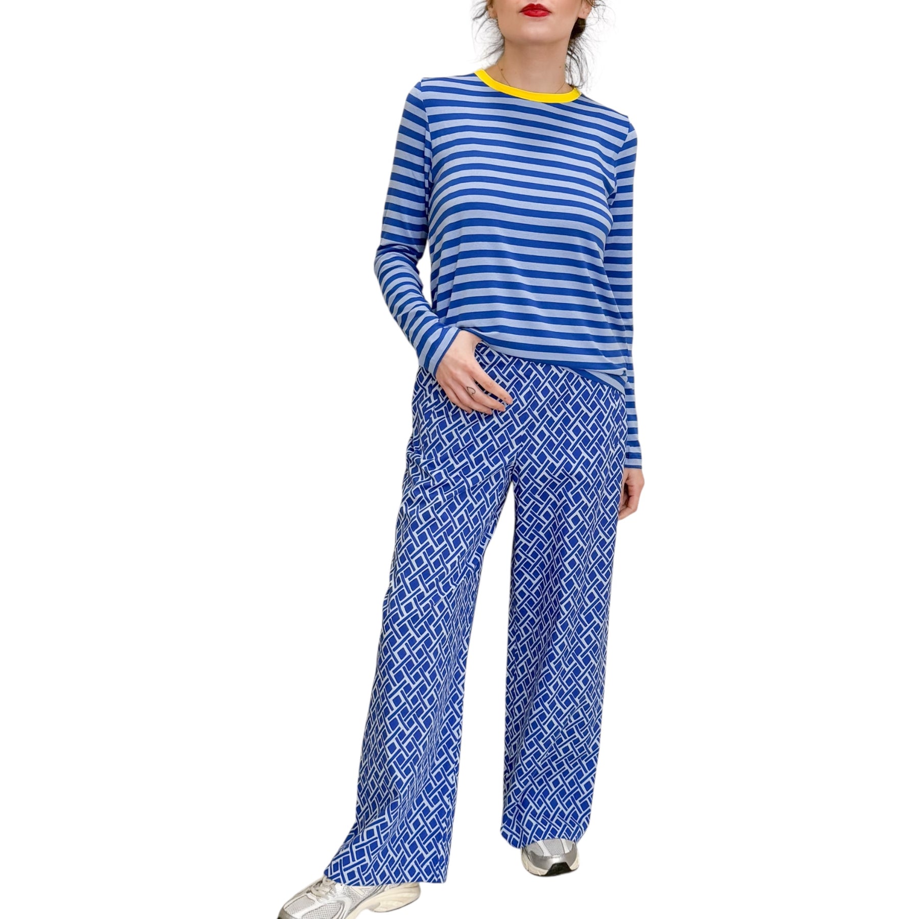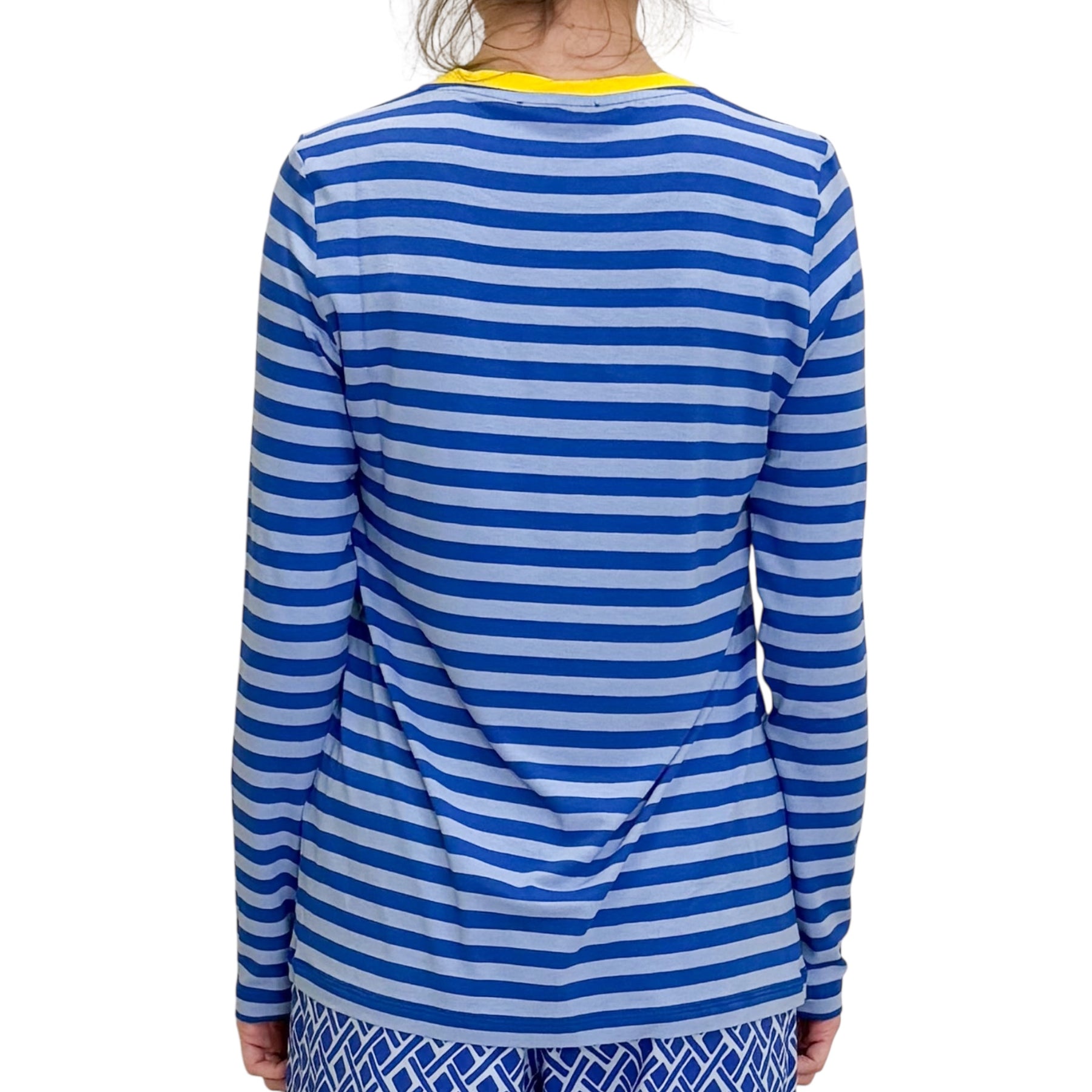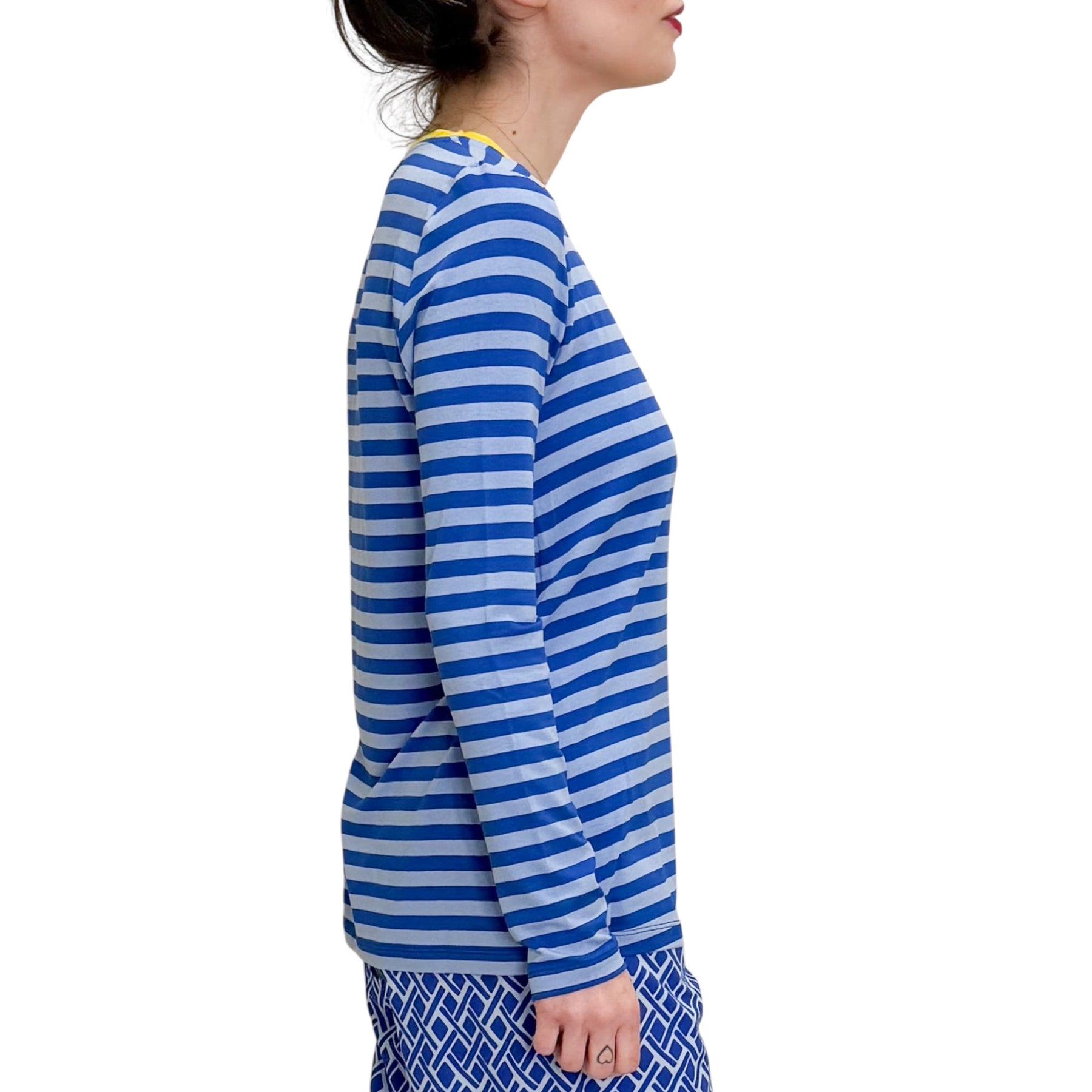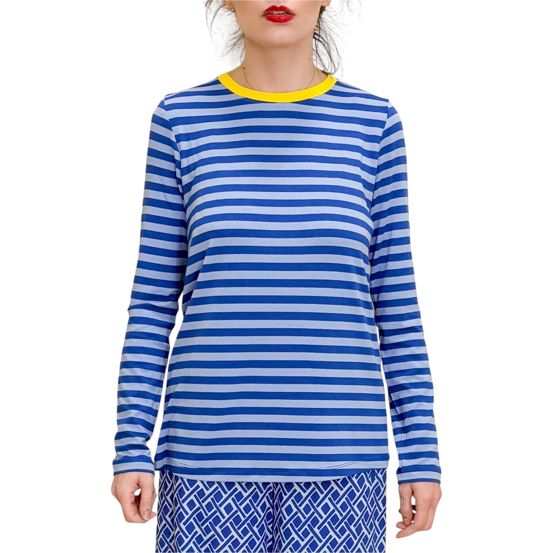 T-Shirt over in jersey di viscosa elasticizzata a righe azzurra con bordo in contrasto giallo .