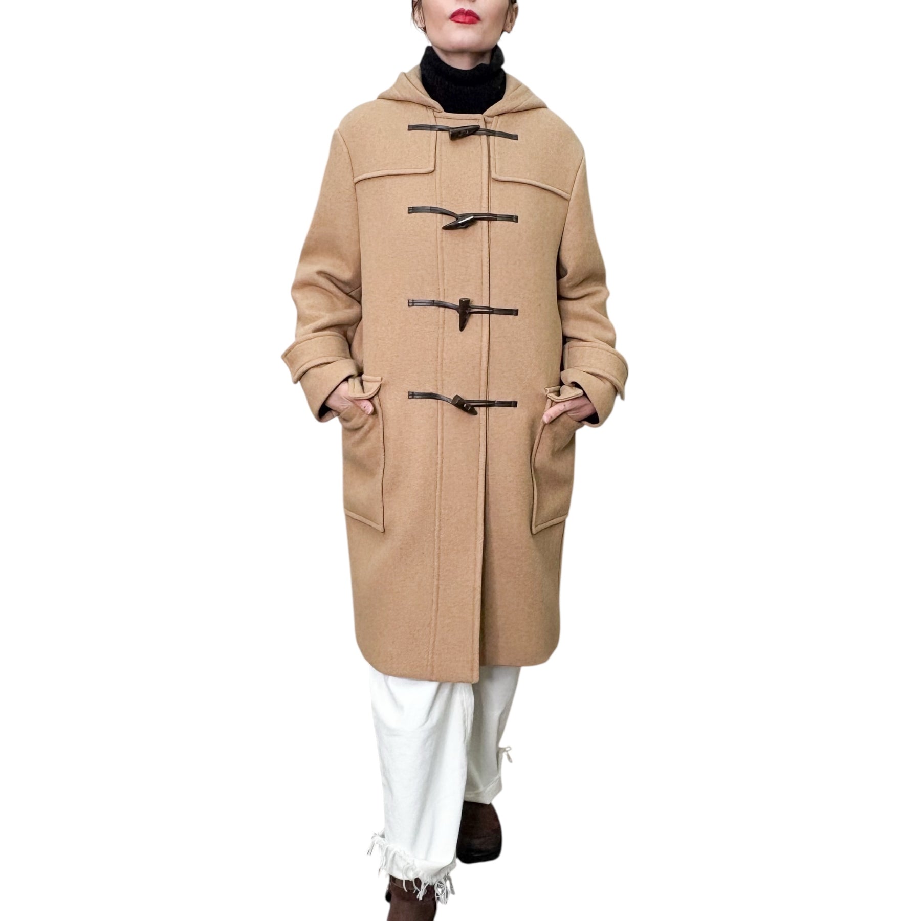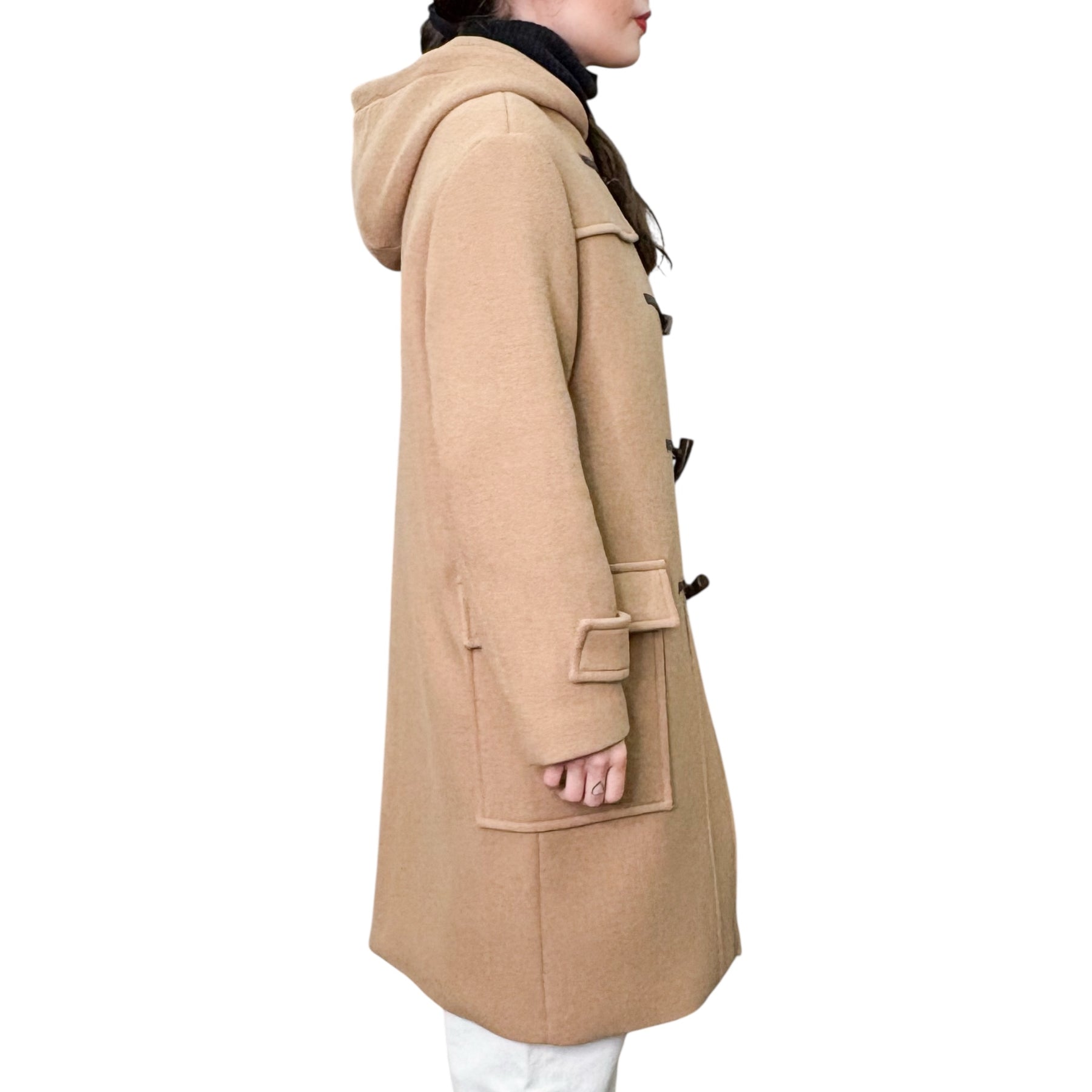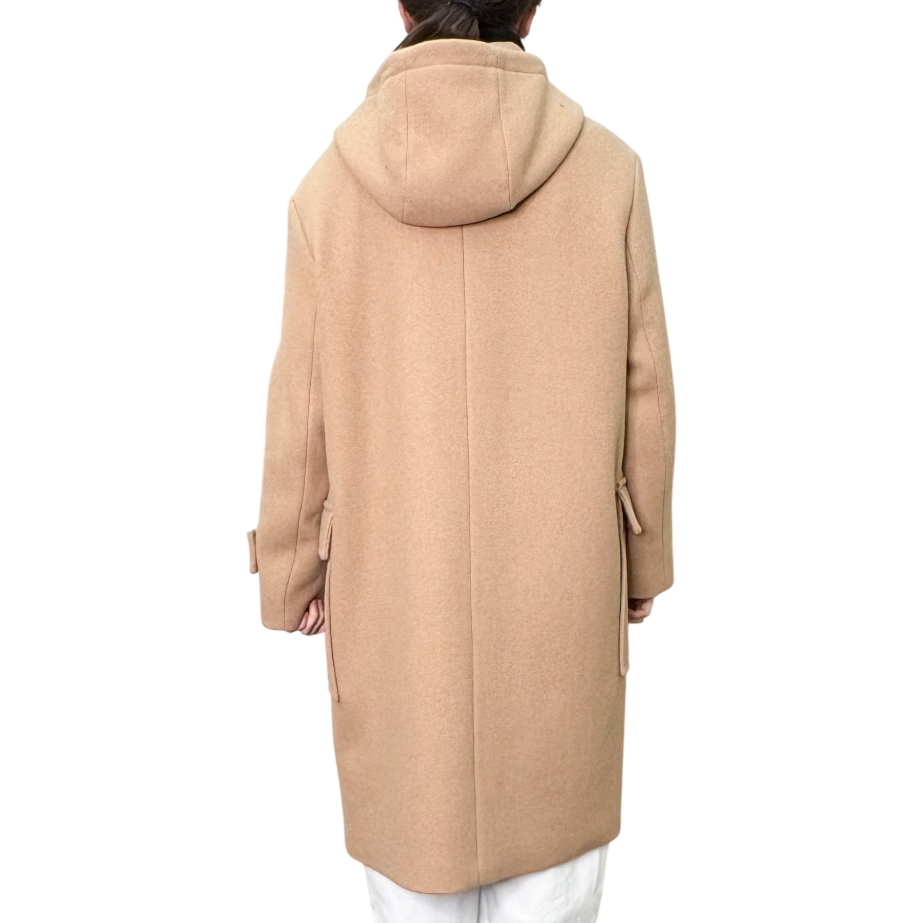 Cappotto montgomery in pura lana con cappuccio , tasche a toppa e allacciatura con alamari .