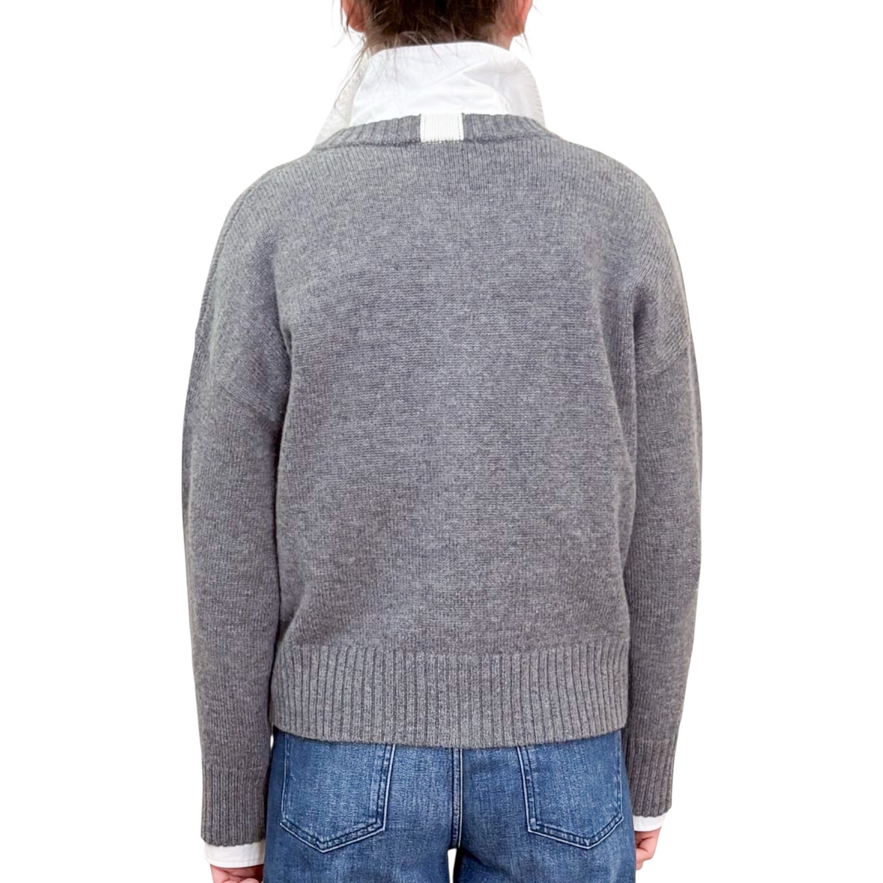 Cardigan girocollo corto in pura lana con linea a scatoletta e dettaglio di intarsio in contrasto bianco .