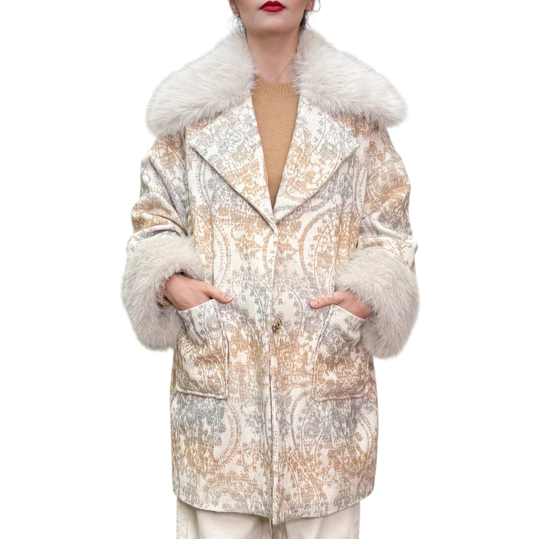 Cappotto over in tessuto damascato di cotone , poliestere e lana con collo in ecopelliccia staccabile , allacciatura con automatici ,polsi i ecopelliccia e fodera interna in contrasto .