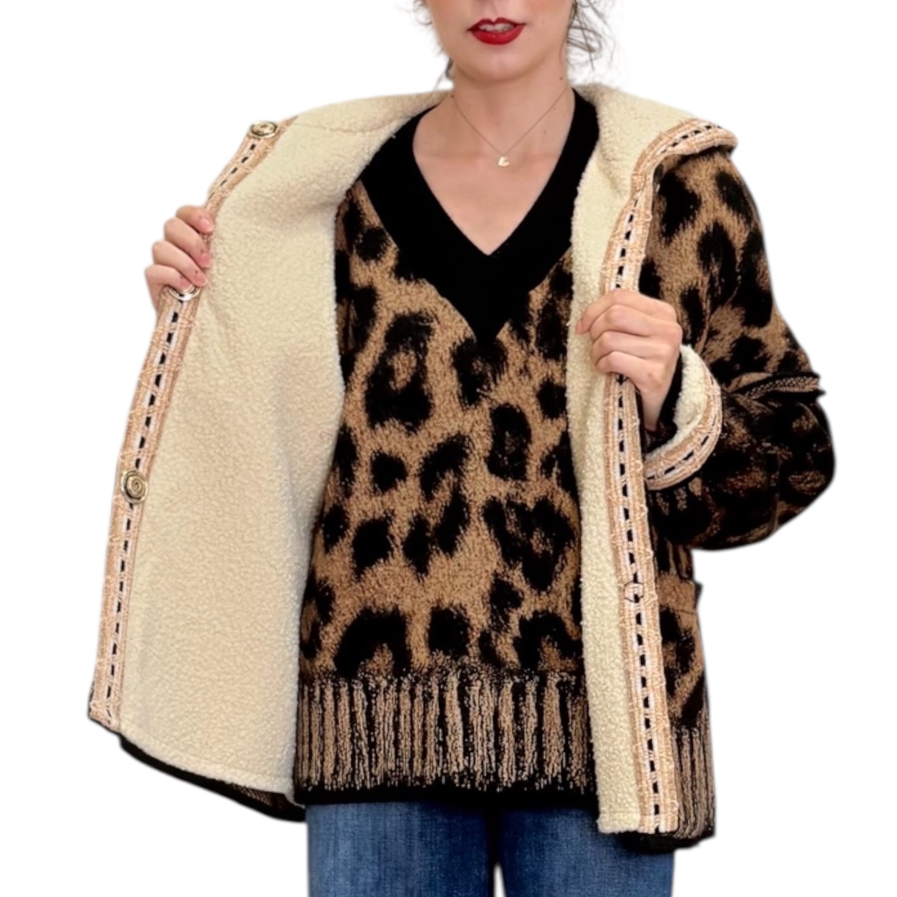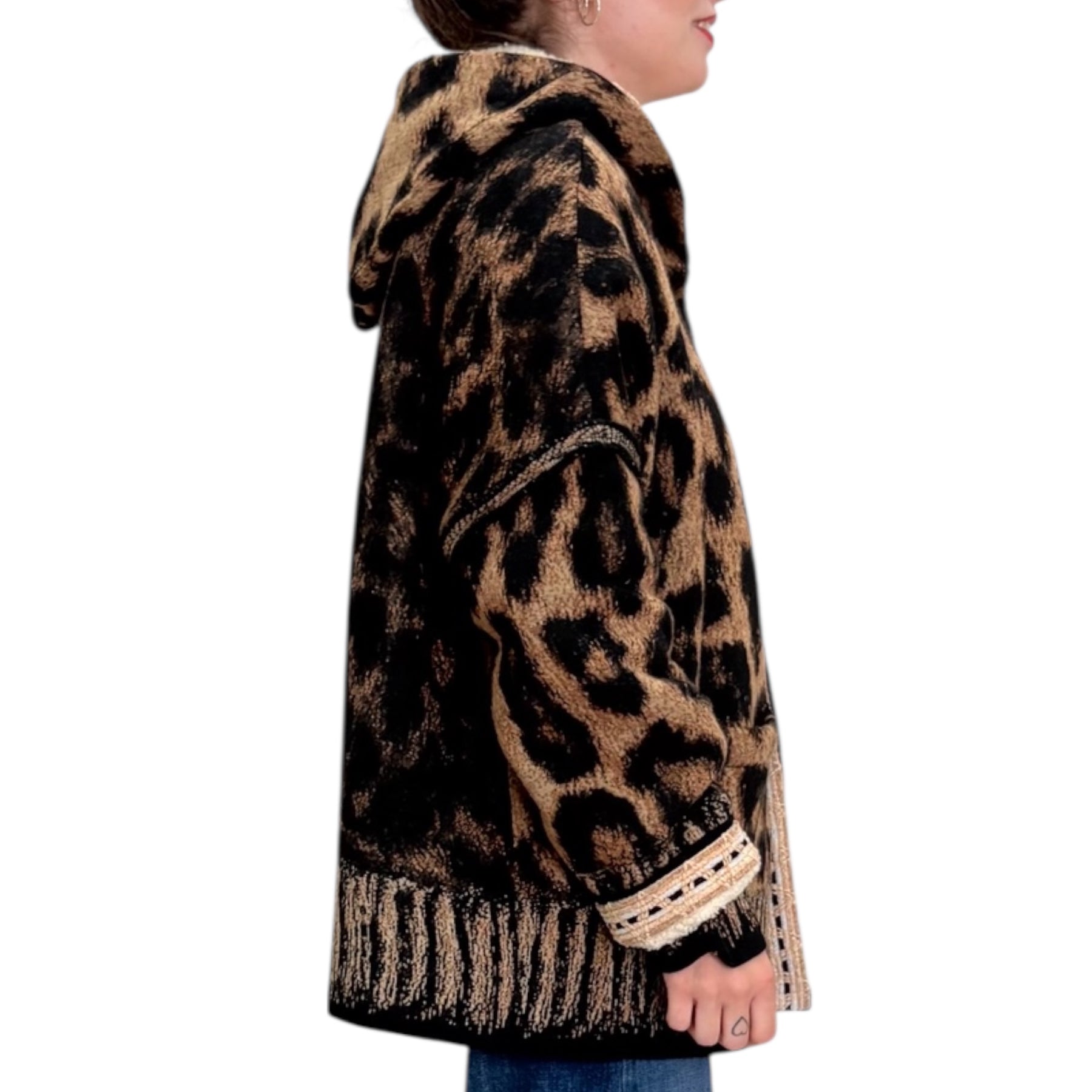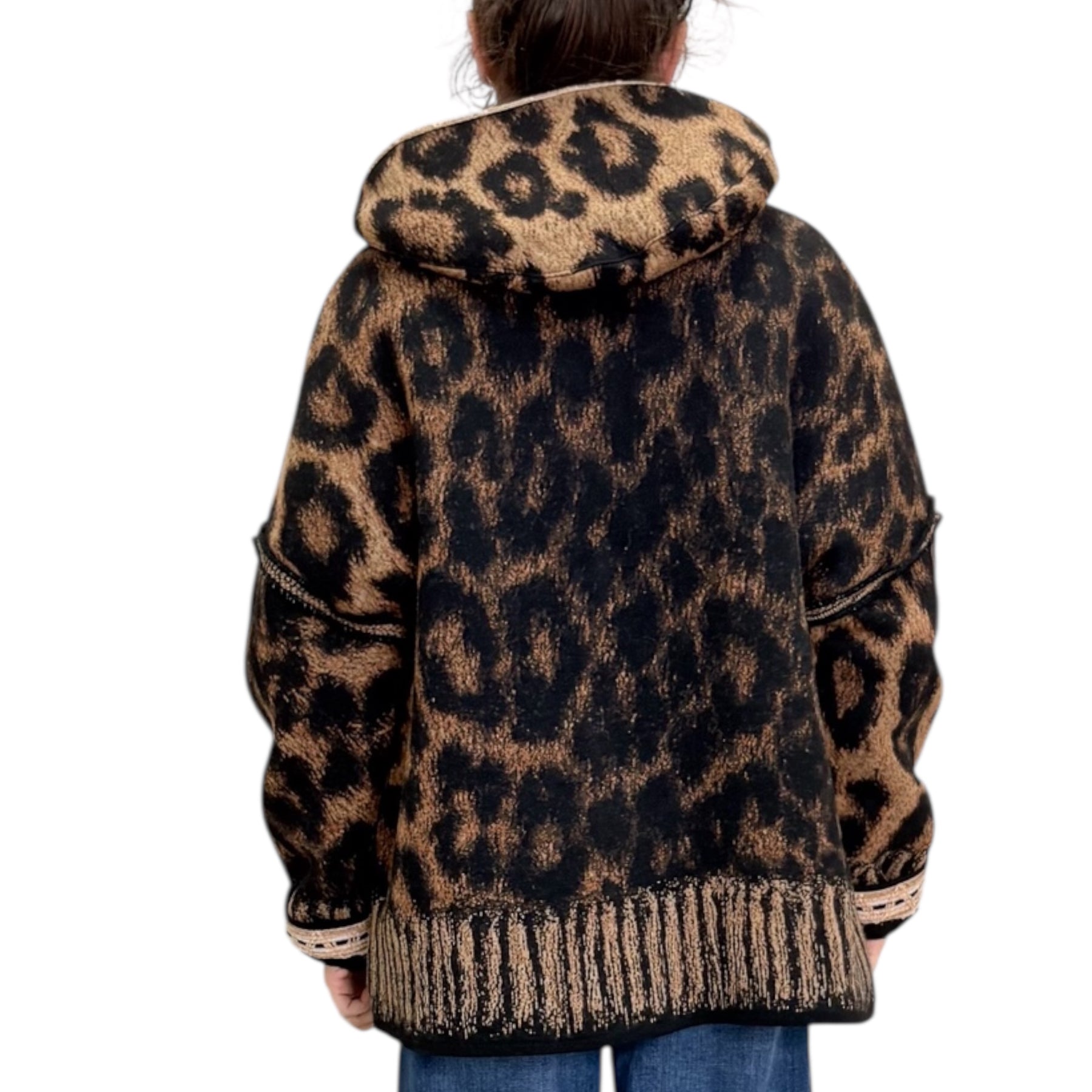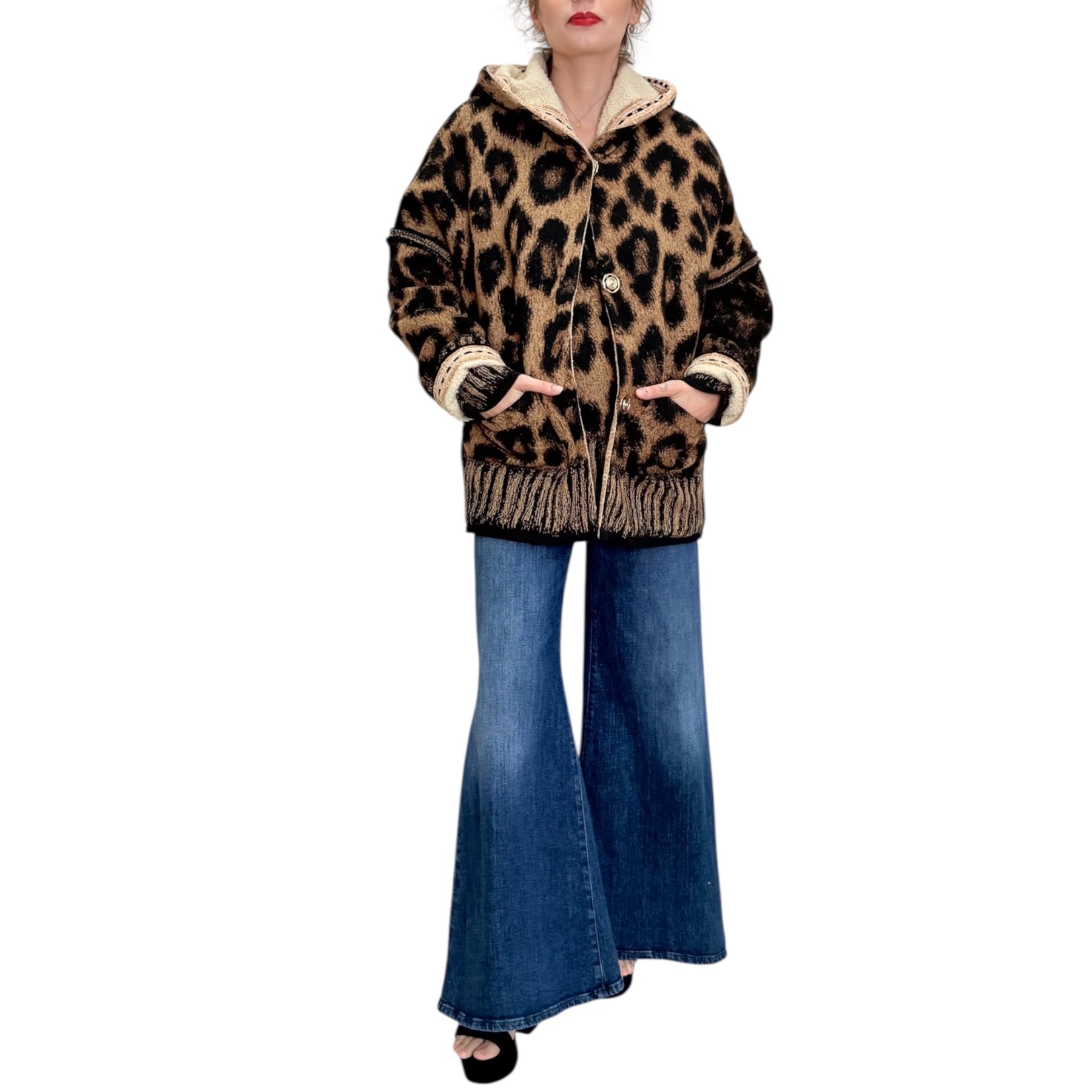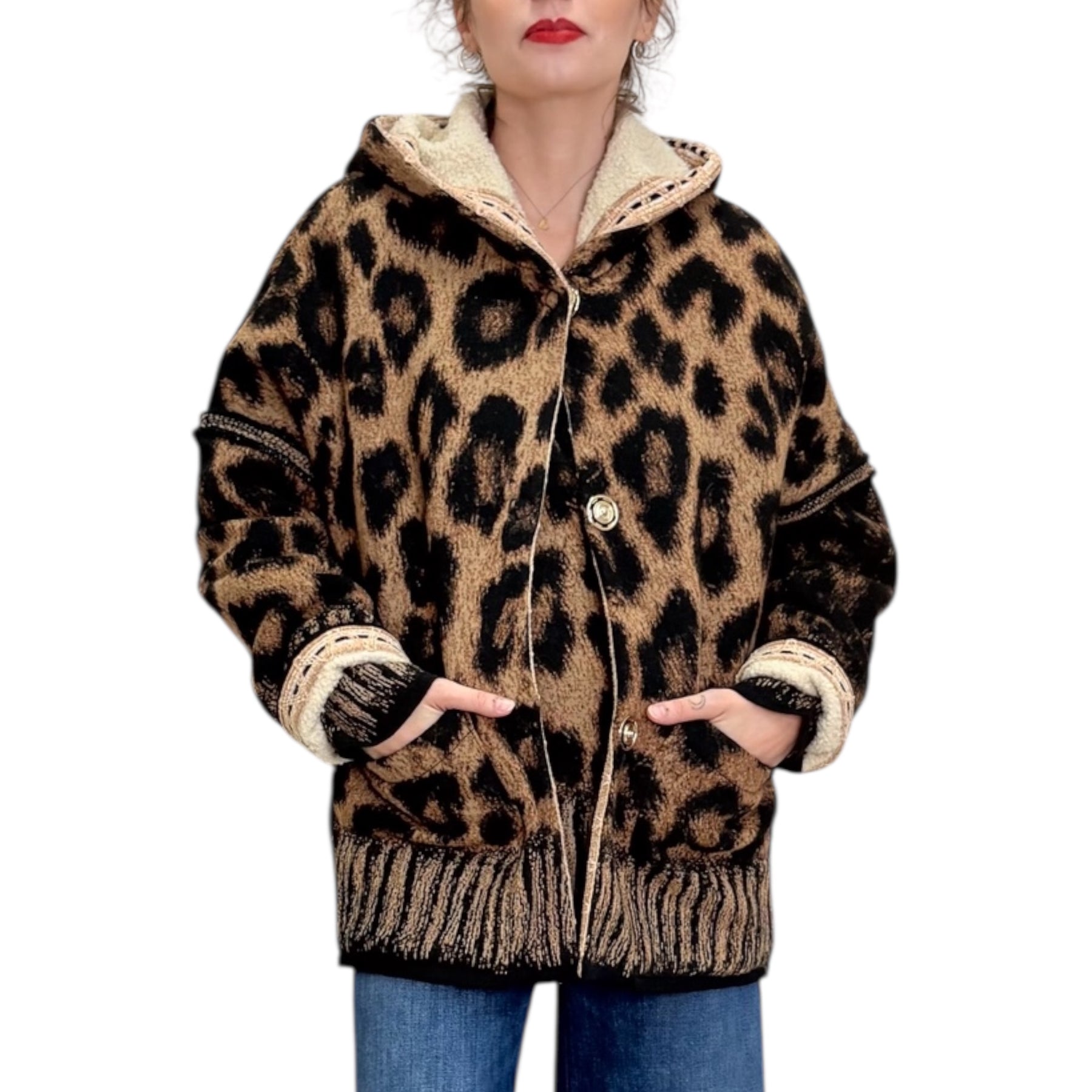 Giaccone over in lana e viscosa e acrilico con cappuccio , allacciatura con automatici , tasche e interno in ecopelliccia .