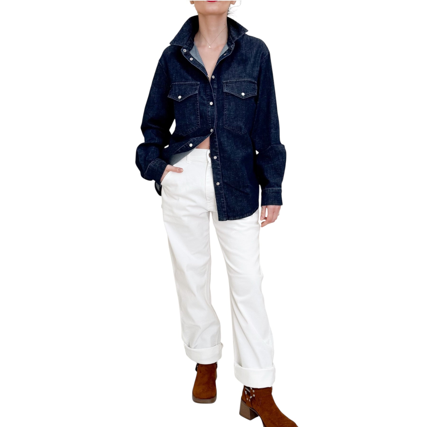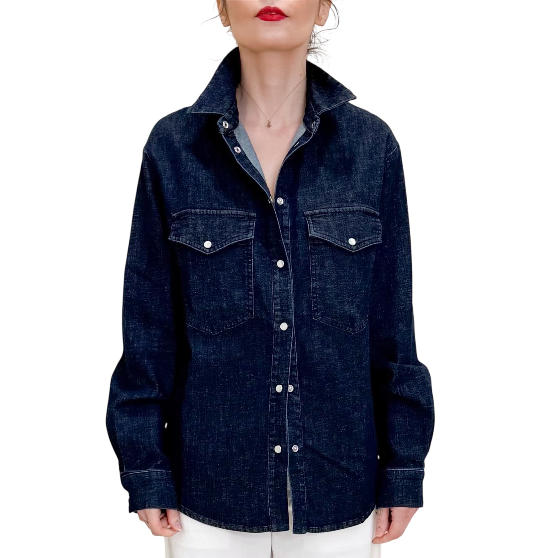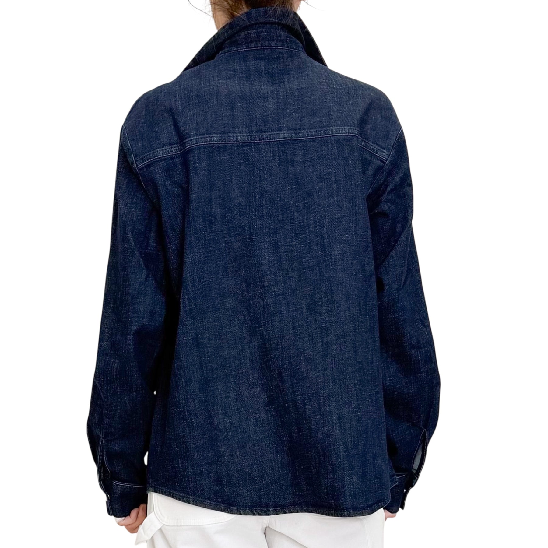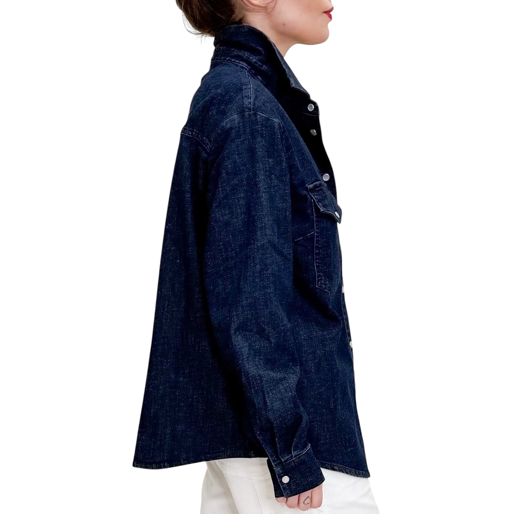 Camicia over in denim di cotone , lino ed elastam con lavaggio scuro con tasche applicate .