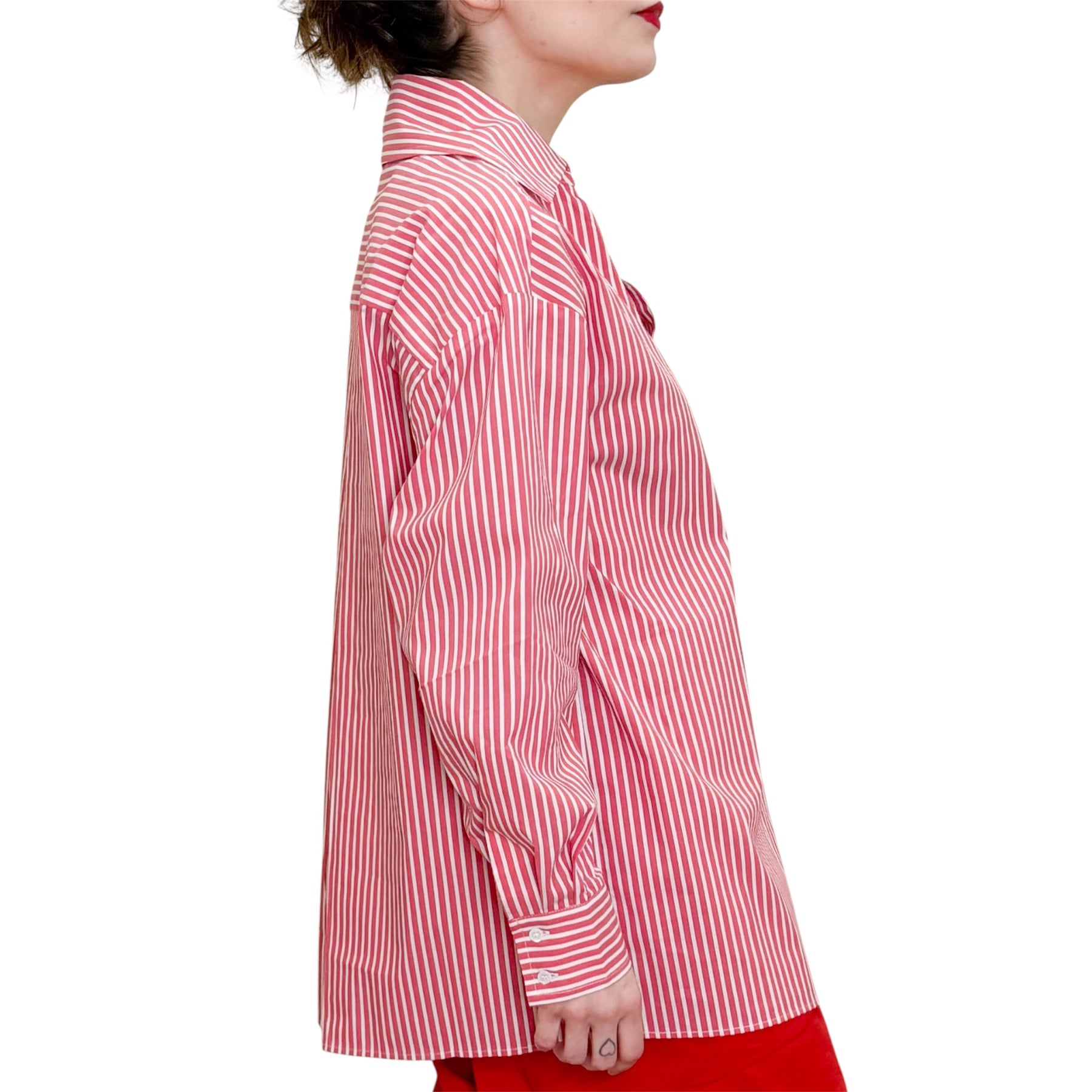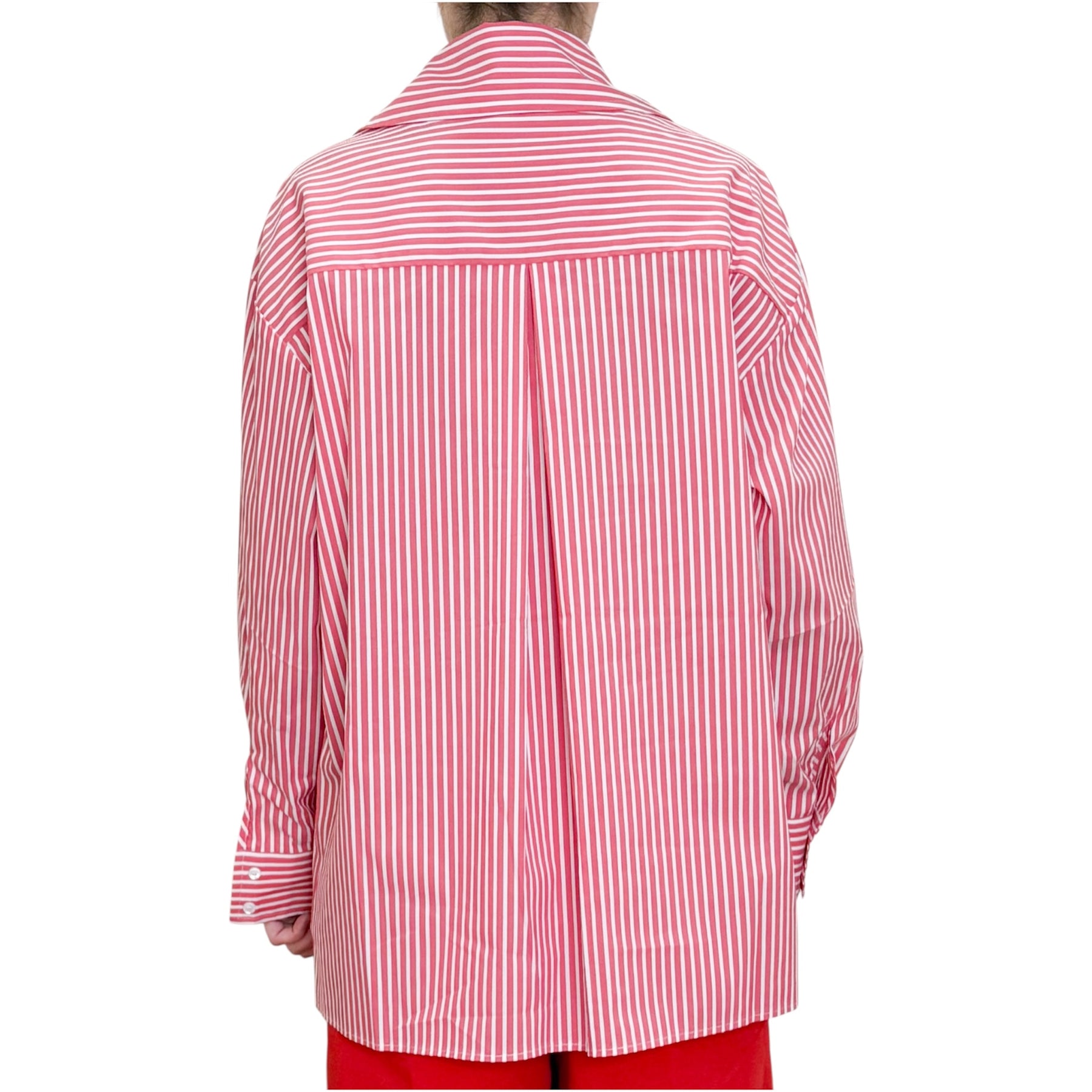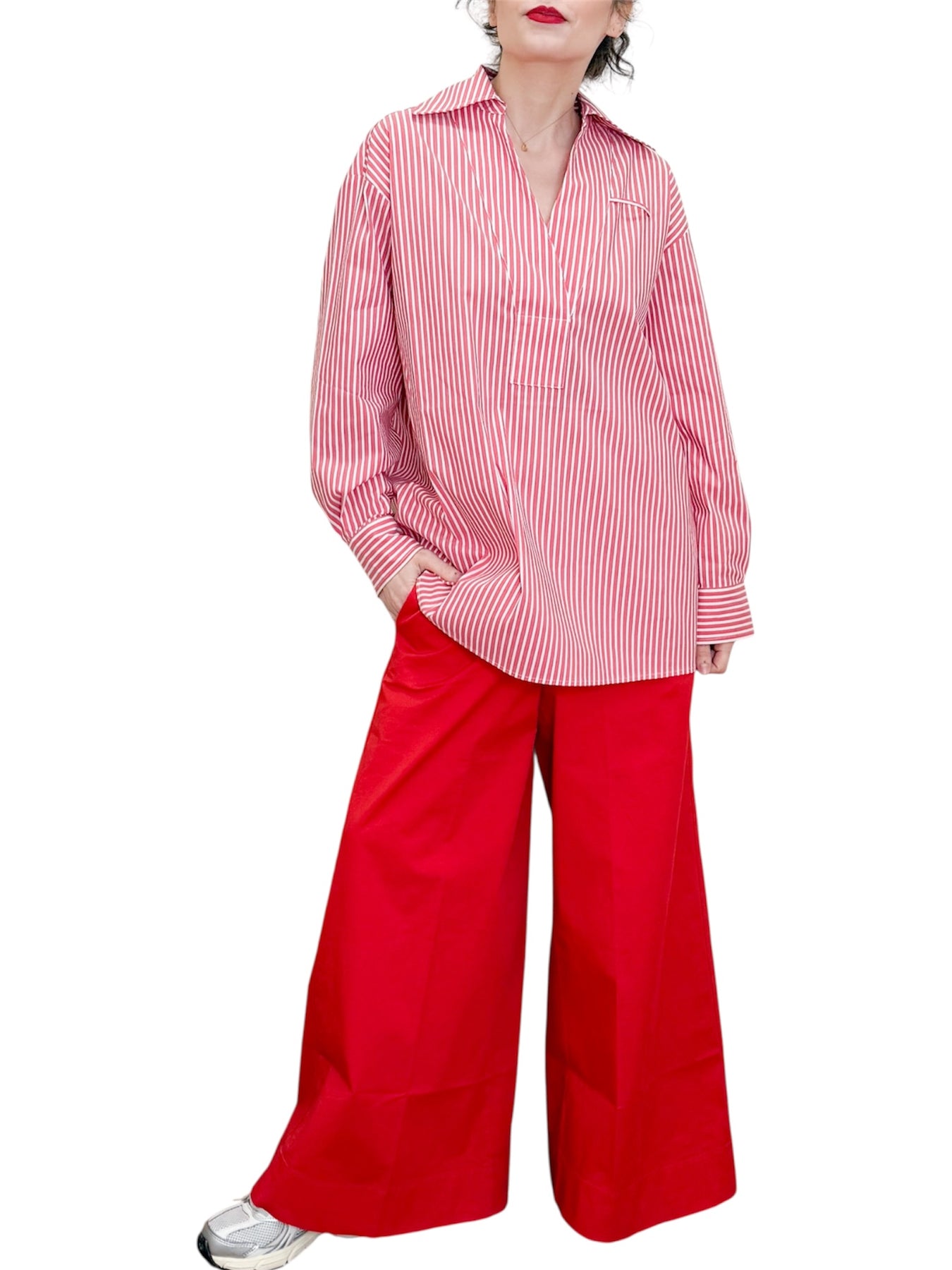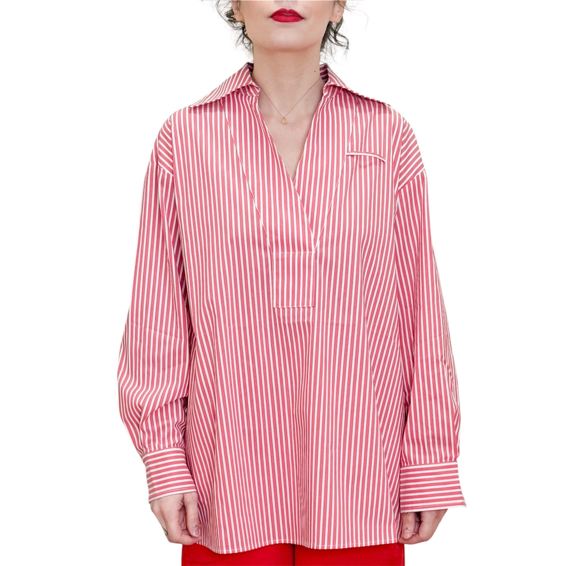 Camicia over in popeline di cotone elasticizzato rossa e bianca con scollo a V e piogone sul dietro .
