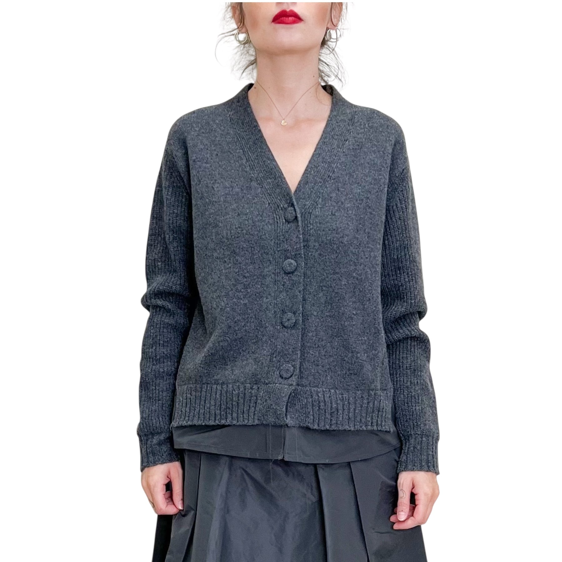 Cardigan in lana e poliestere con scollo a V , linea morbida con inserto nel dietro in Taffetas .
