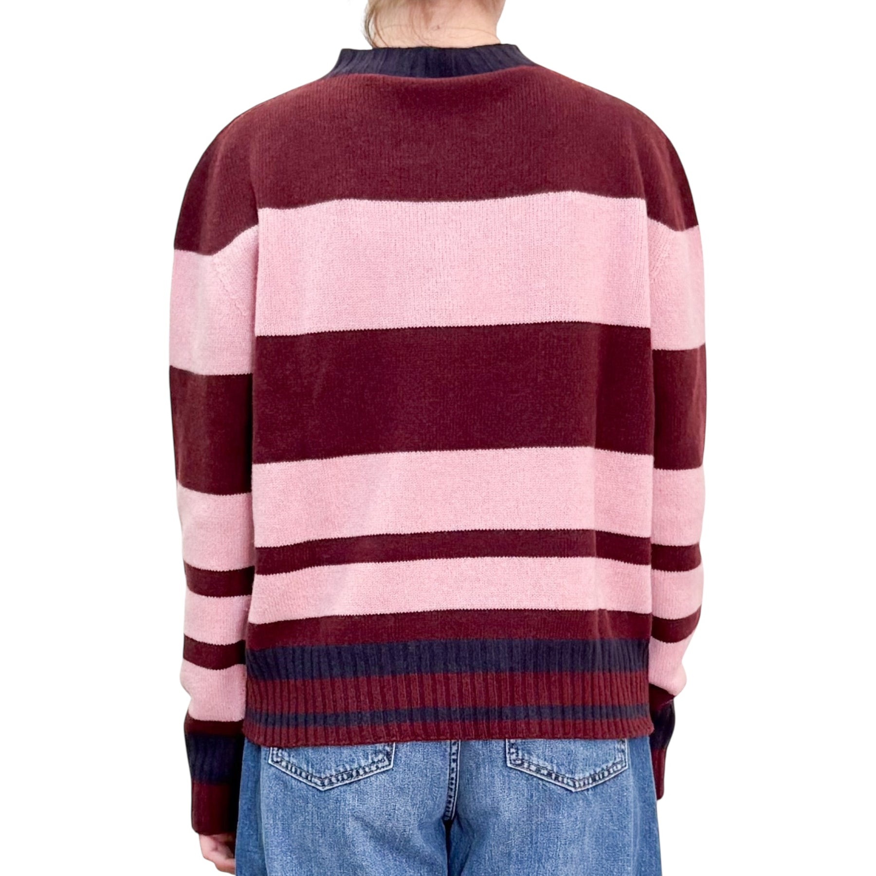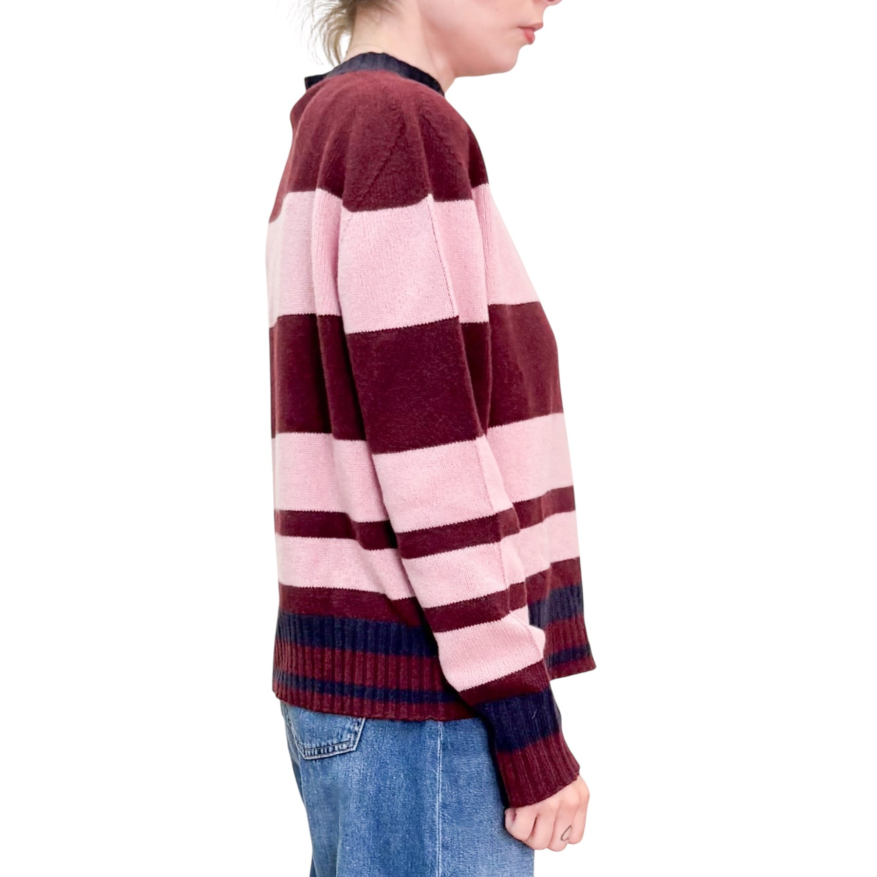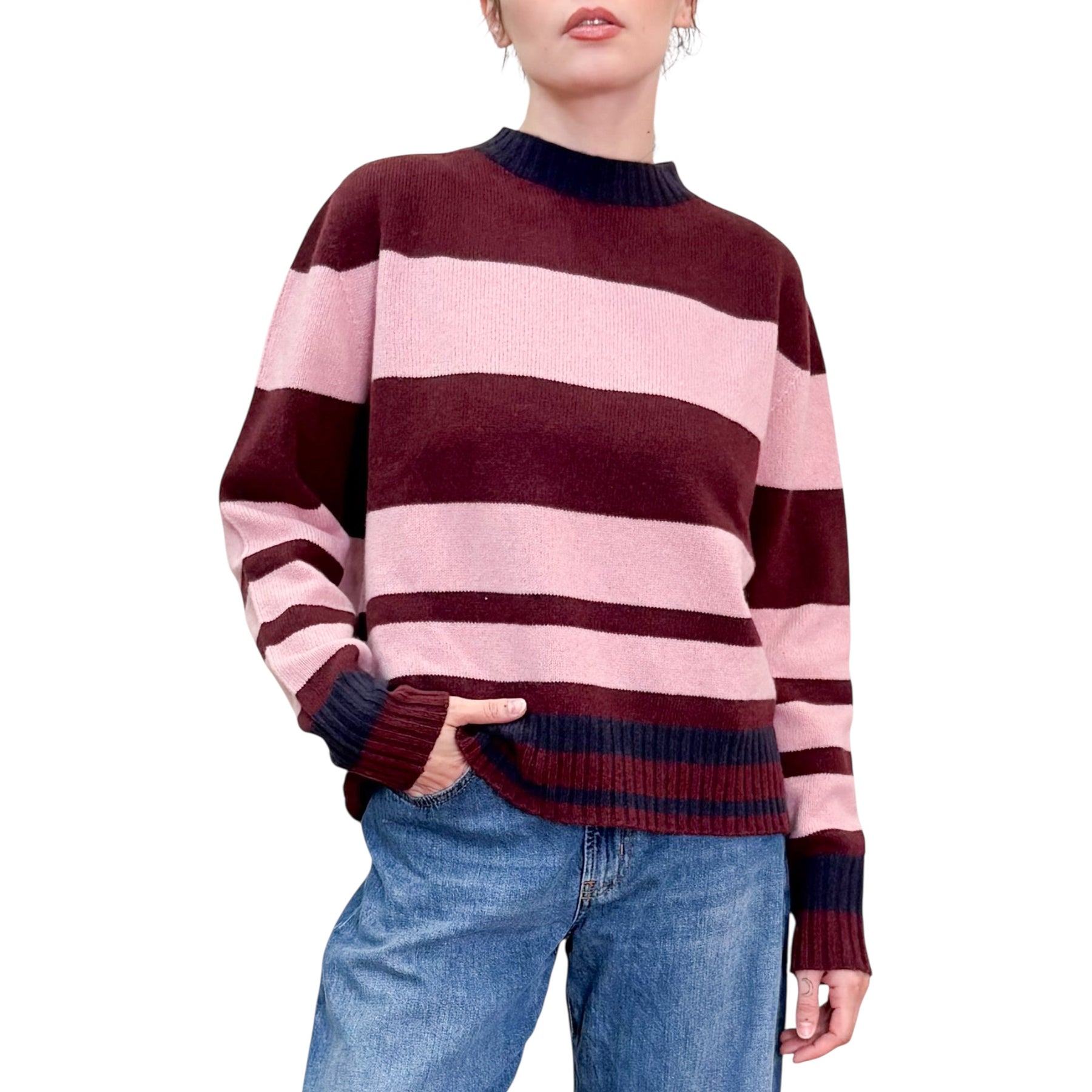 Girocollo a righe in lana e cachemire con linea a scatola bordeaux e rosa ninfea e bordo in contrasto blue scuro .