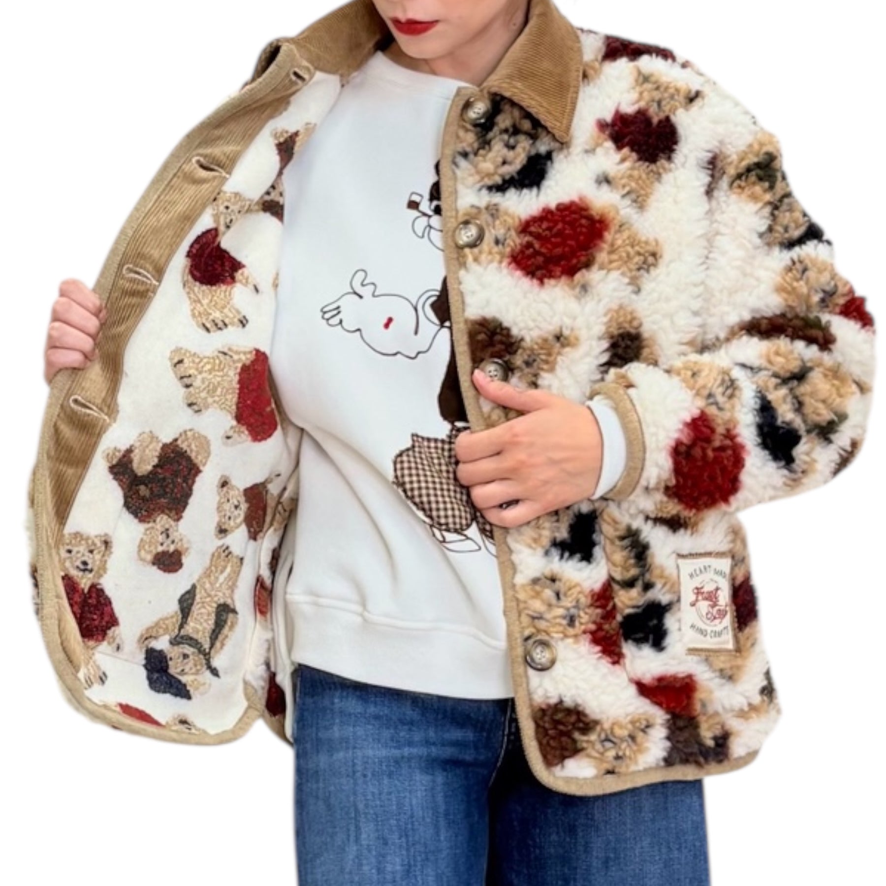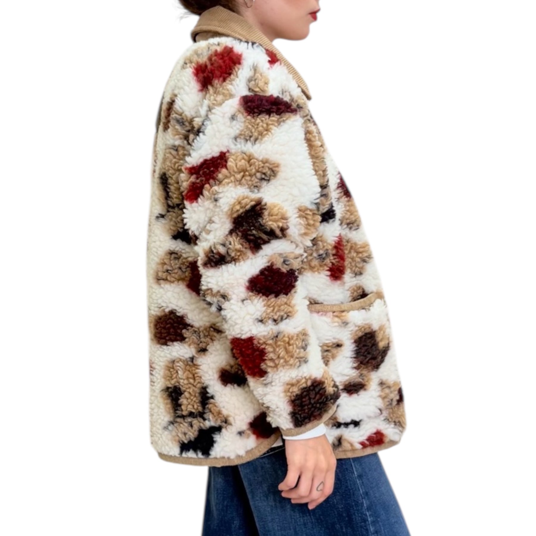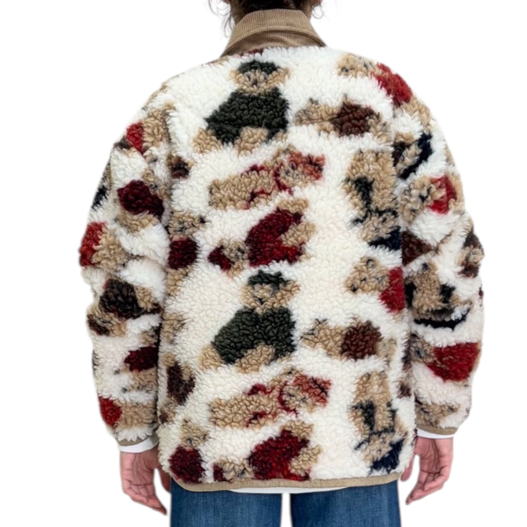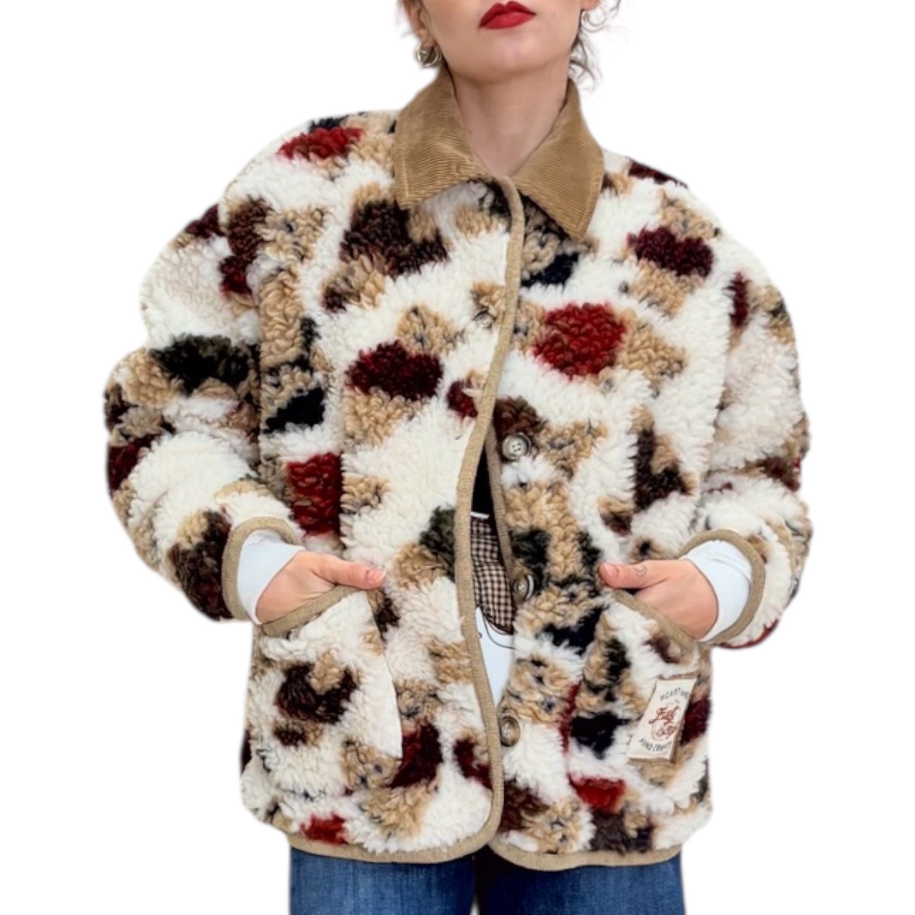 Giaccone in ecopelliccia con disegno jacquard , colletto in velluto , linea over e tasche .