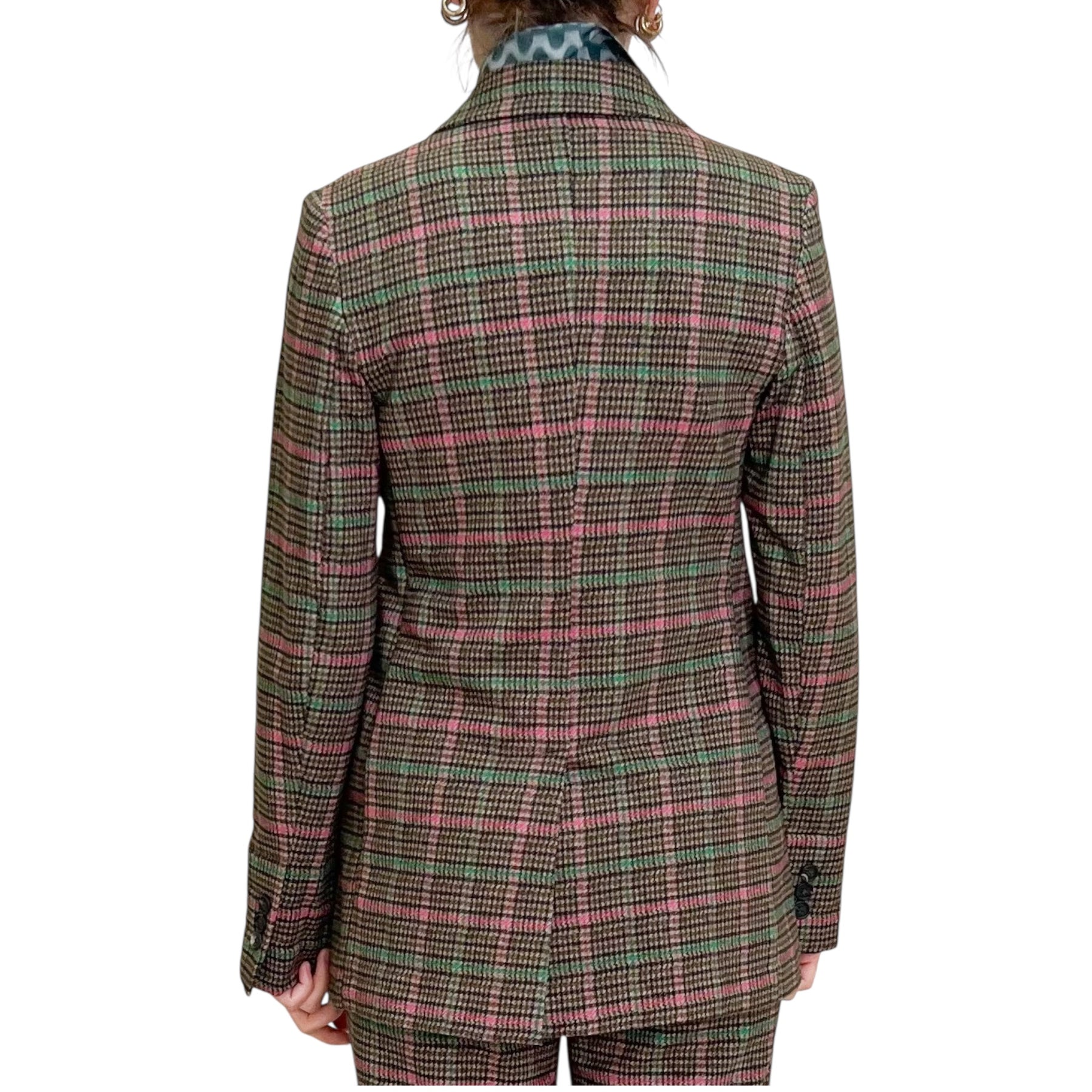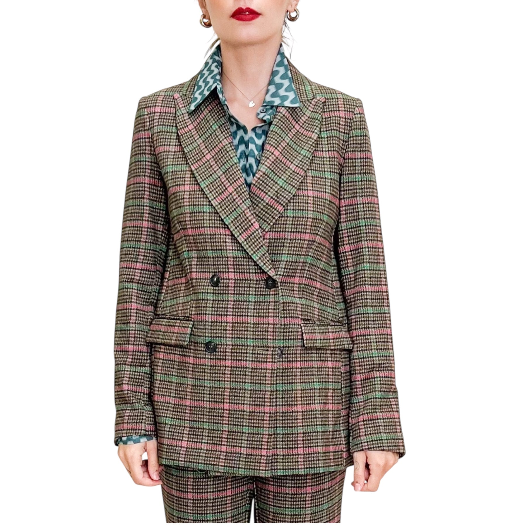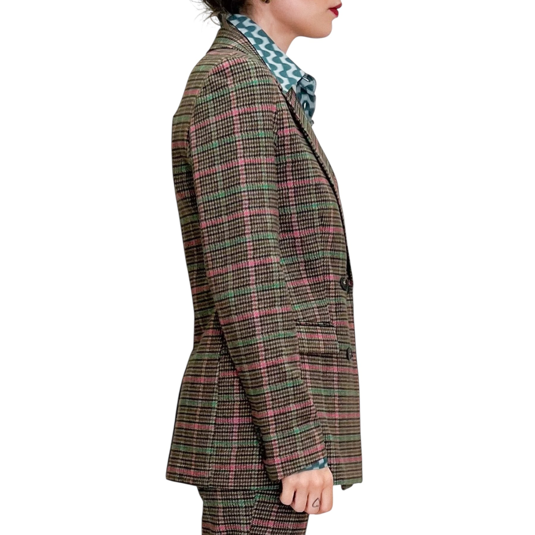 Giacca doppiopetto sciancrata in jersey pesante di cotone elasticizzato con stampa check moro , rubino e verde , tasche e spacco nel dietro .