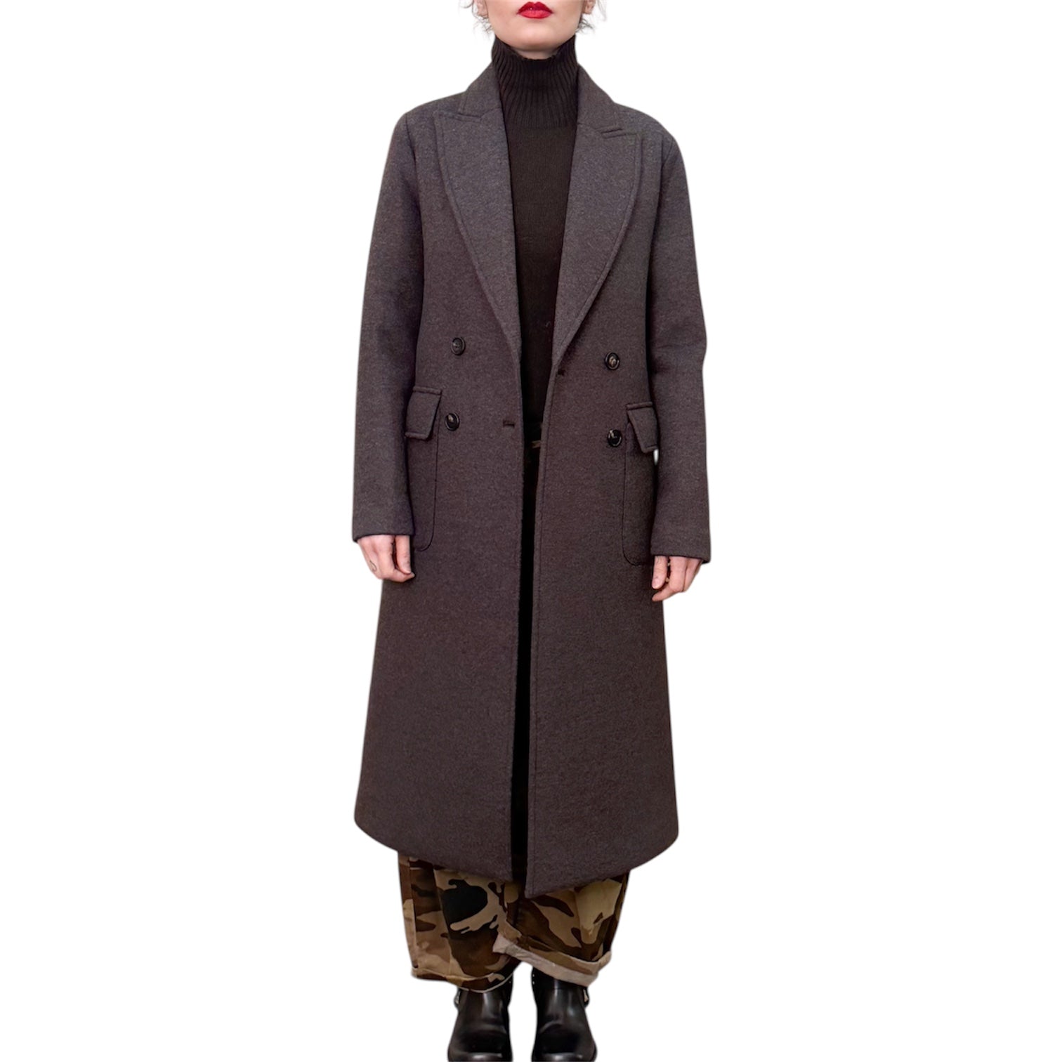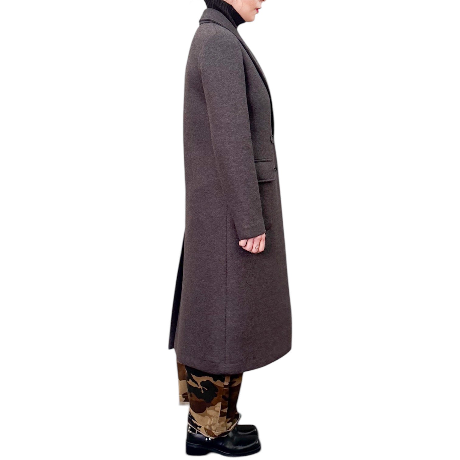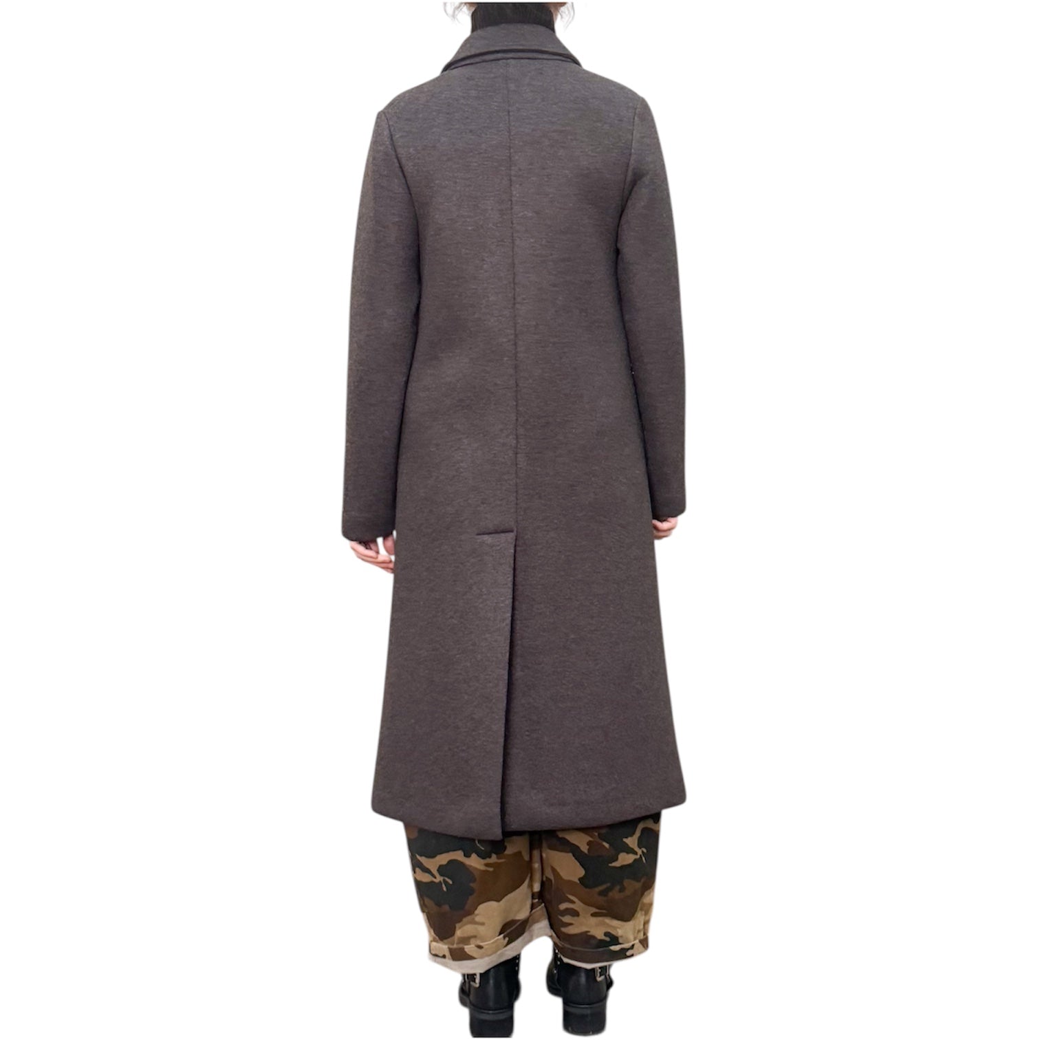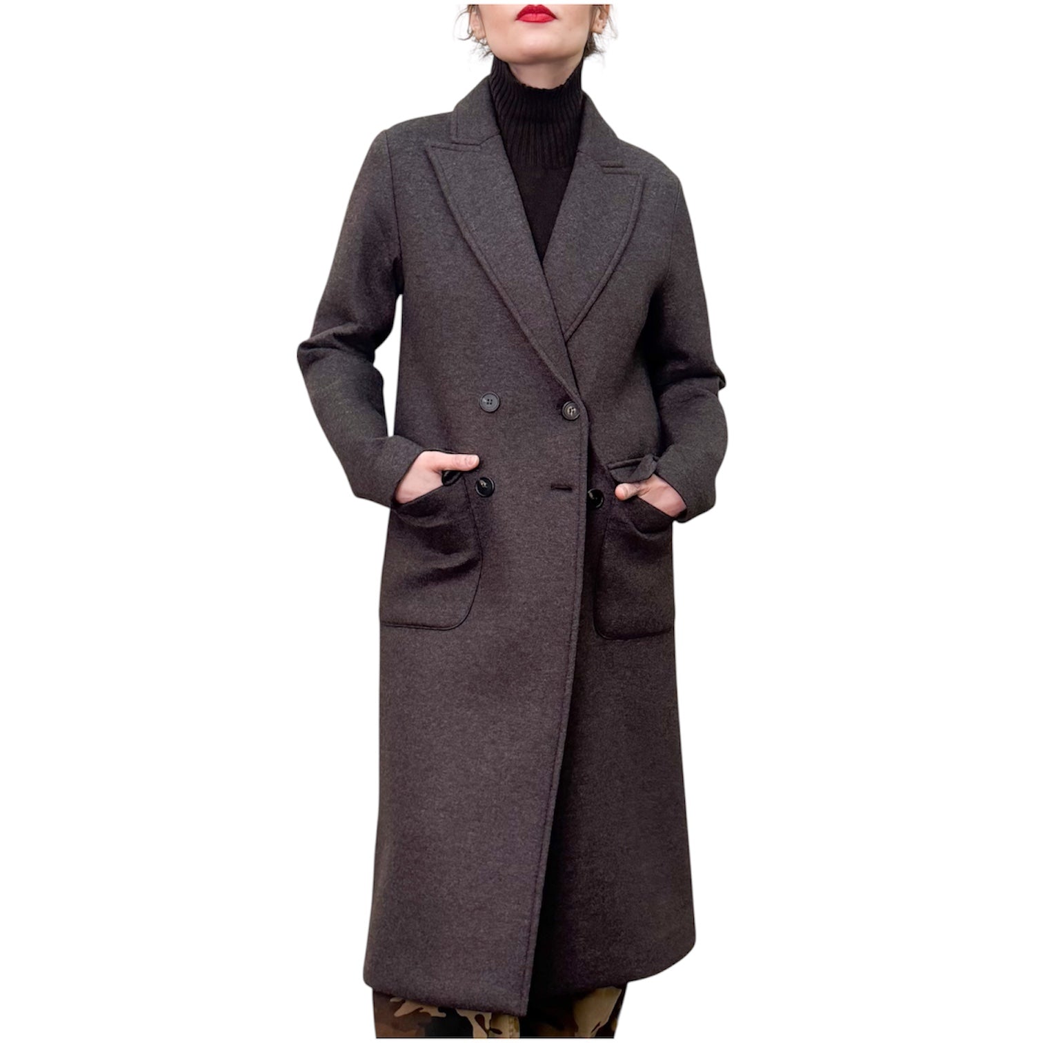 Cappotto lungo doppiopetto in neoprene doppiato di viscosa , poliestere ed elastam con tasche applicate , linea asciutta e spacco nel dietro .