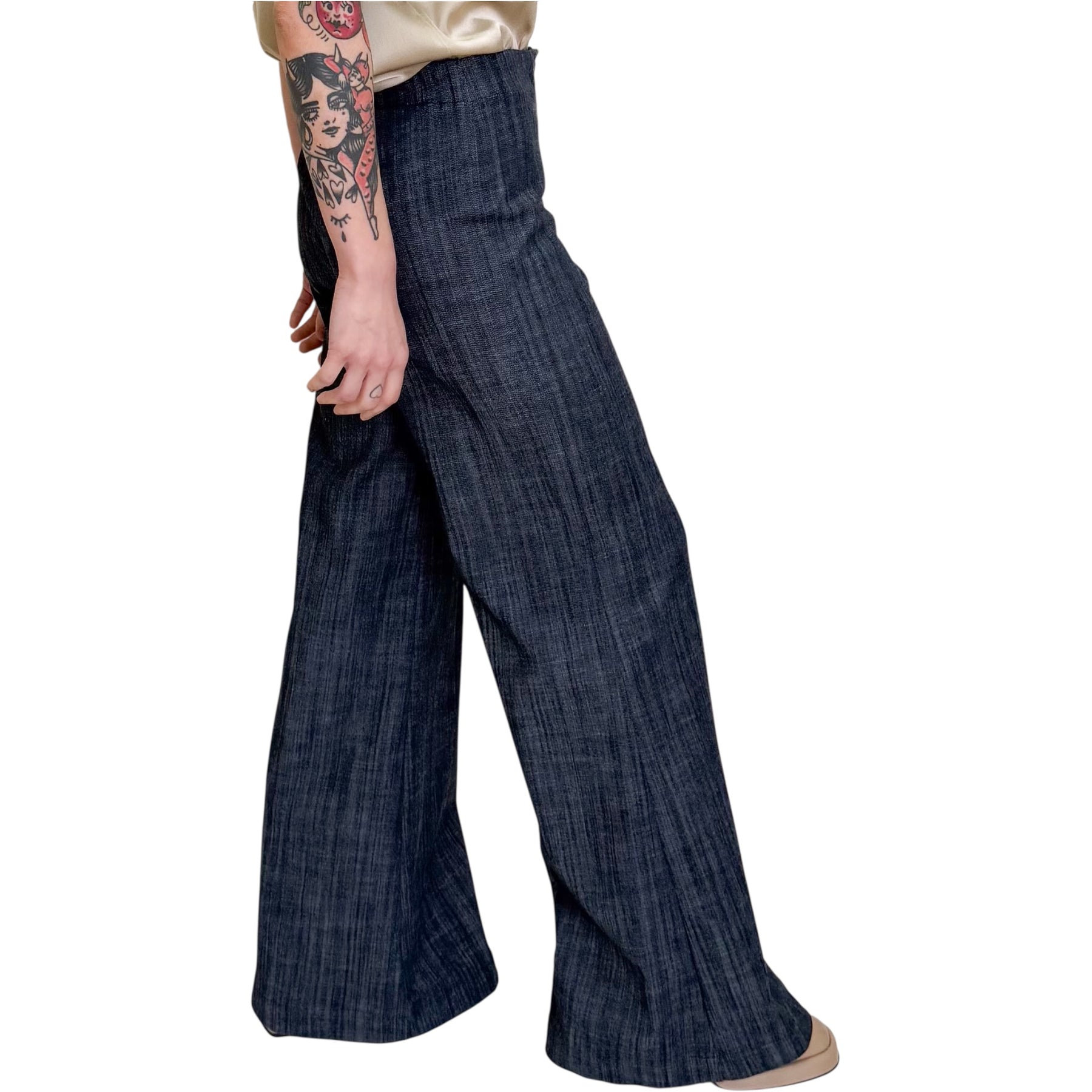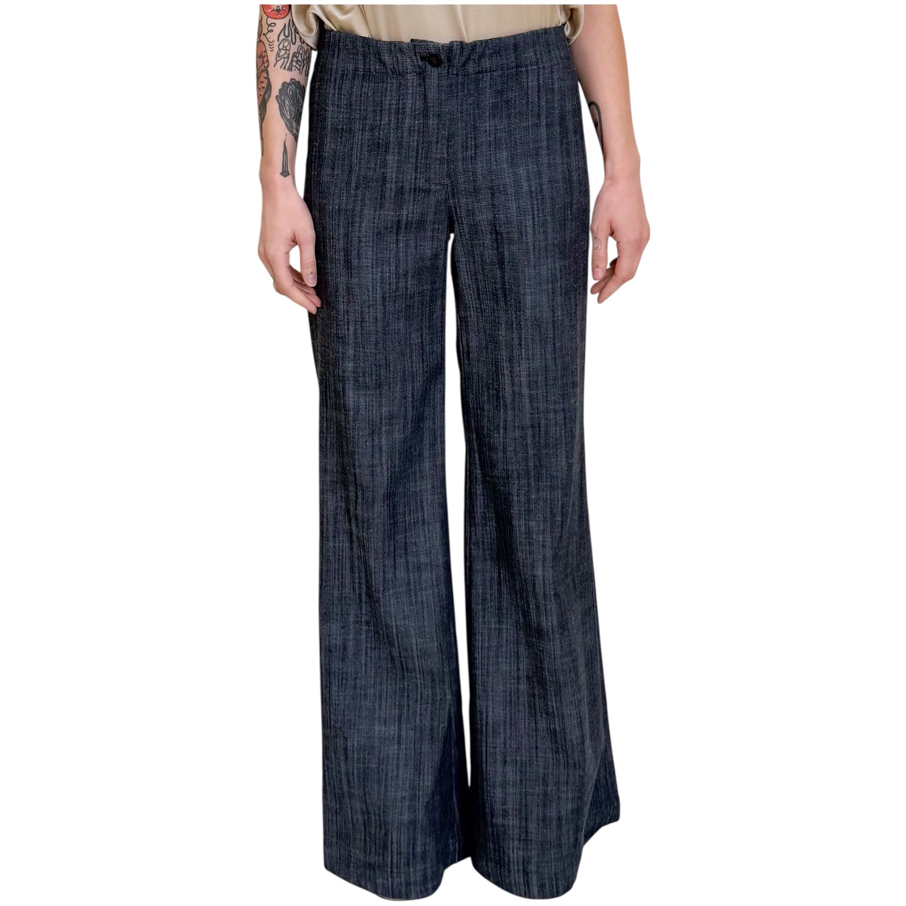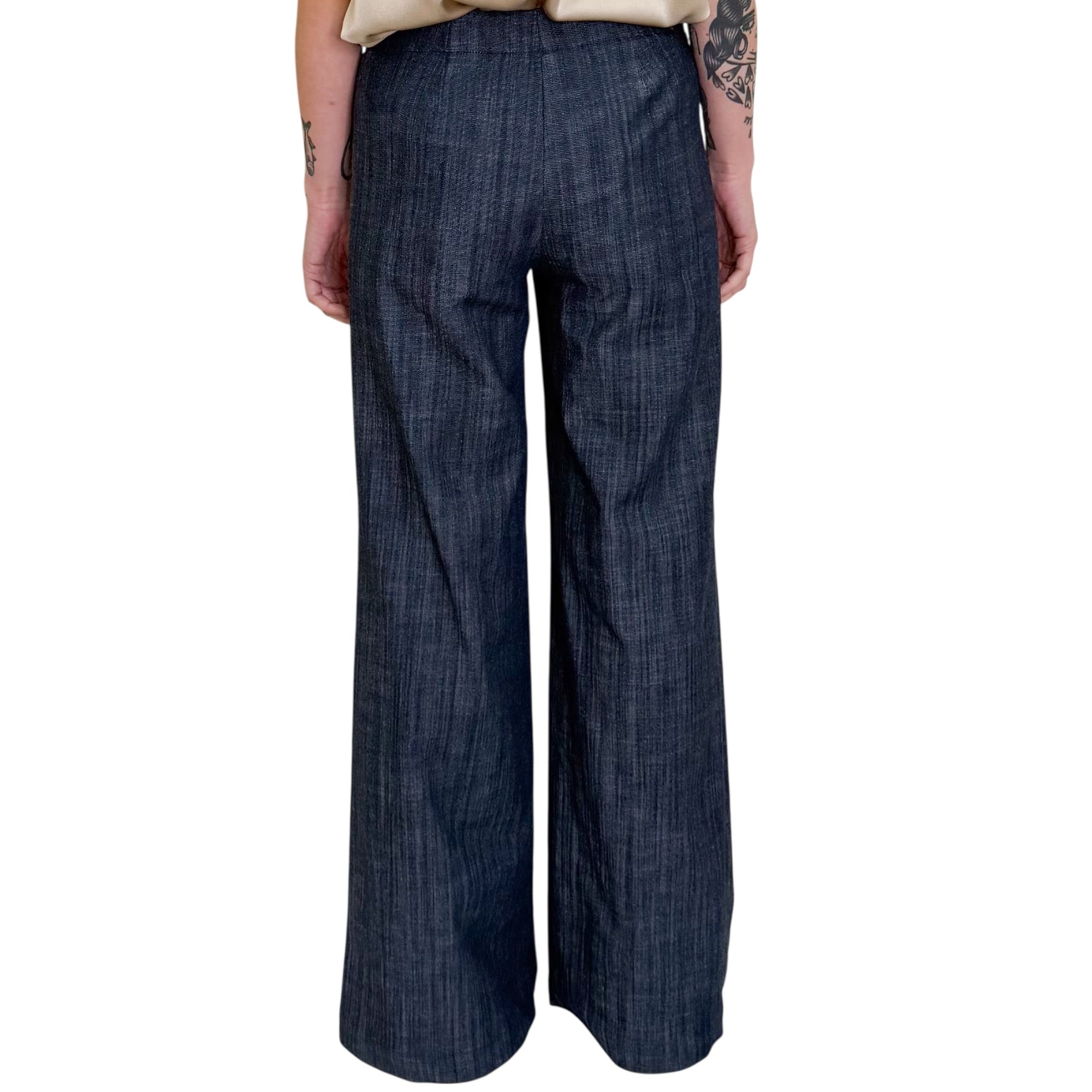 Pantaloni flare in piquet di cotone elasticizzato color Denim scuro con elastico in vita e allacciatura con zip sul davanti .