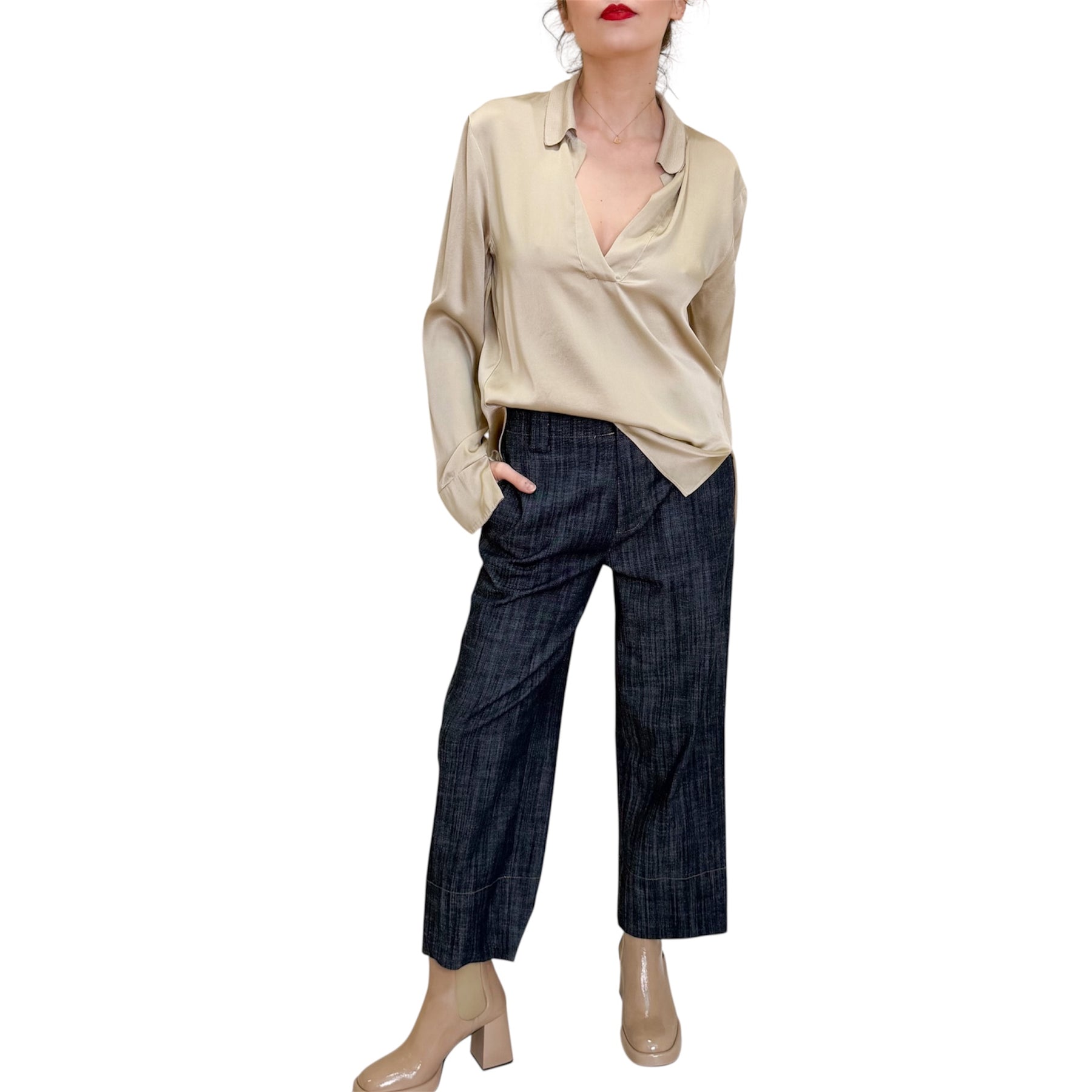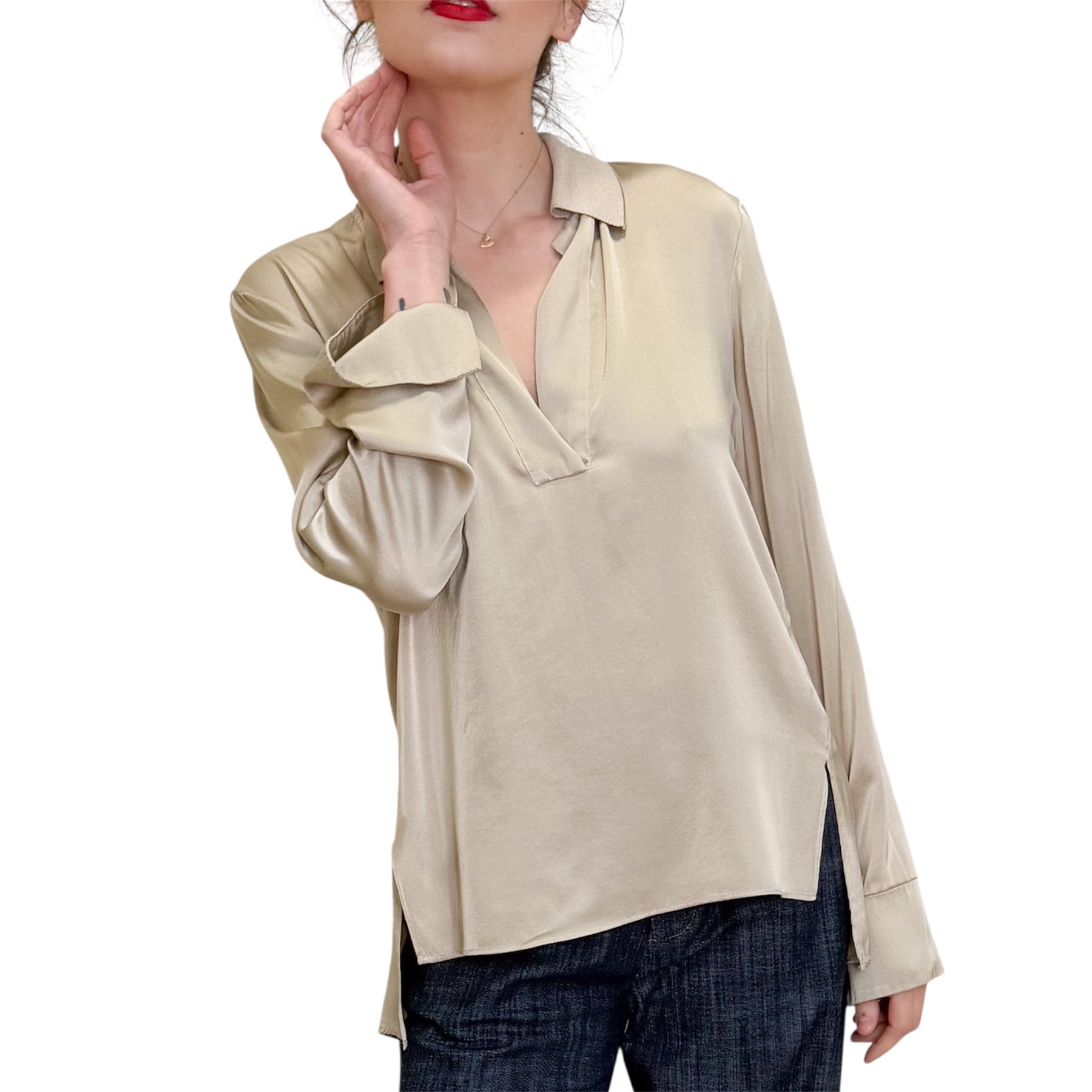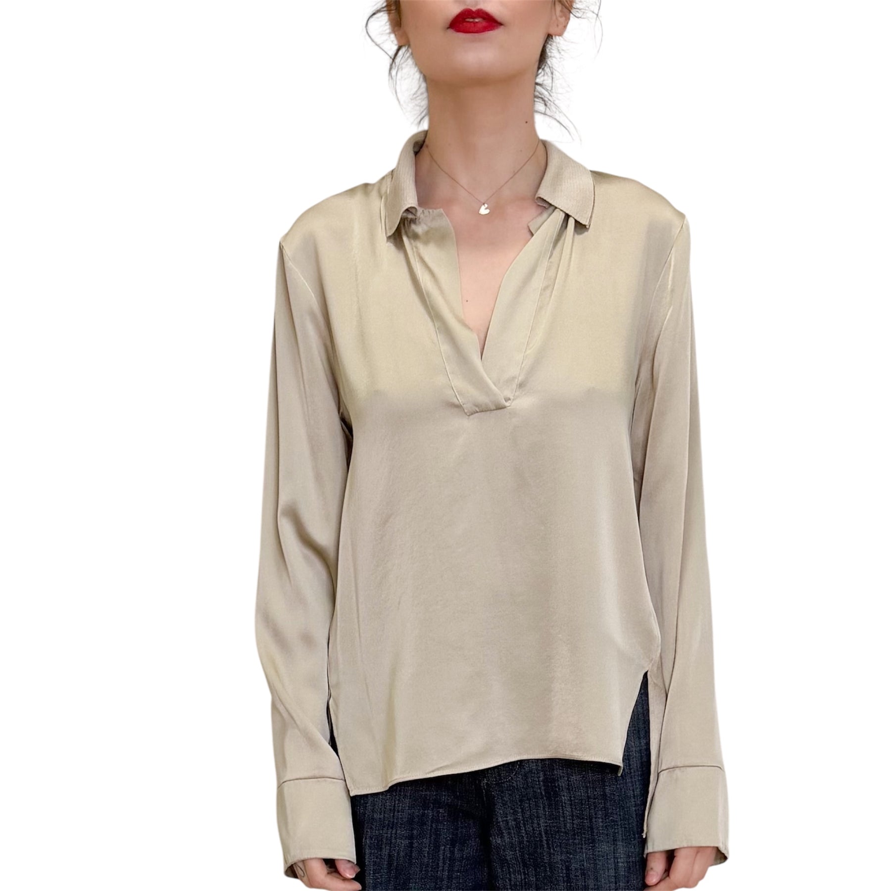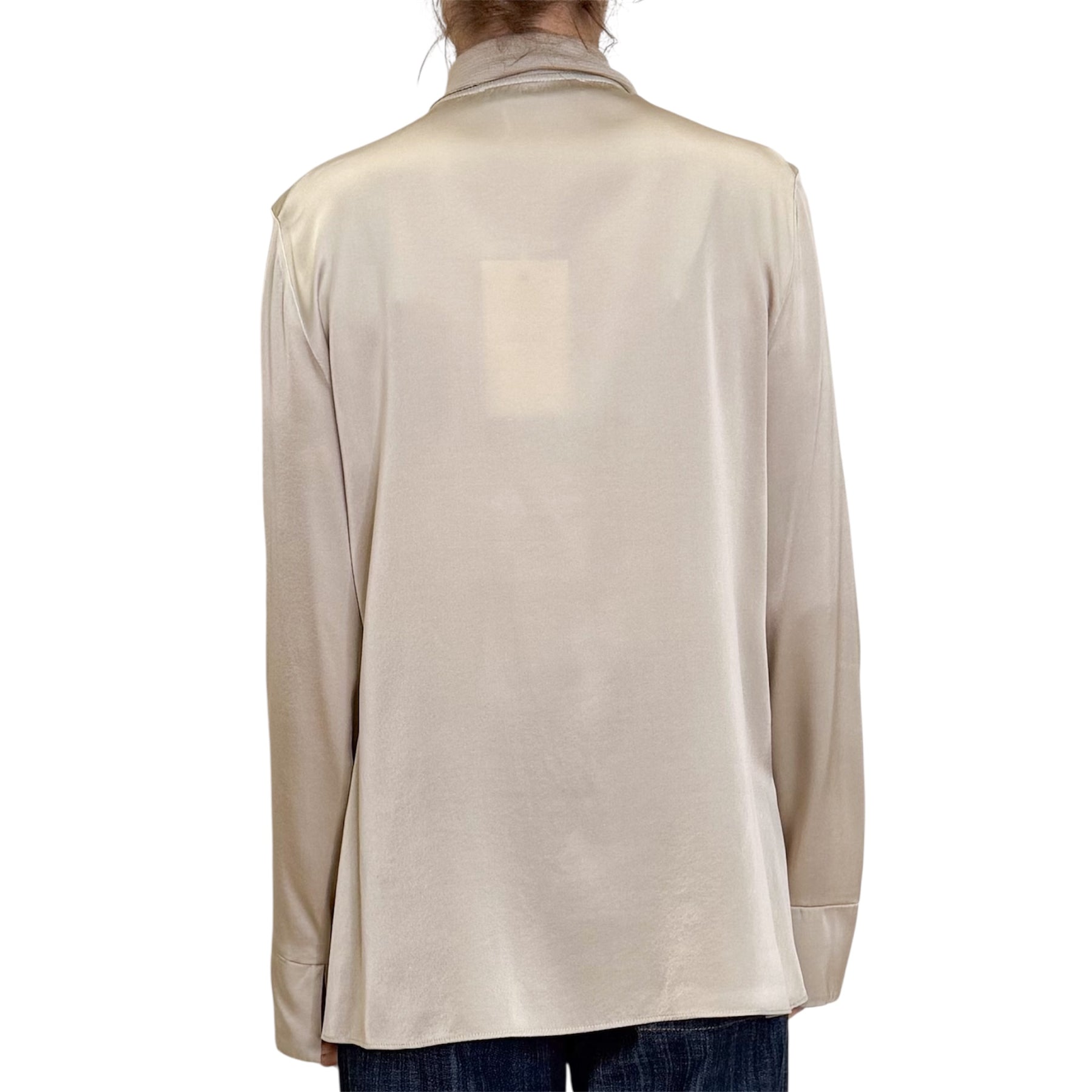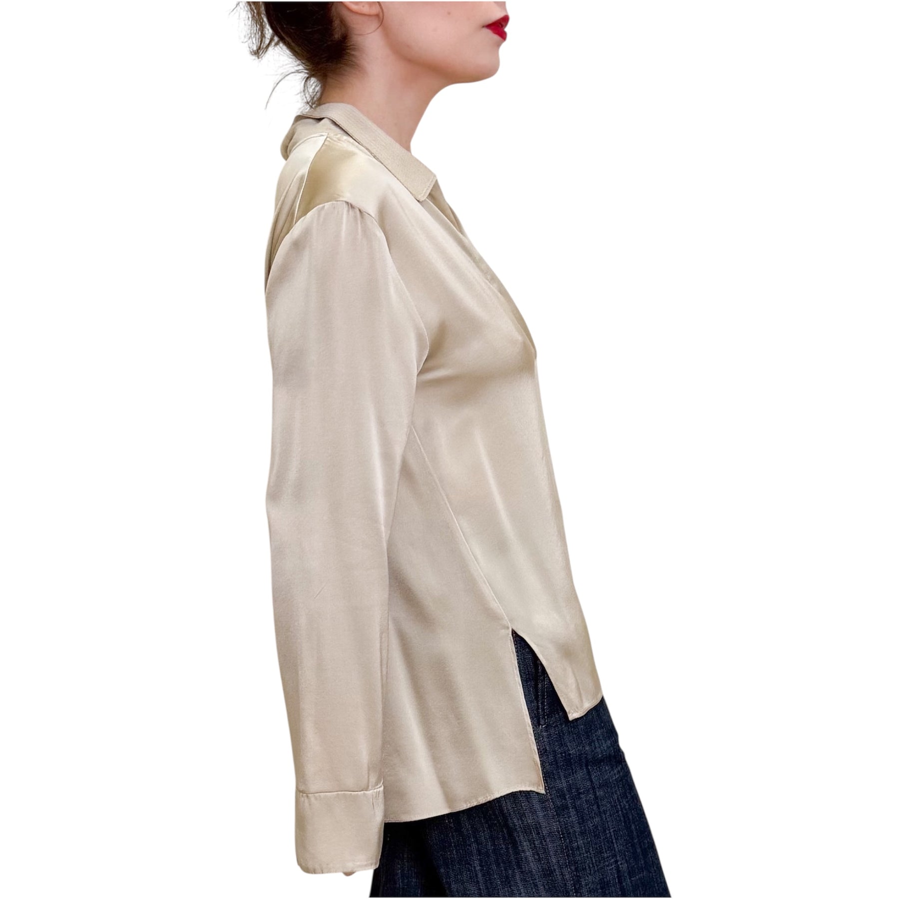 Camicia con scollo a po in raso di seta elasticizzata con linea diritta ,collo in maglia a costine e spacchetti laterali .