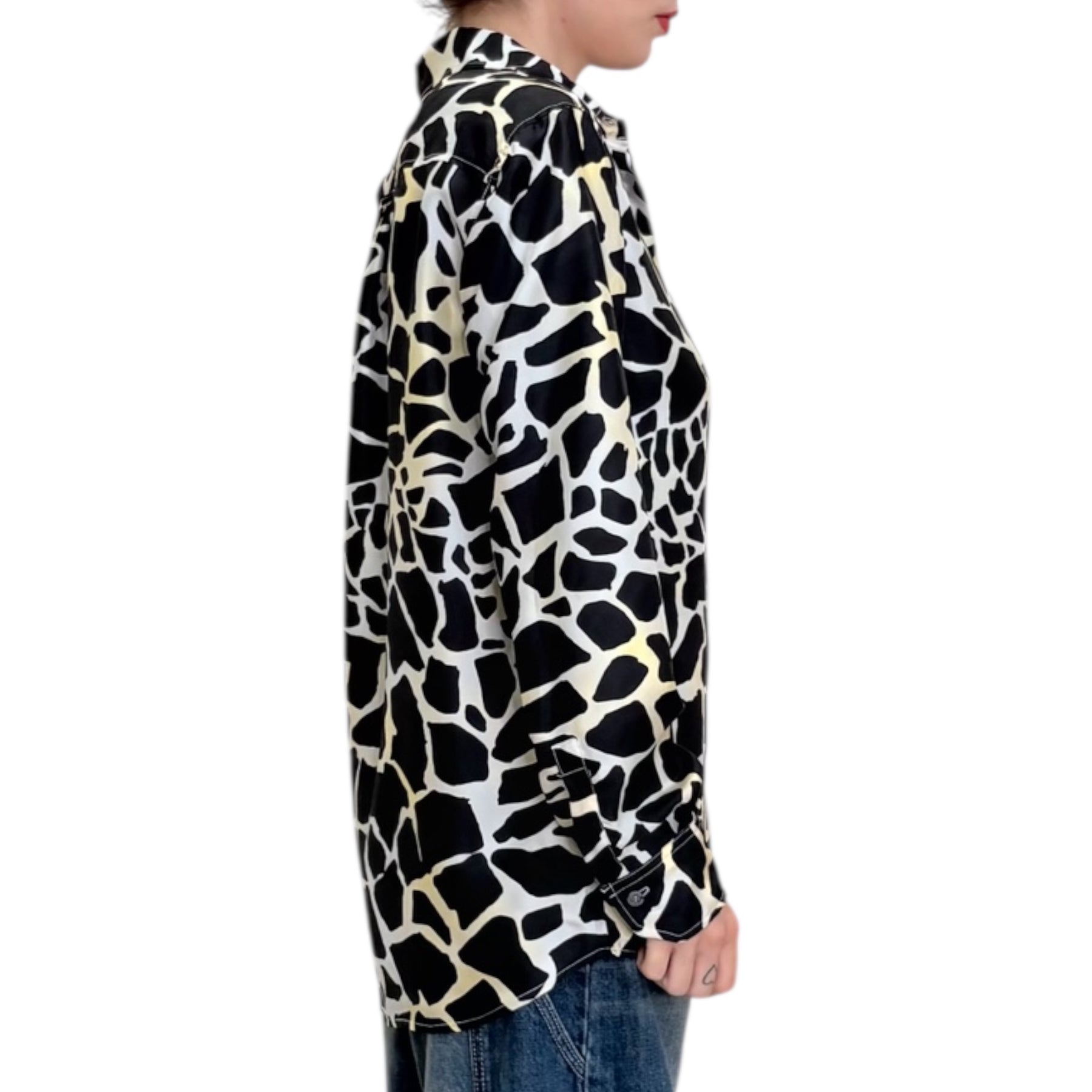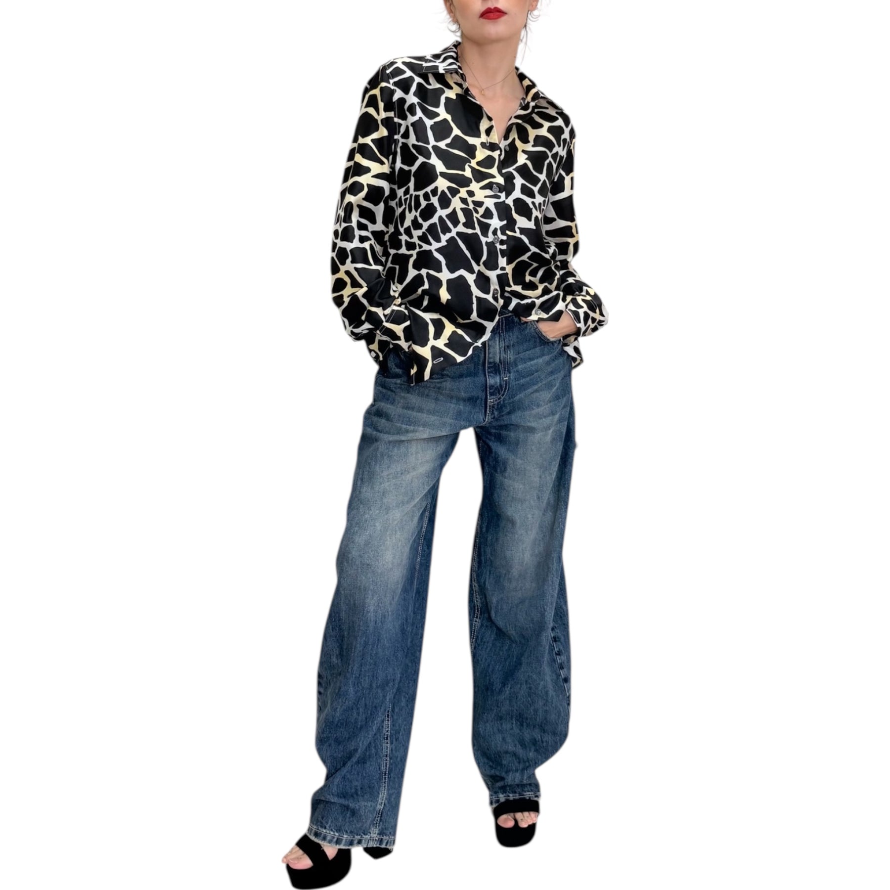 Camicia morbida in twill di seta pura con stampa geometrica bianca e nera.