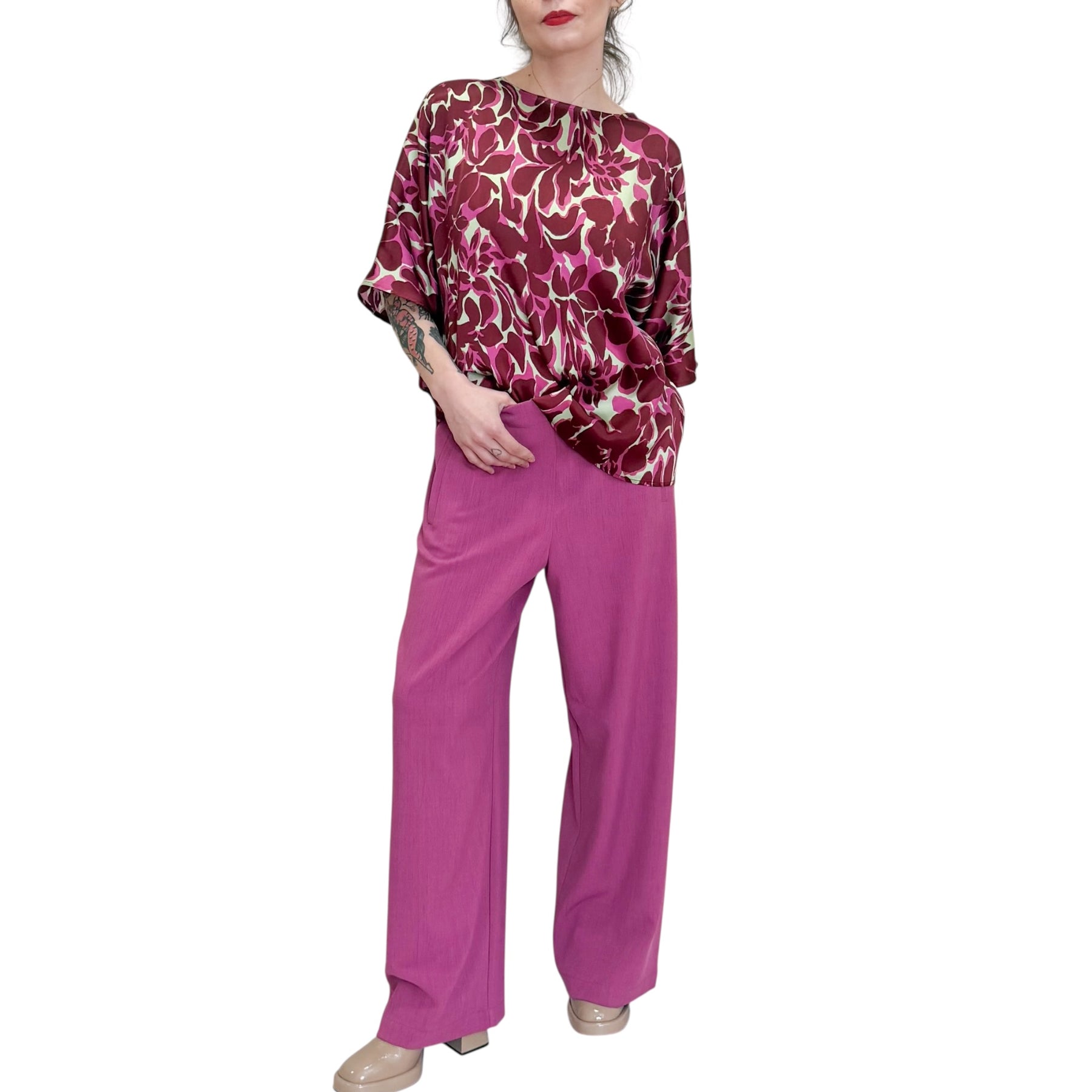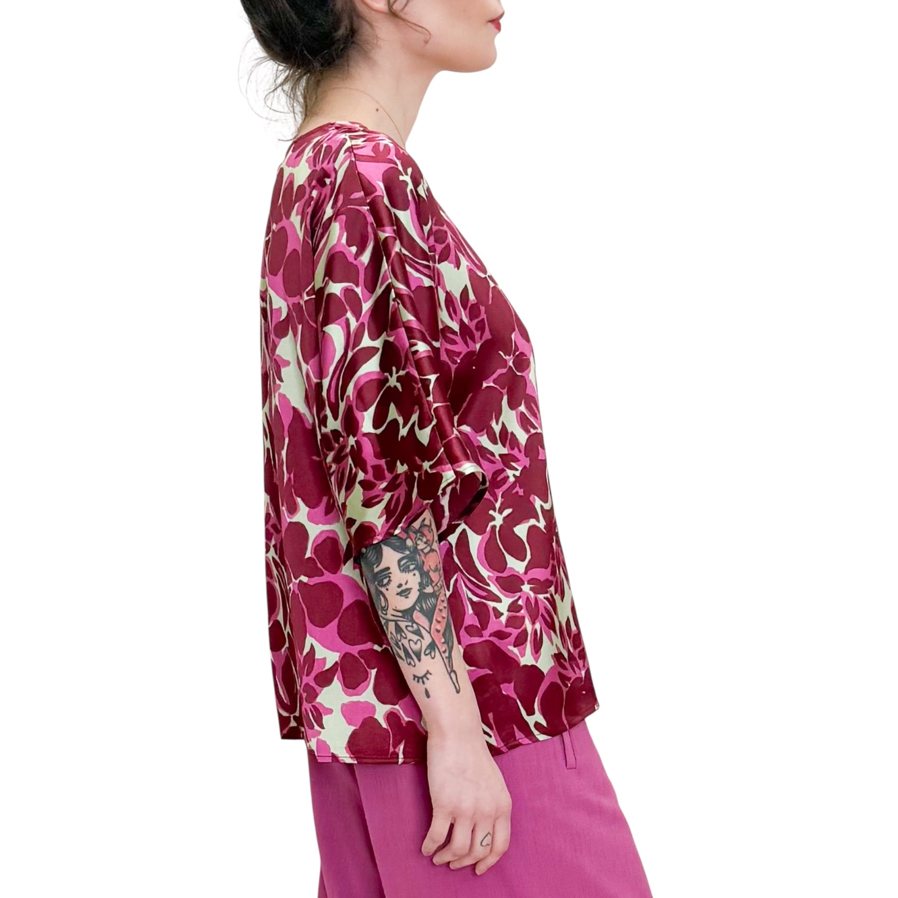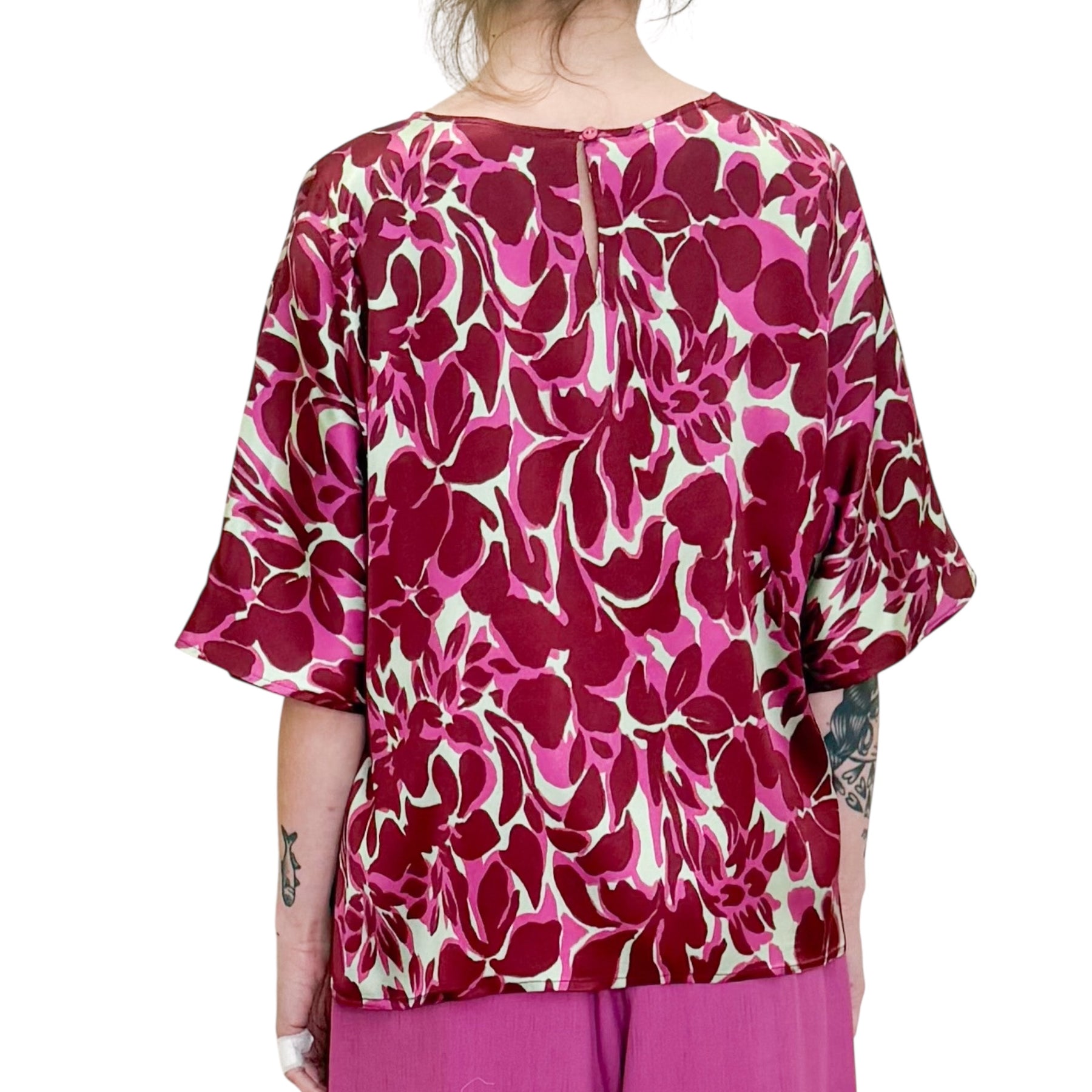 Camicia blusa in seta elasticizzata con maxi stampa floreale con collo a barchetta e manica a kimono .