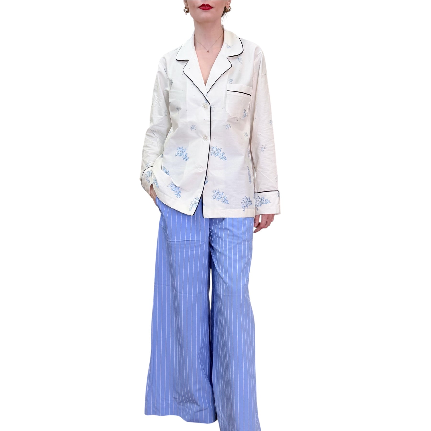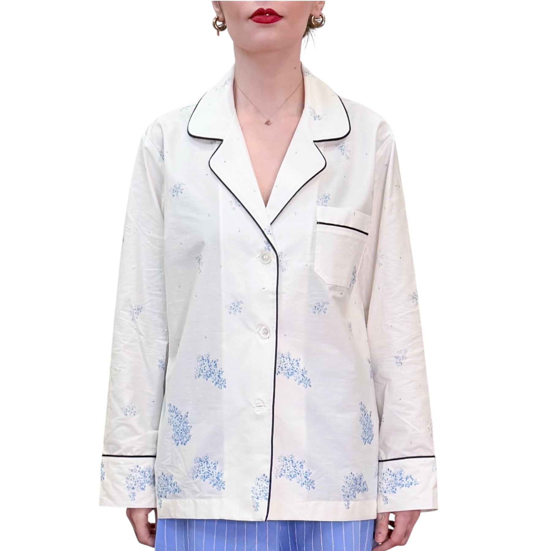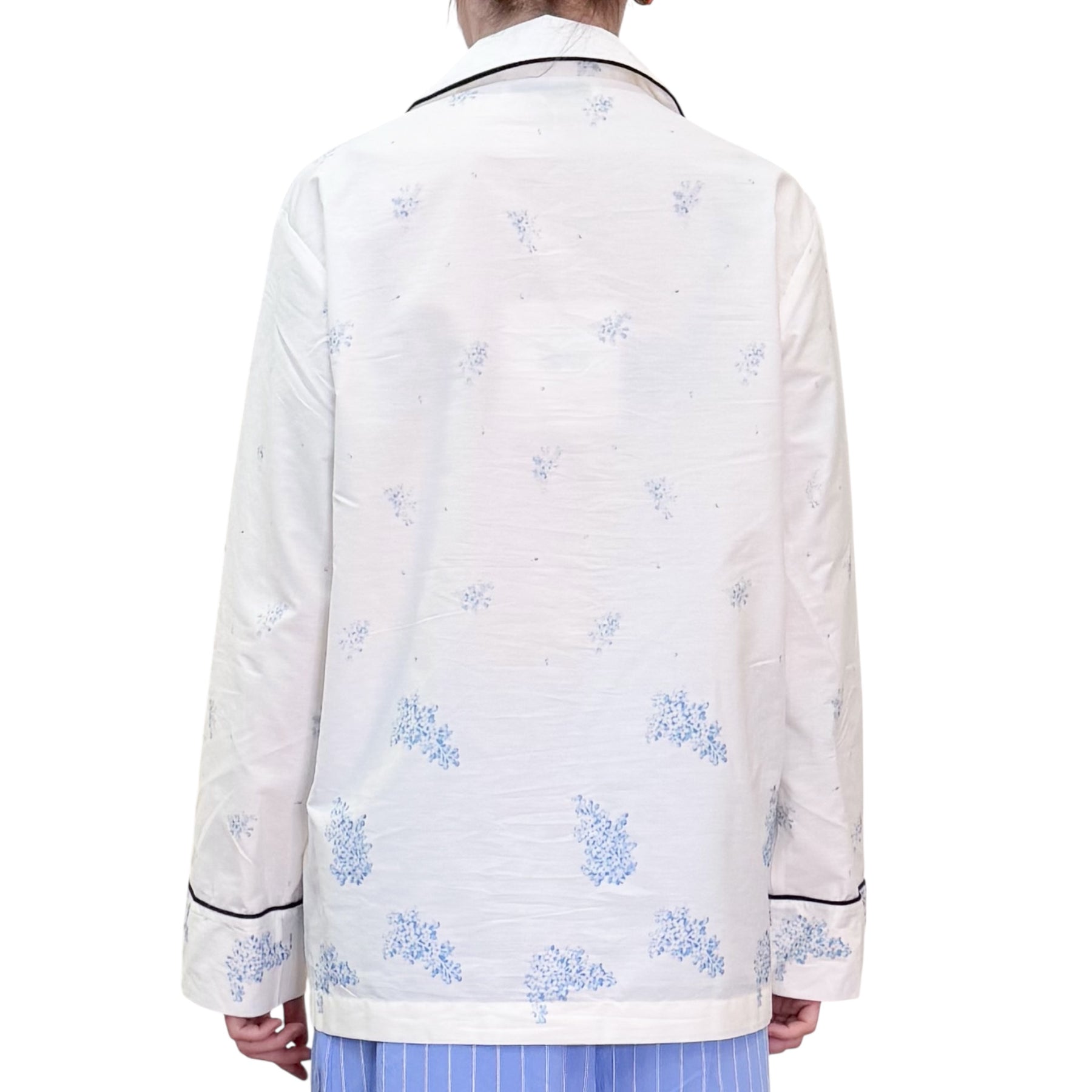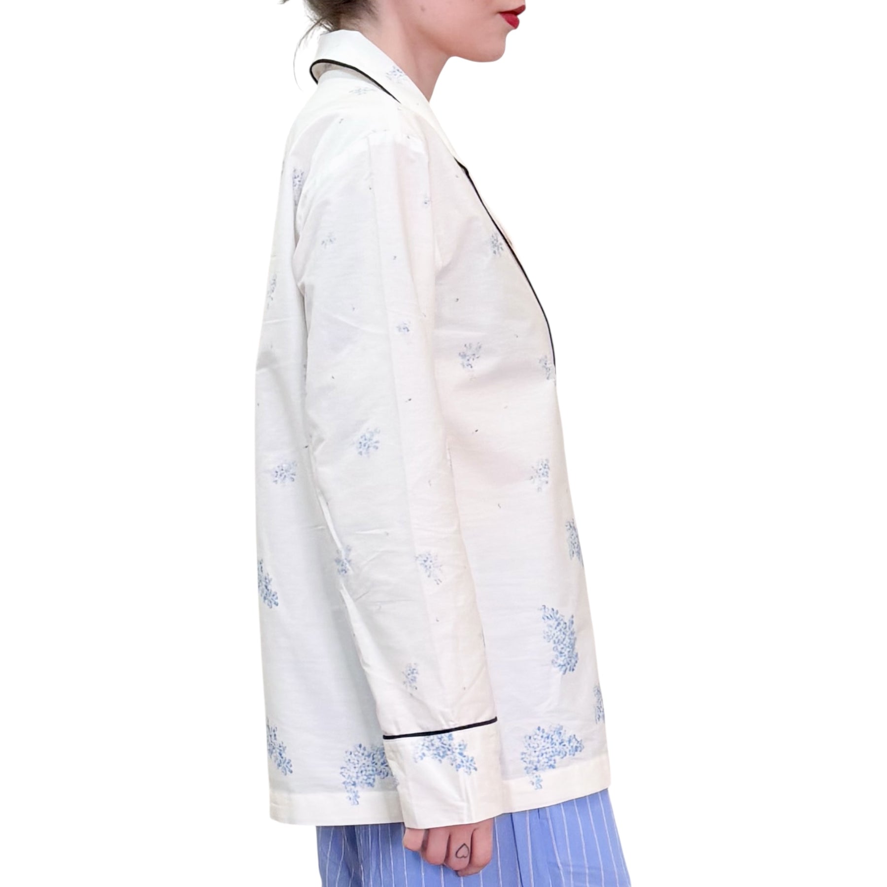 Giacca camicia con linea diritta in cotone color latte con disegno liberty floreale , tasca  a toppa e bordino in contrasto blue .