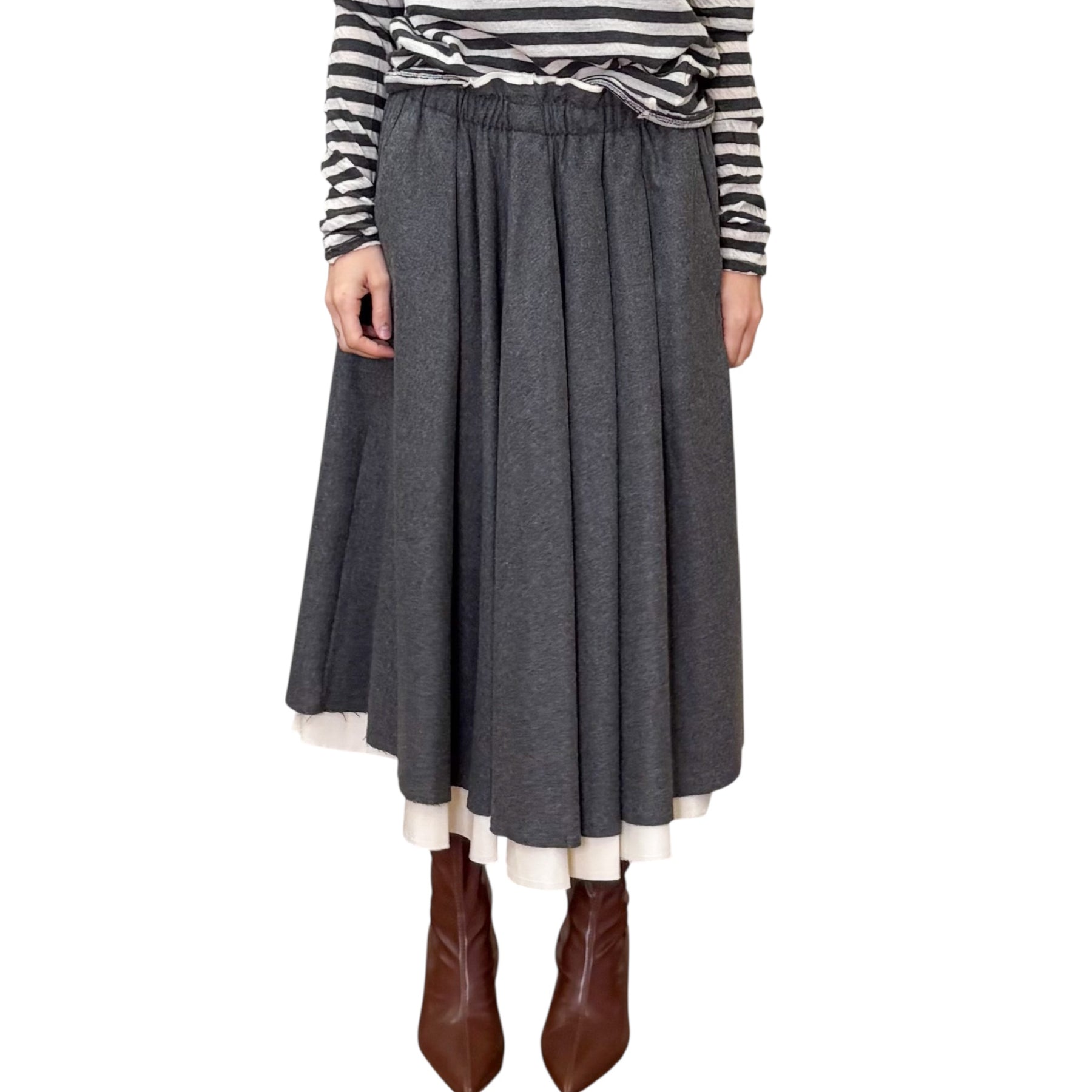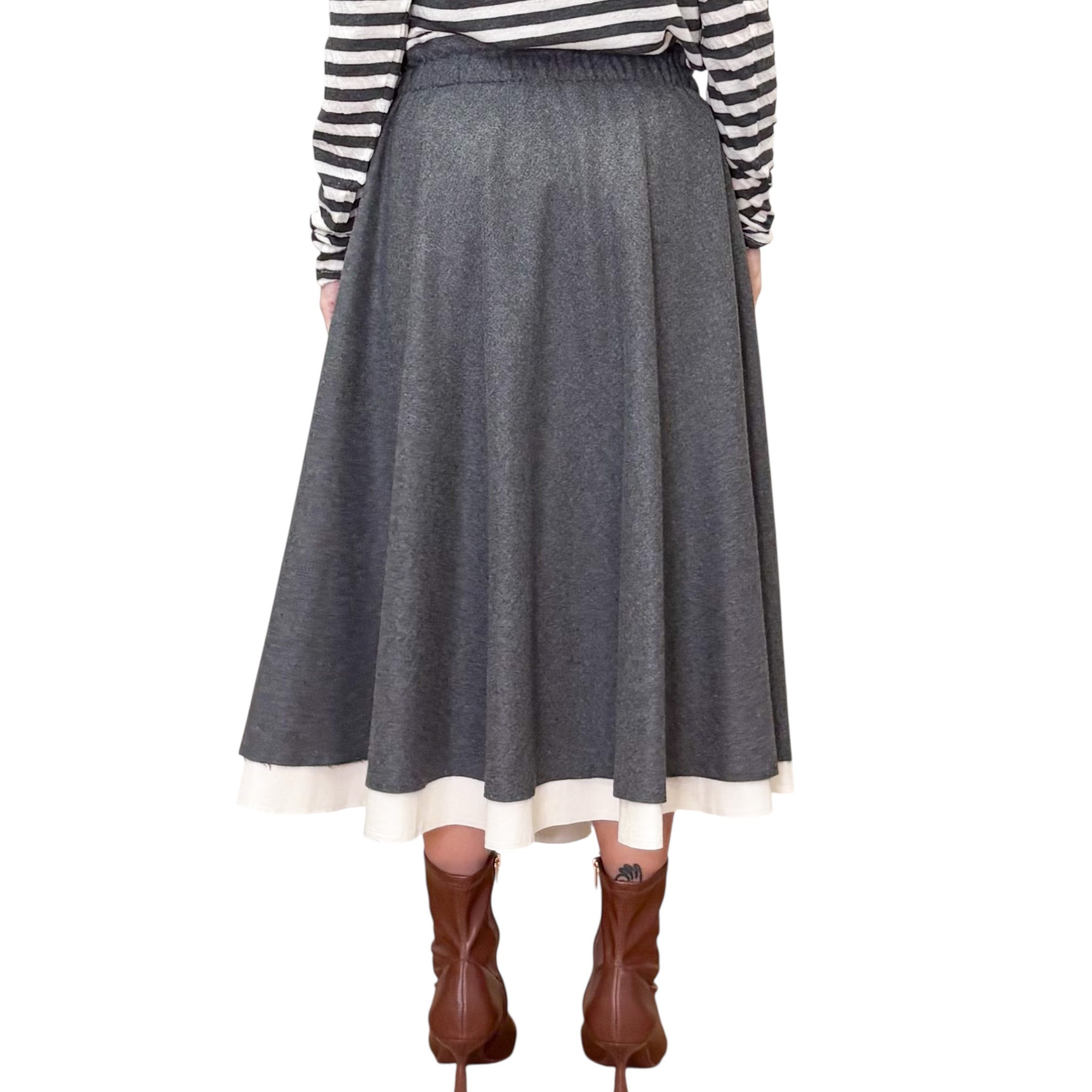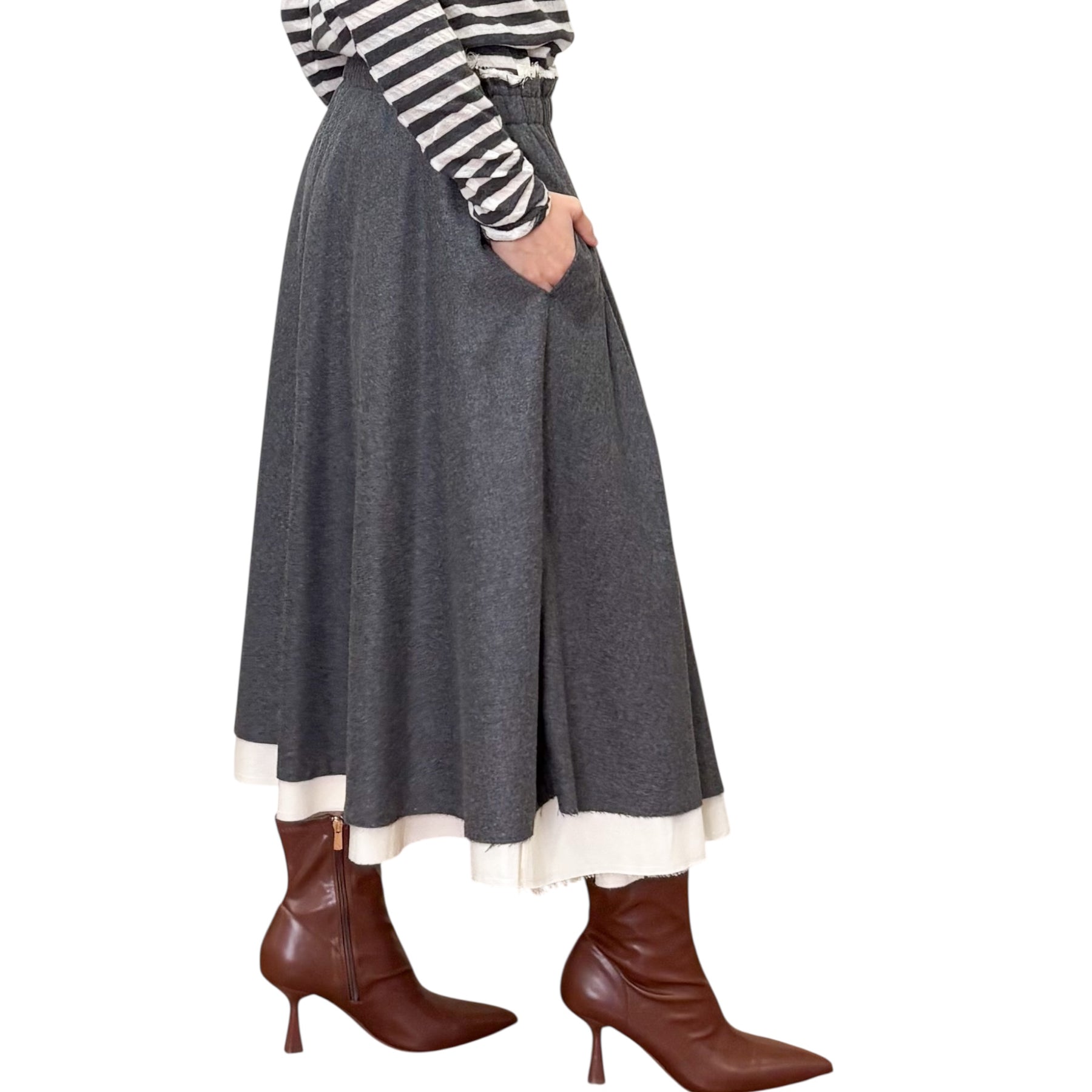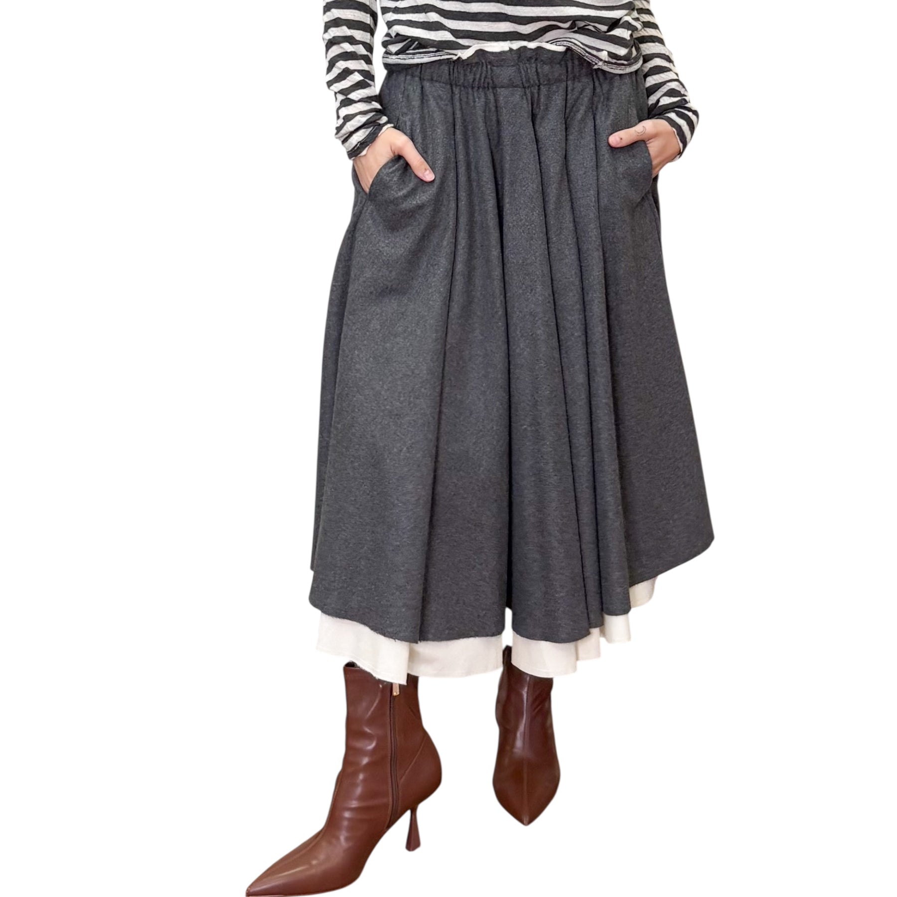 Gonna Midi a ruota con pieghe in flanella di lana vergine , viscosa ed elastam con fodera in cotone che spunta color latte , elastico in vita e tasche .