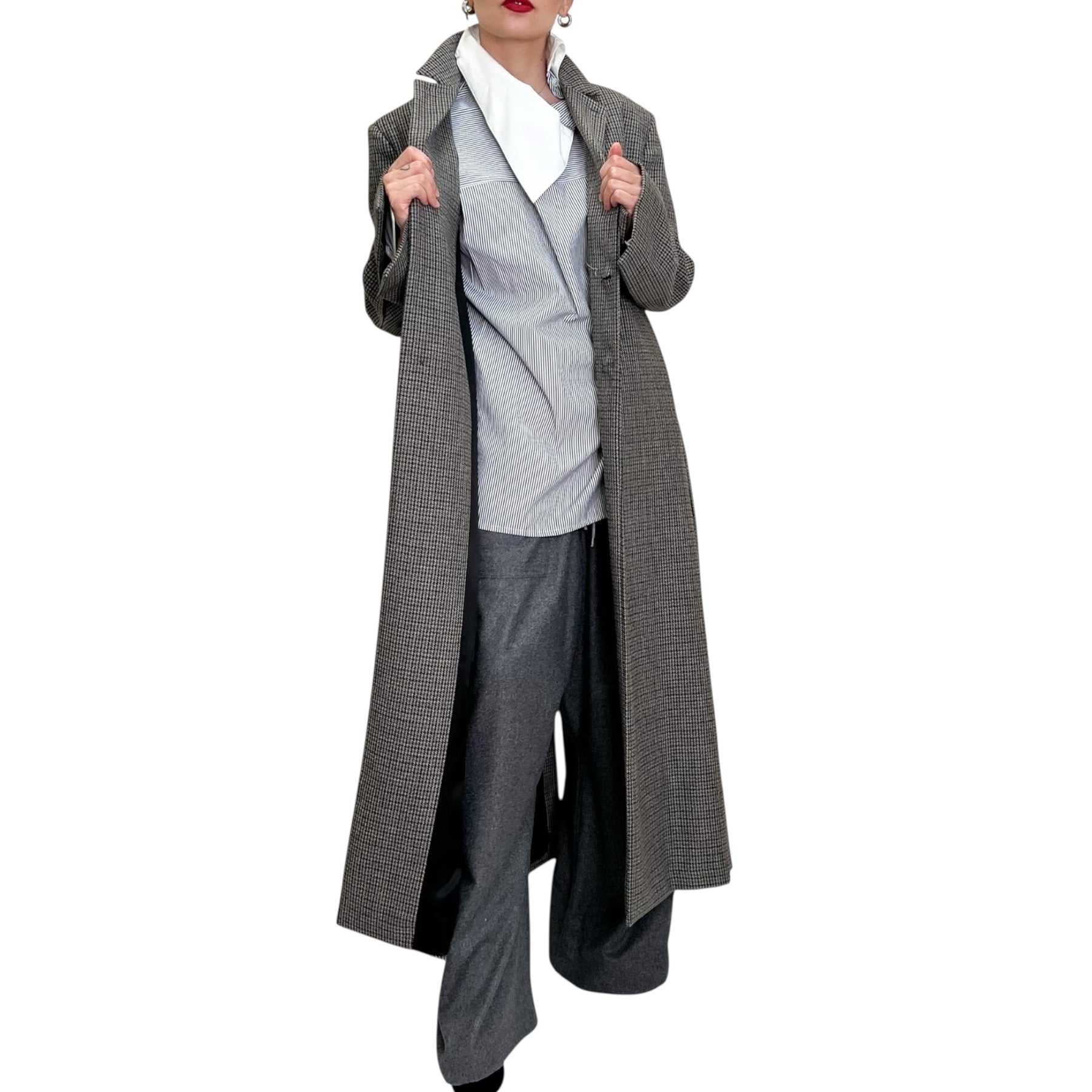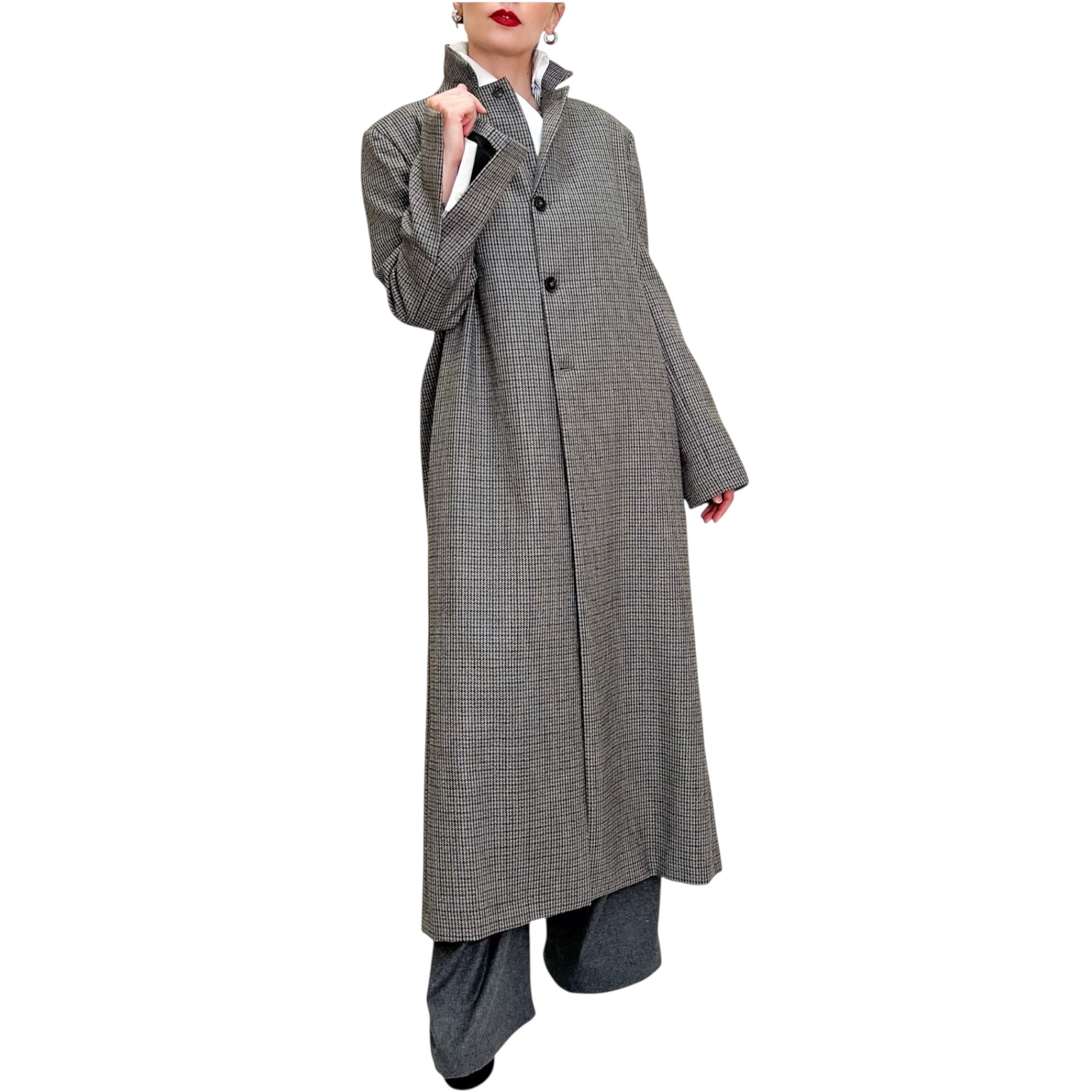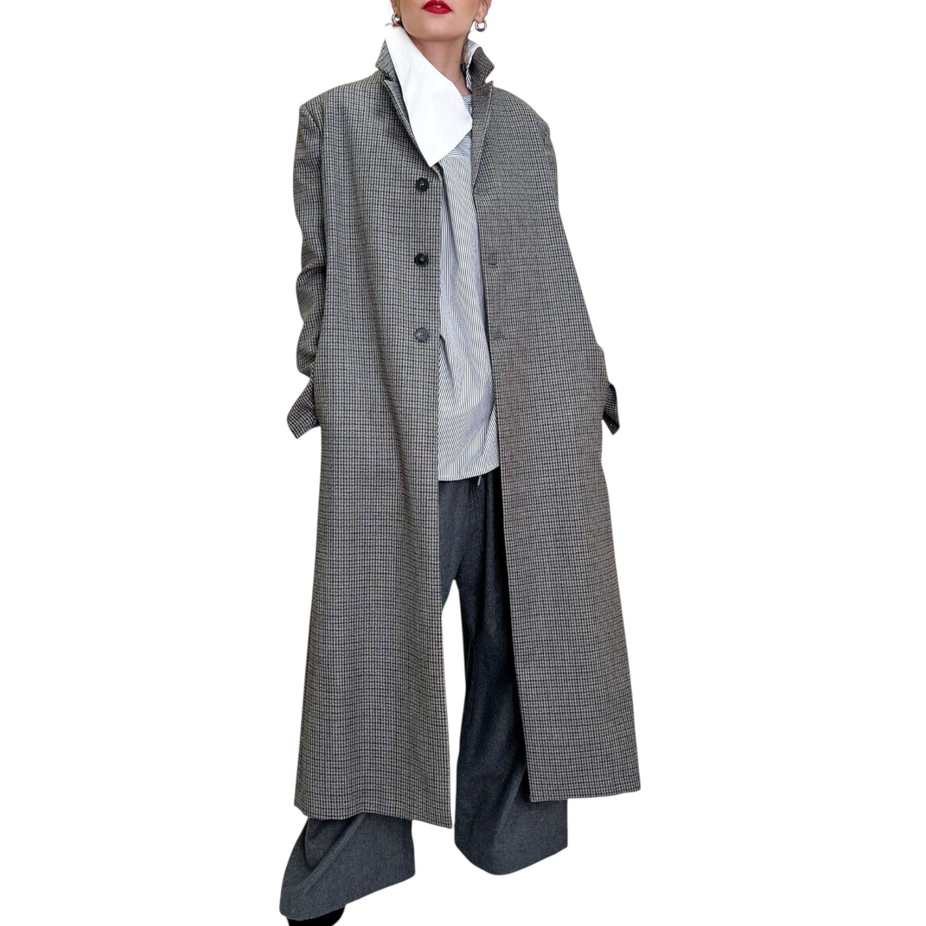 Spolverino lungo over in lana vergine pied de poule con spacco alto nel dietro e tasche .