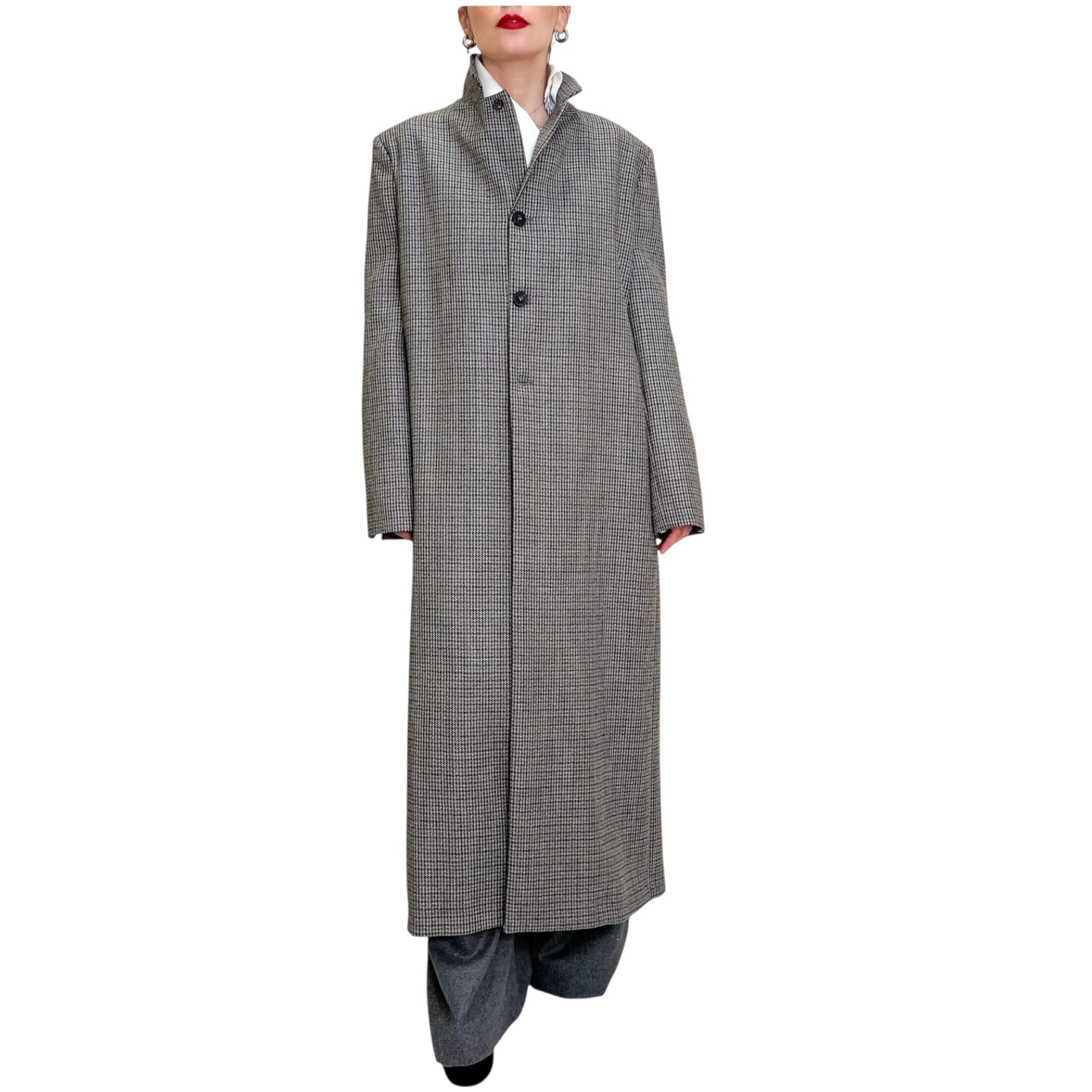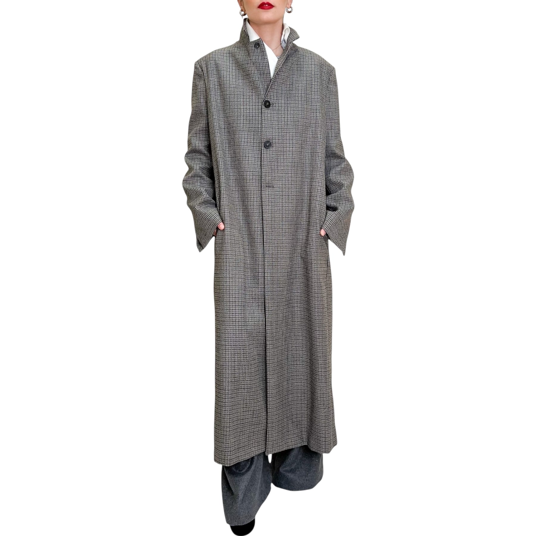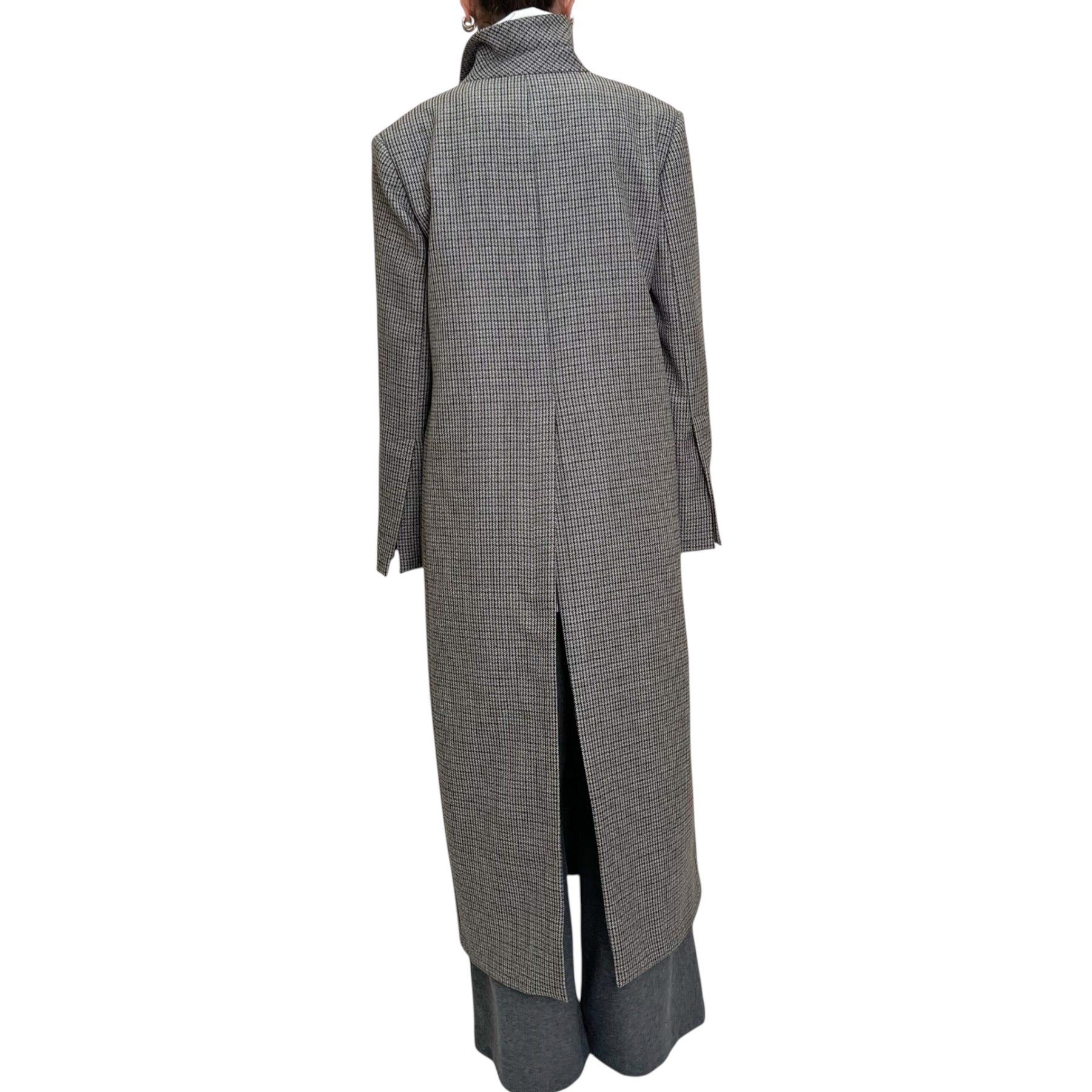 Spolverino lungo over in lana vergine pied de poule con spacco alto nel dietro e tasche .