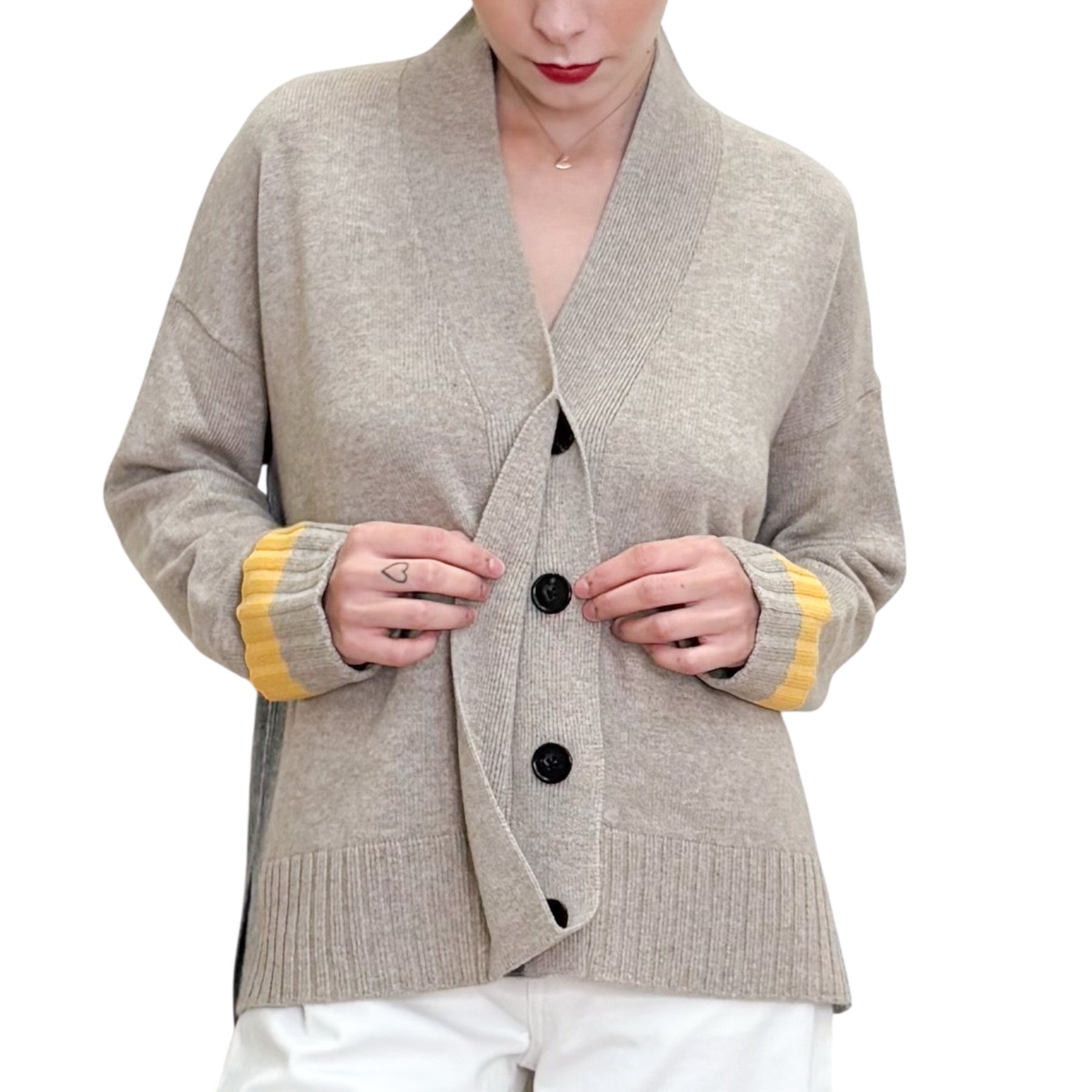 Cardigan over con spacchi laterali in cachemire e lana , scollo a V , allacciatura nascosta e risvolto nei polsi con bordino in contrasto giallo .