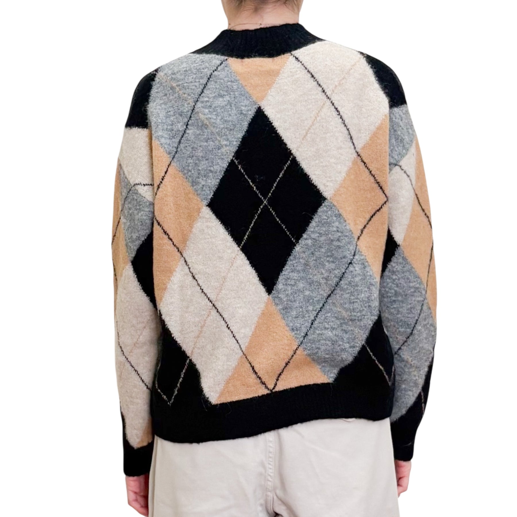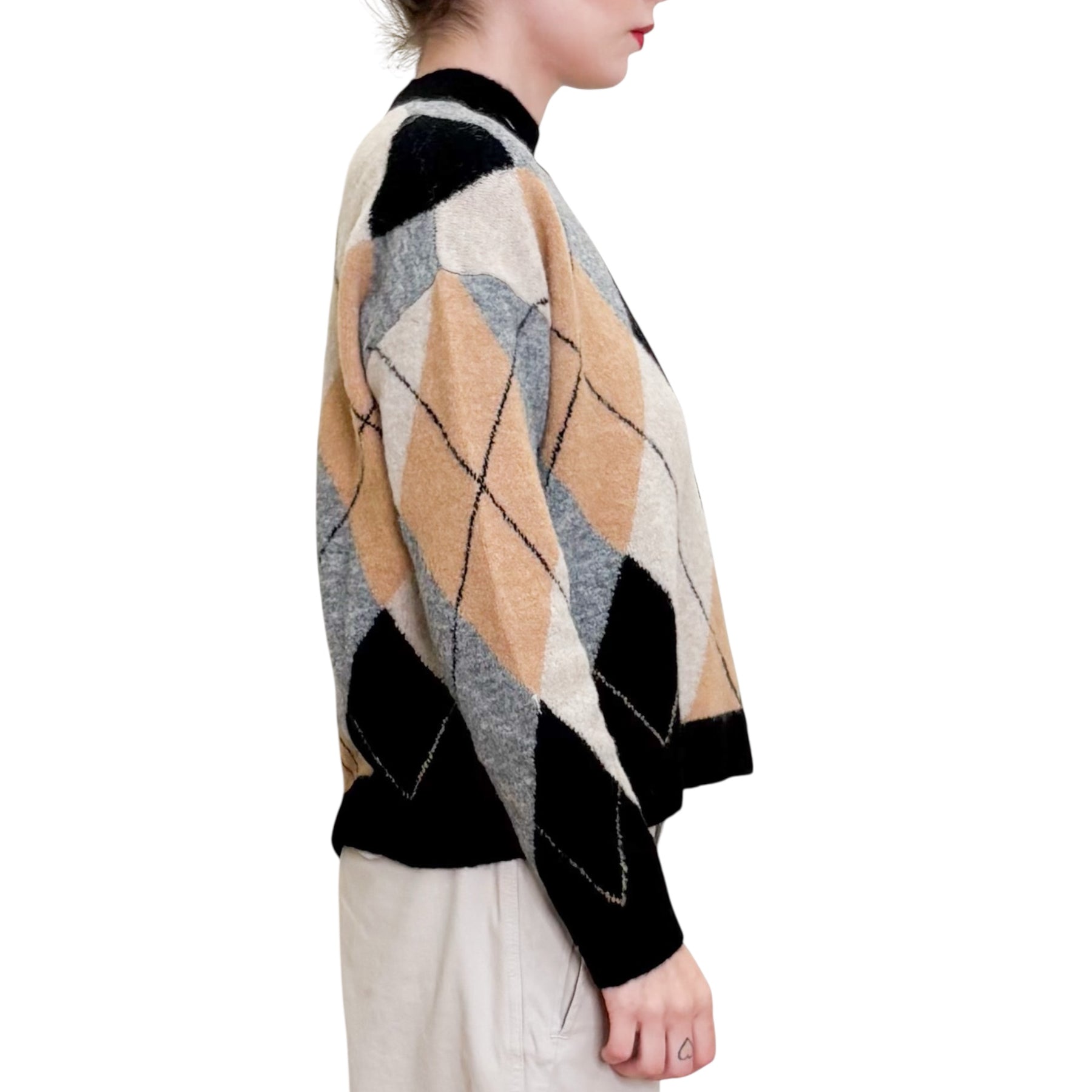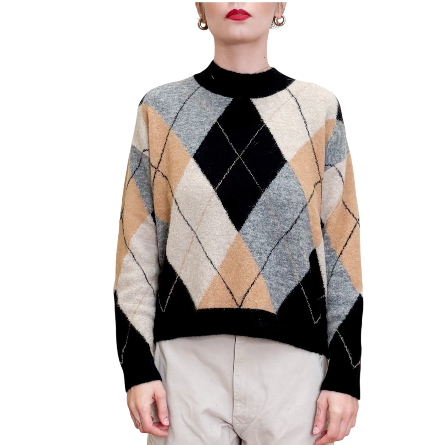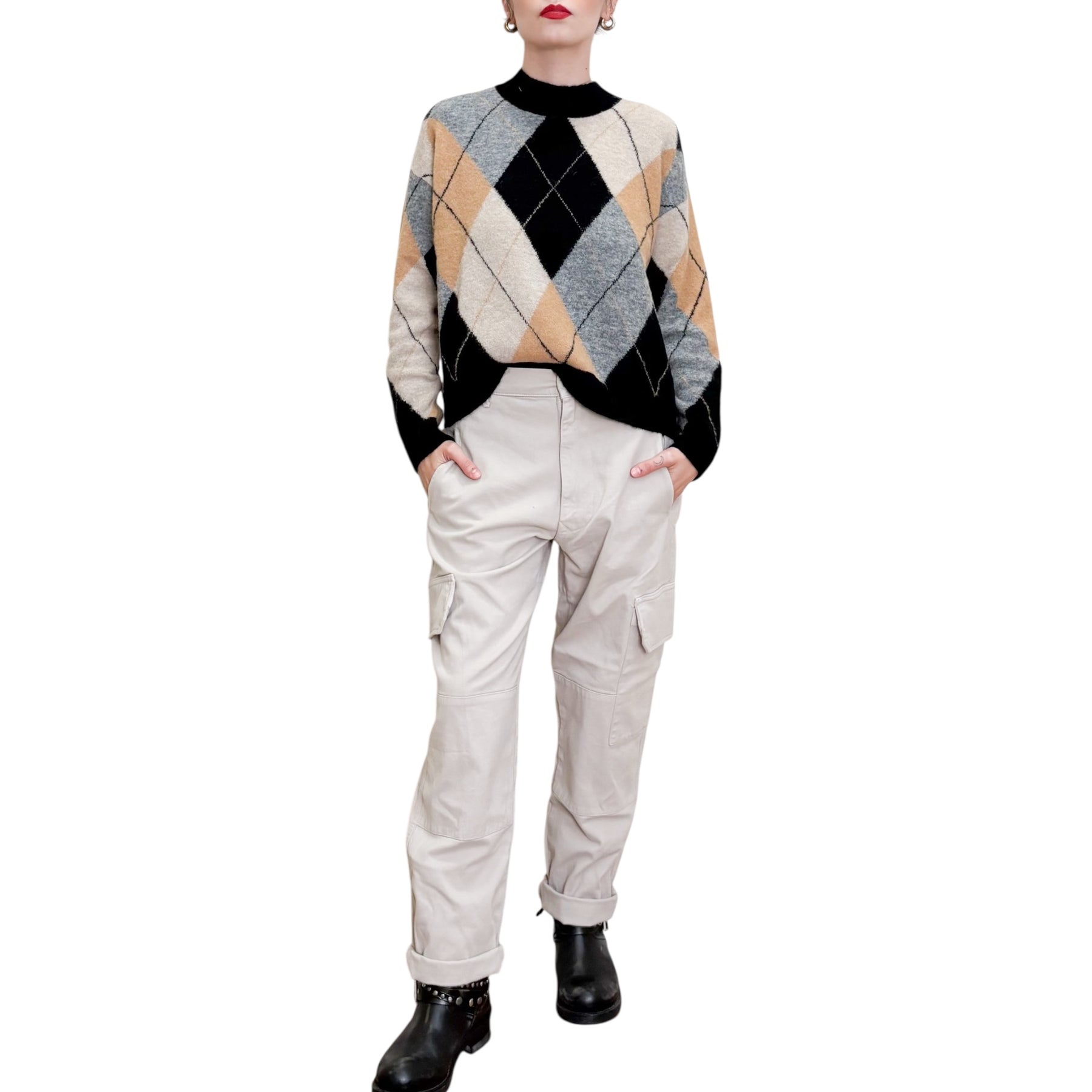 Maglia girocollo in alpaca elasticizzata con losanghe grigie , nere , cammello e panna .