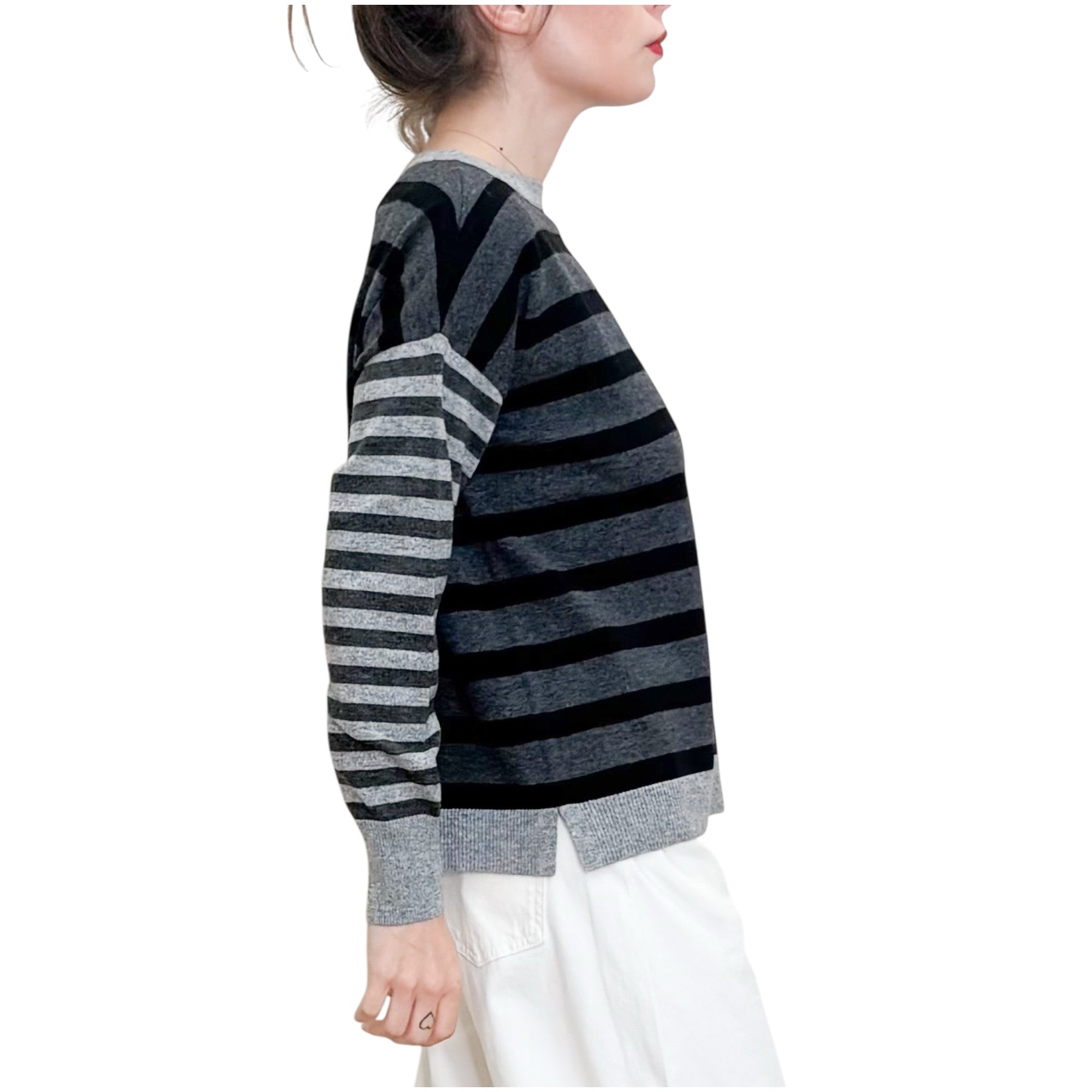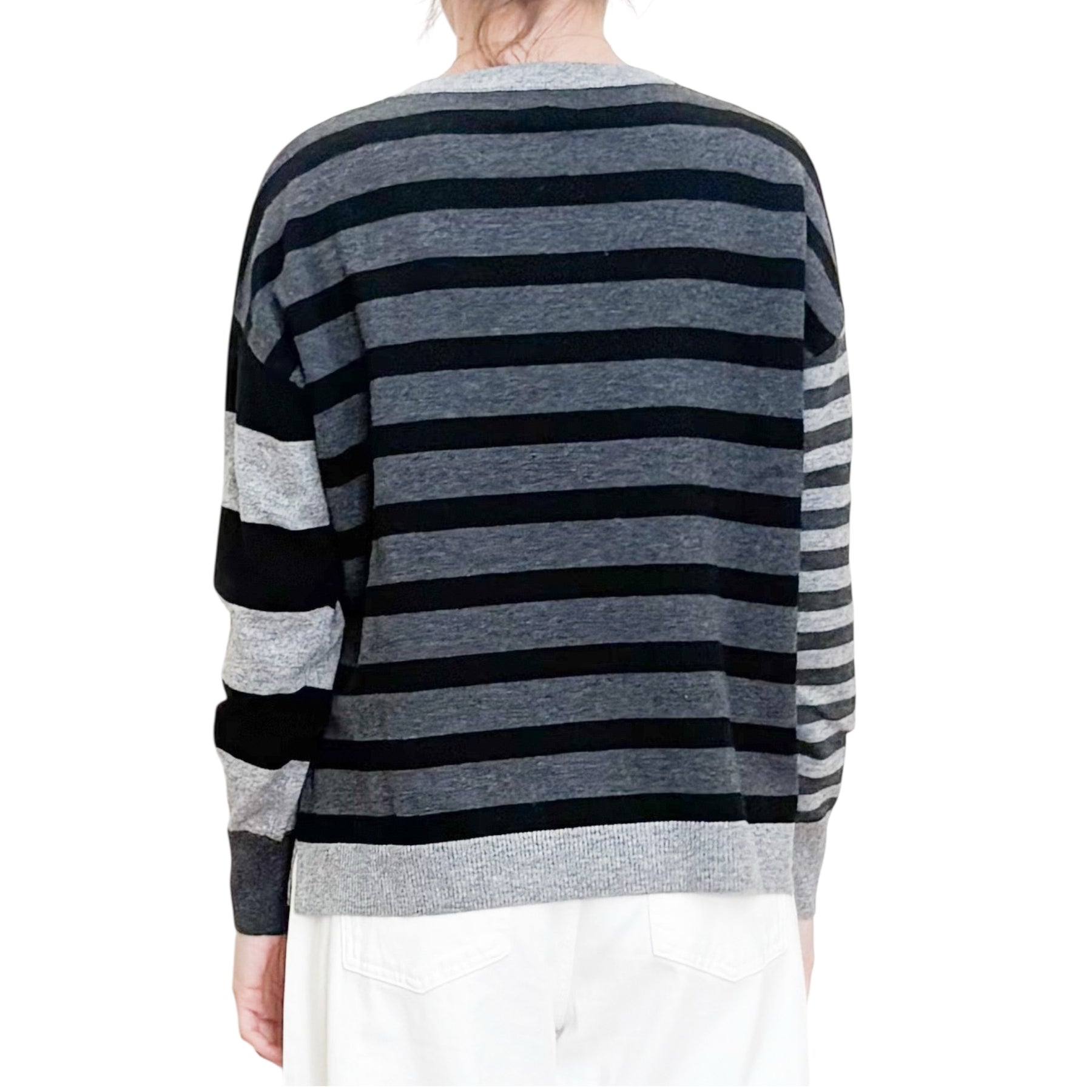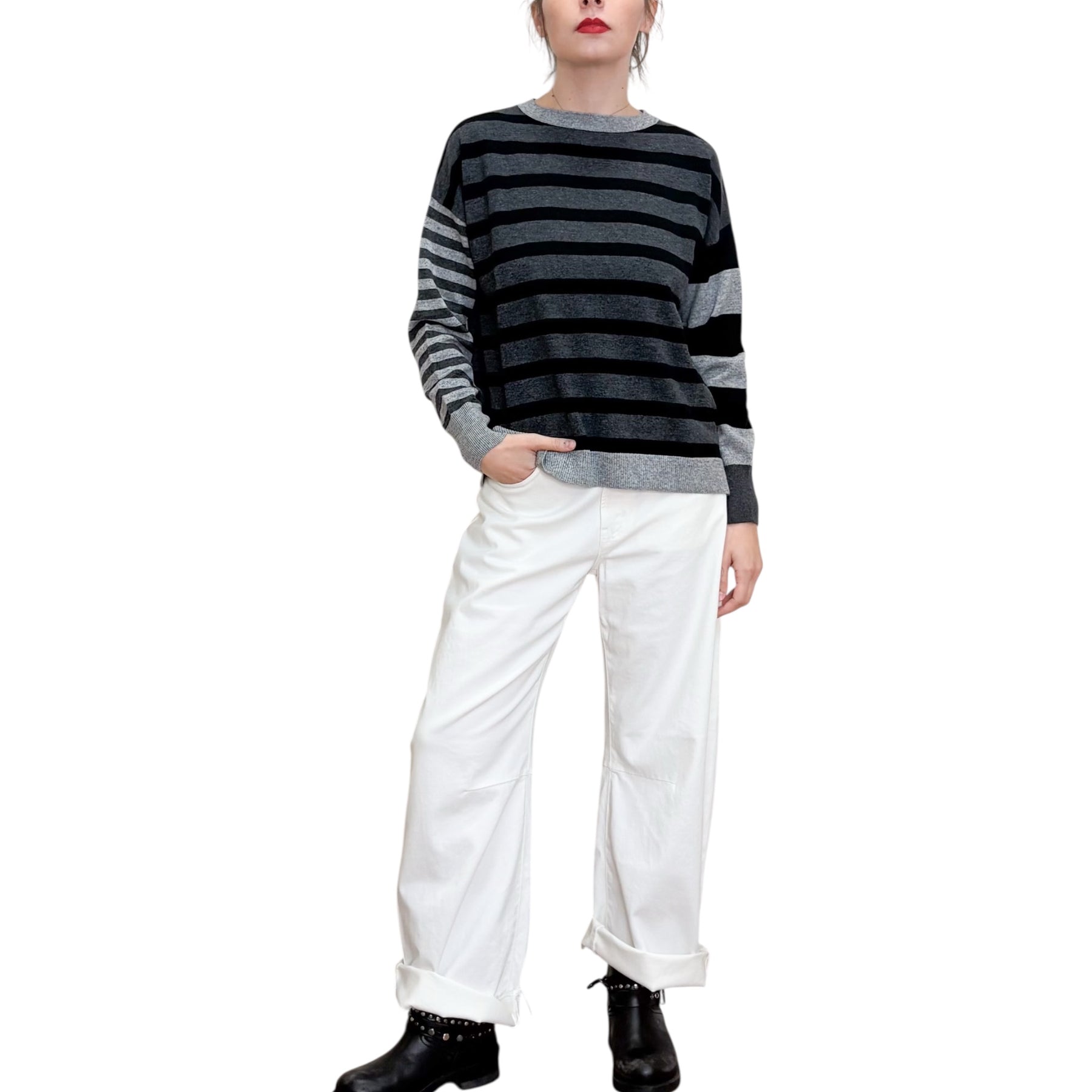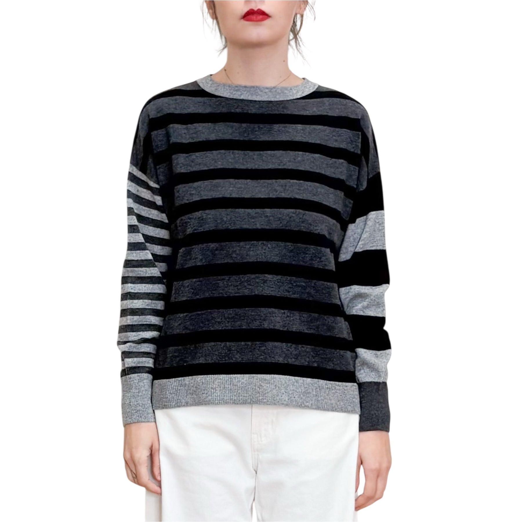 Maglia girocollo in lana e cachemire con linea morbida a righe grigio chiaro , antracite e nero .