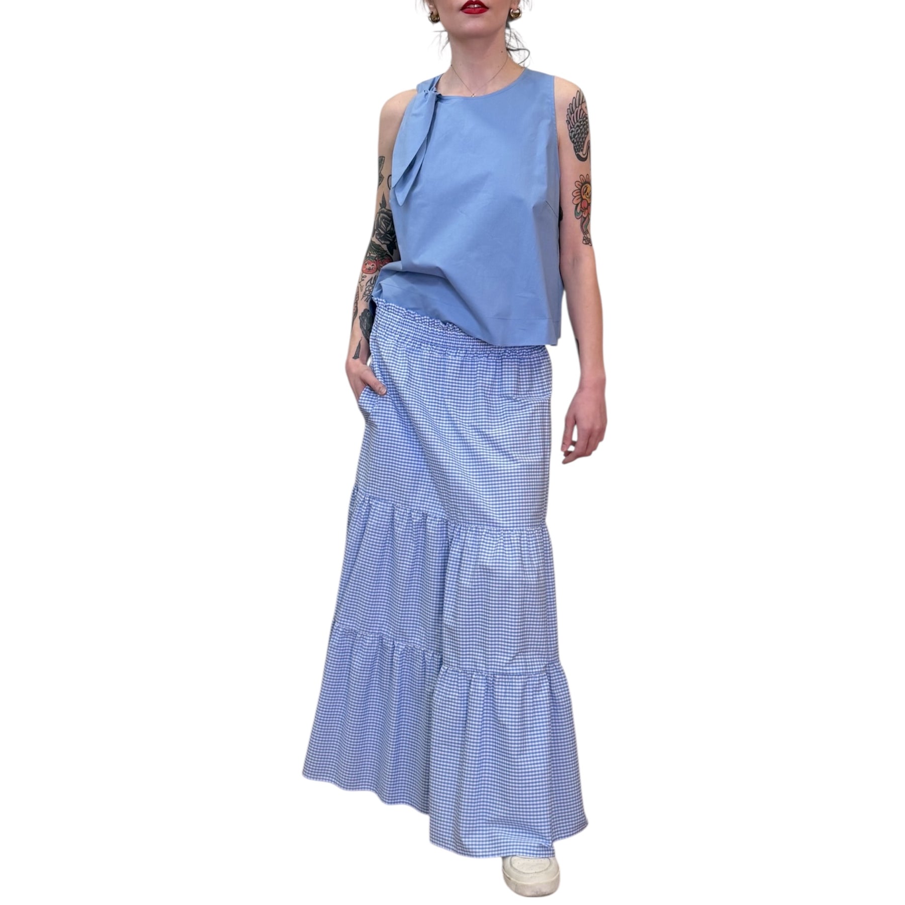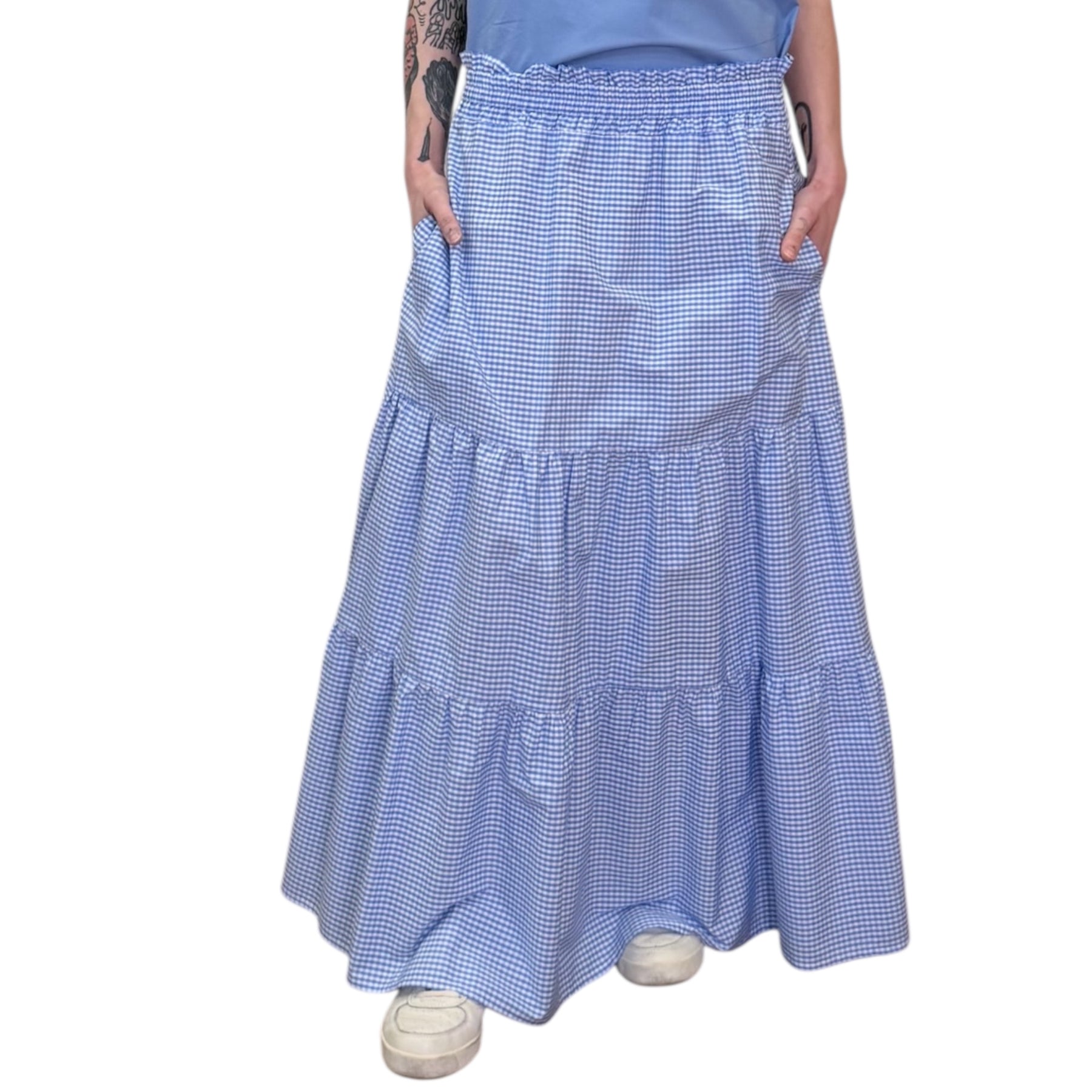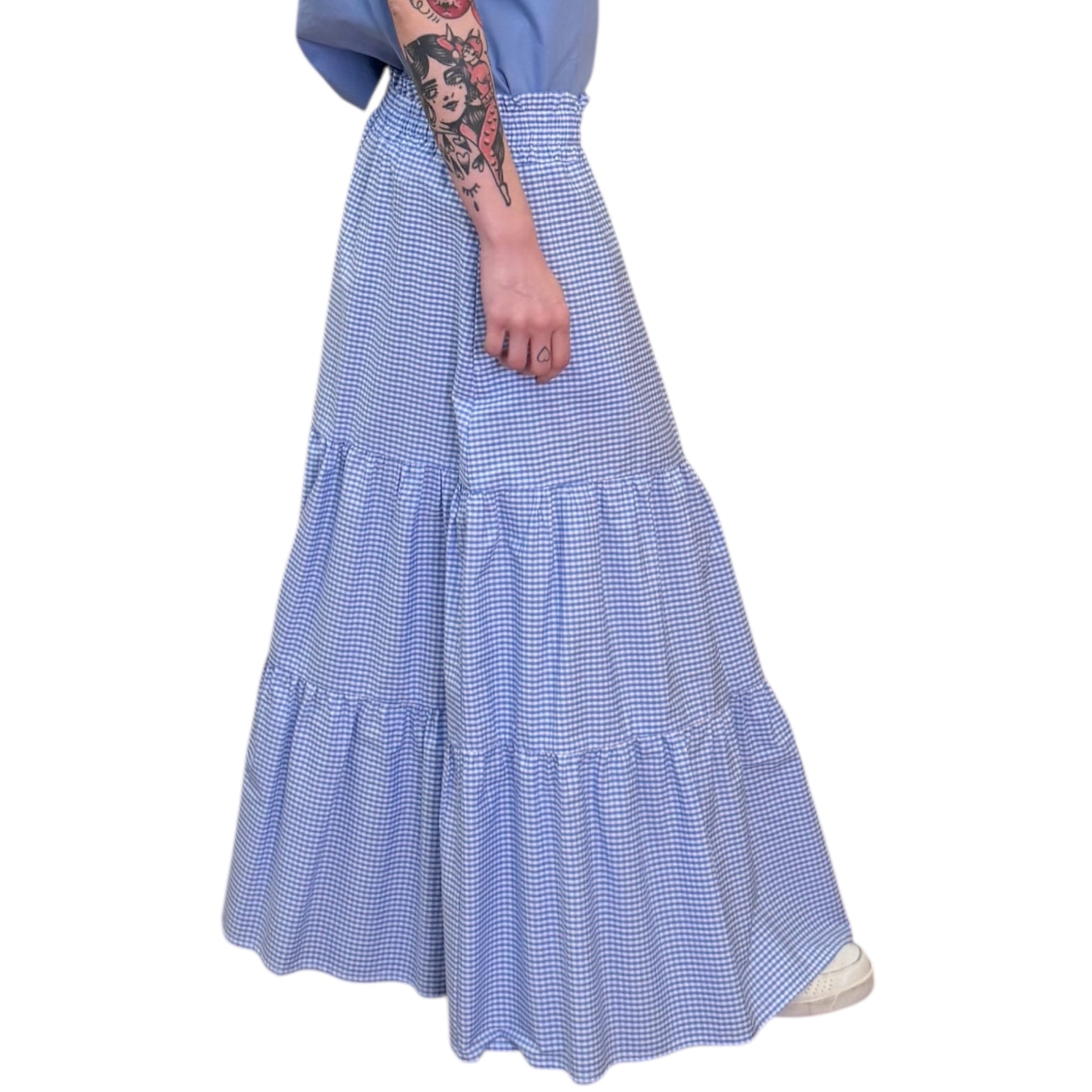 Gonna lunga a balze in mussola di cotone Vichy bianca e azzurra con elastico in vita e tasche .