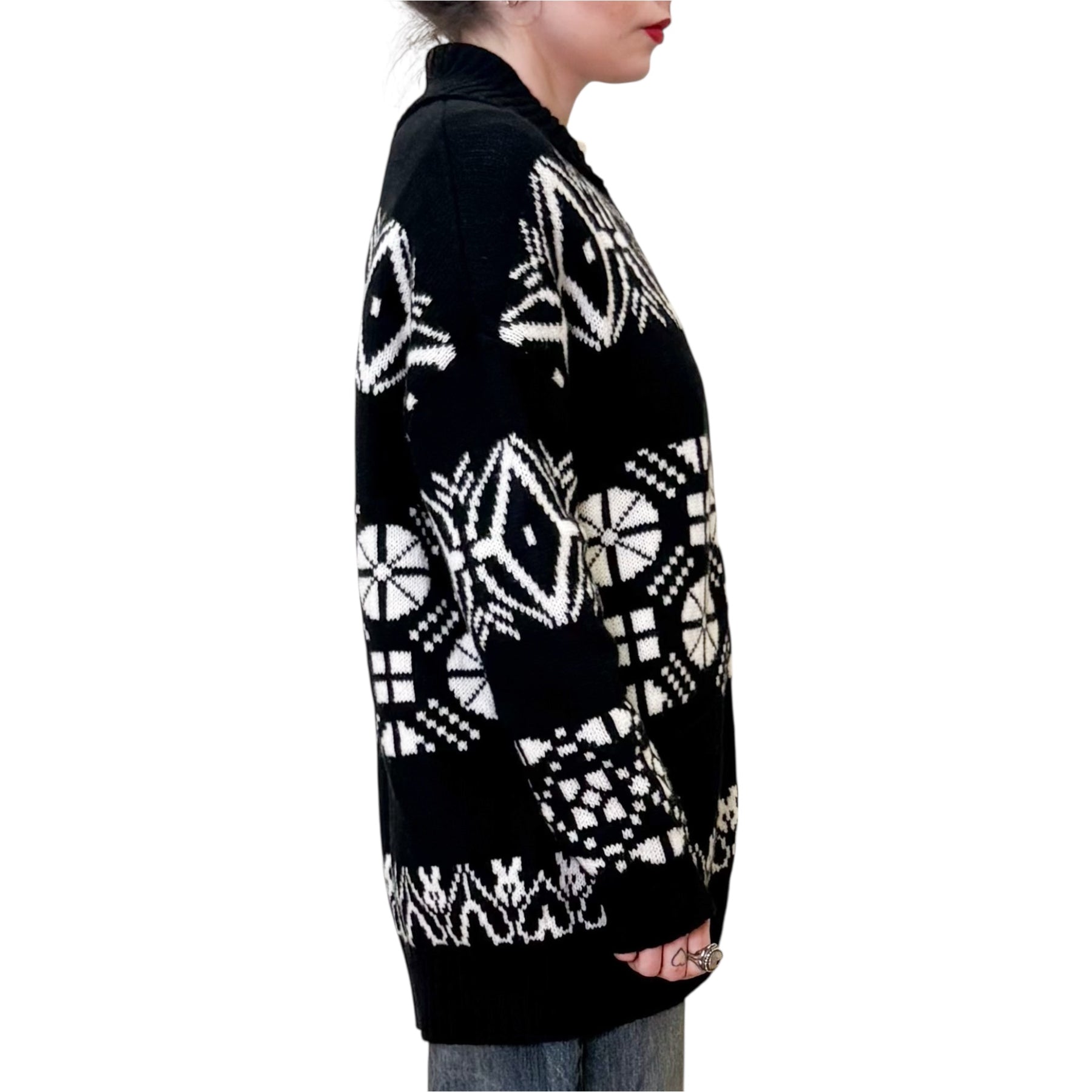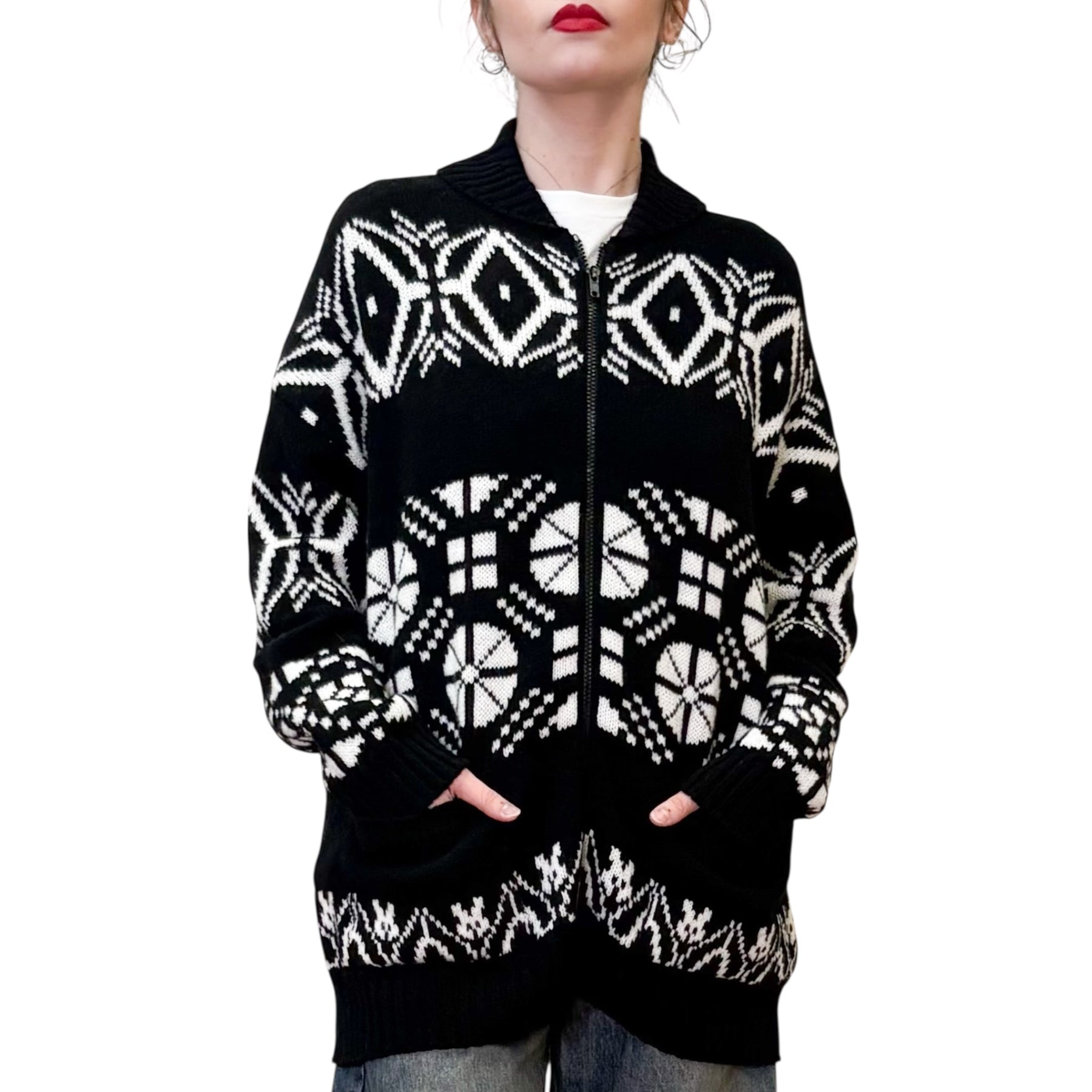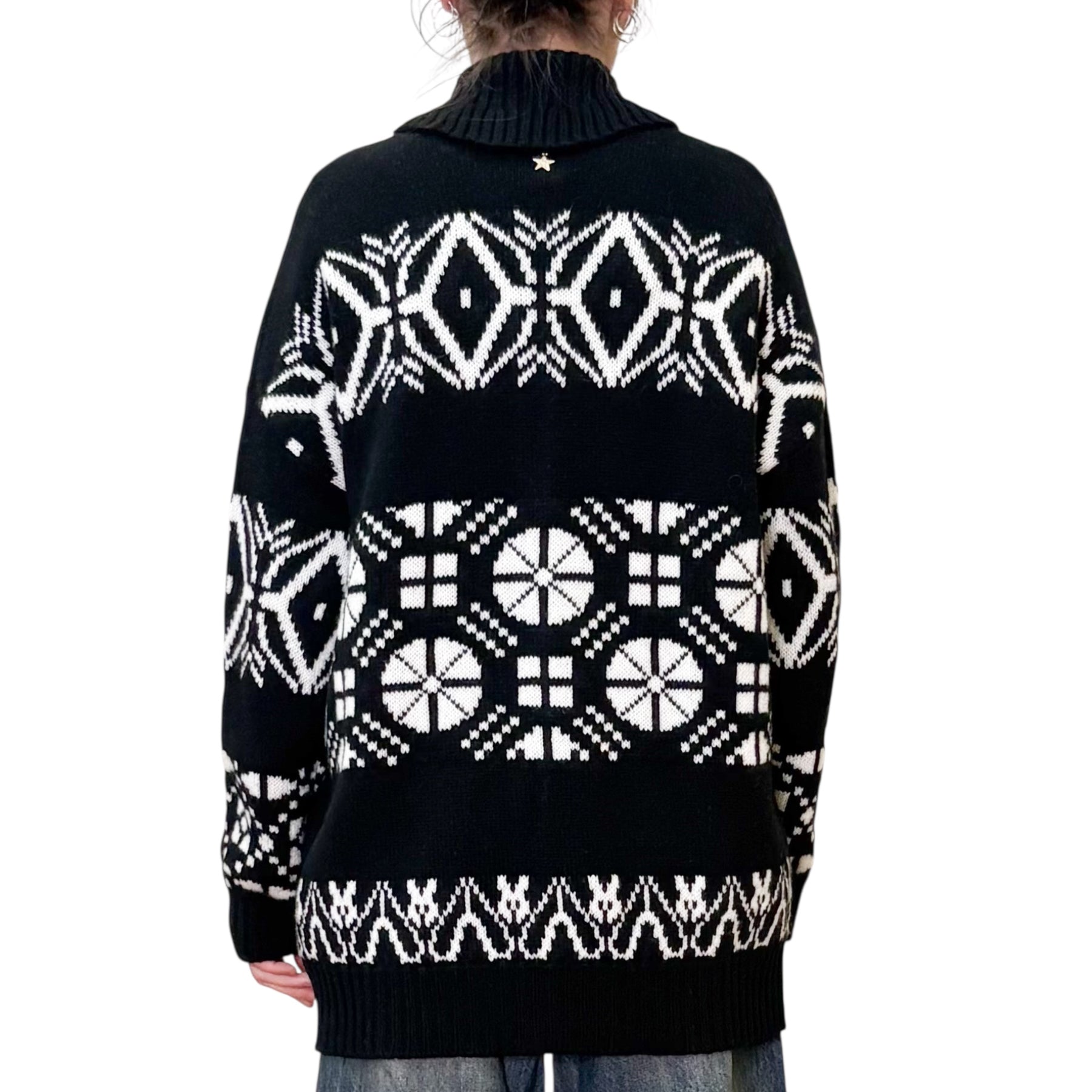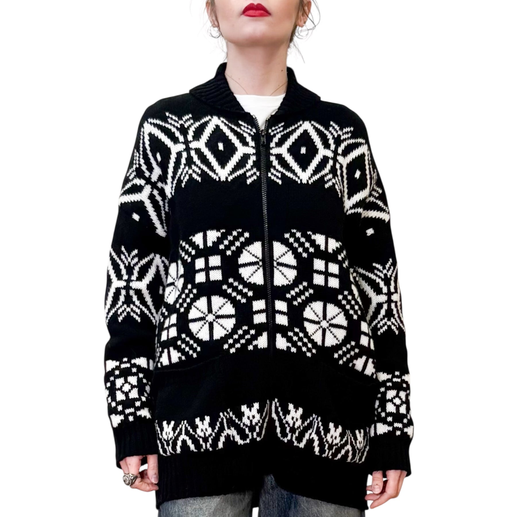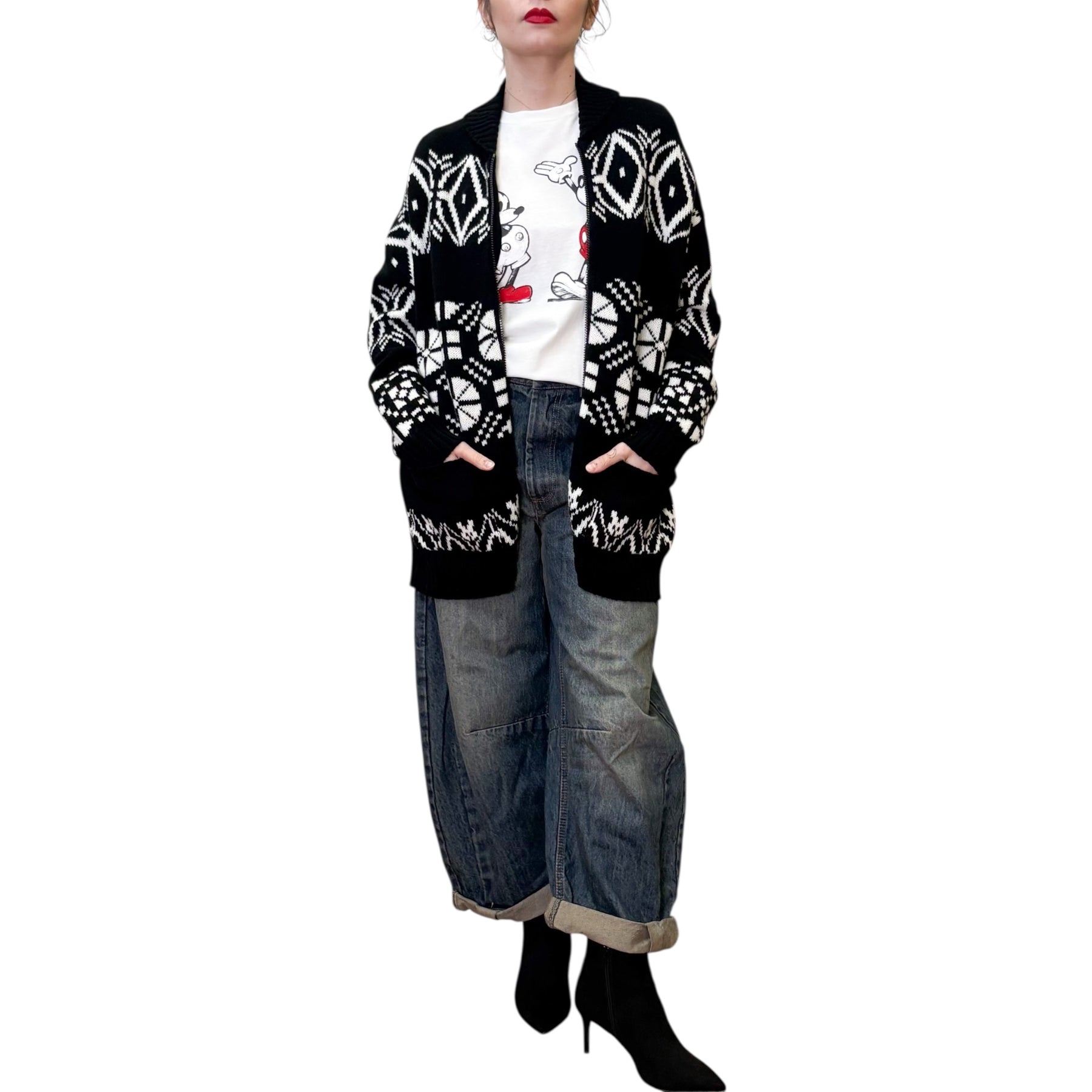Cardigan lungo con allacciatura con zip in lana e cachemire con disegni jacquard , colletto rotondo e tasche .