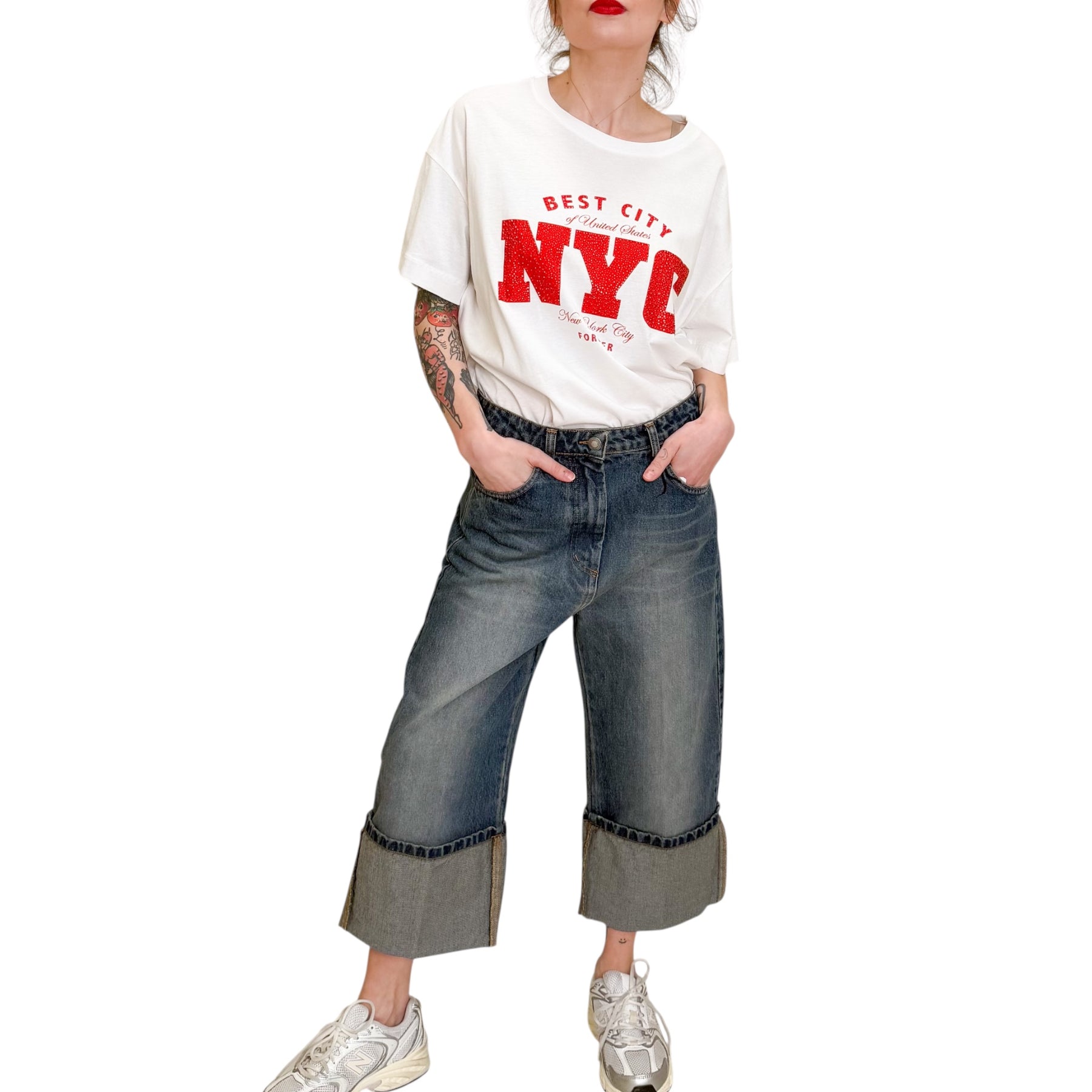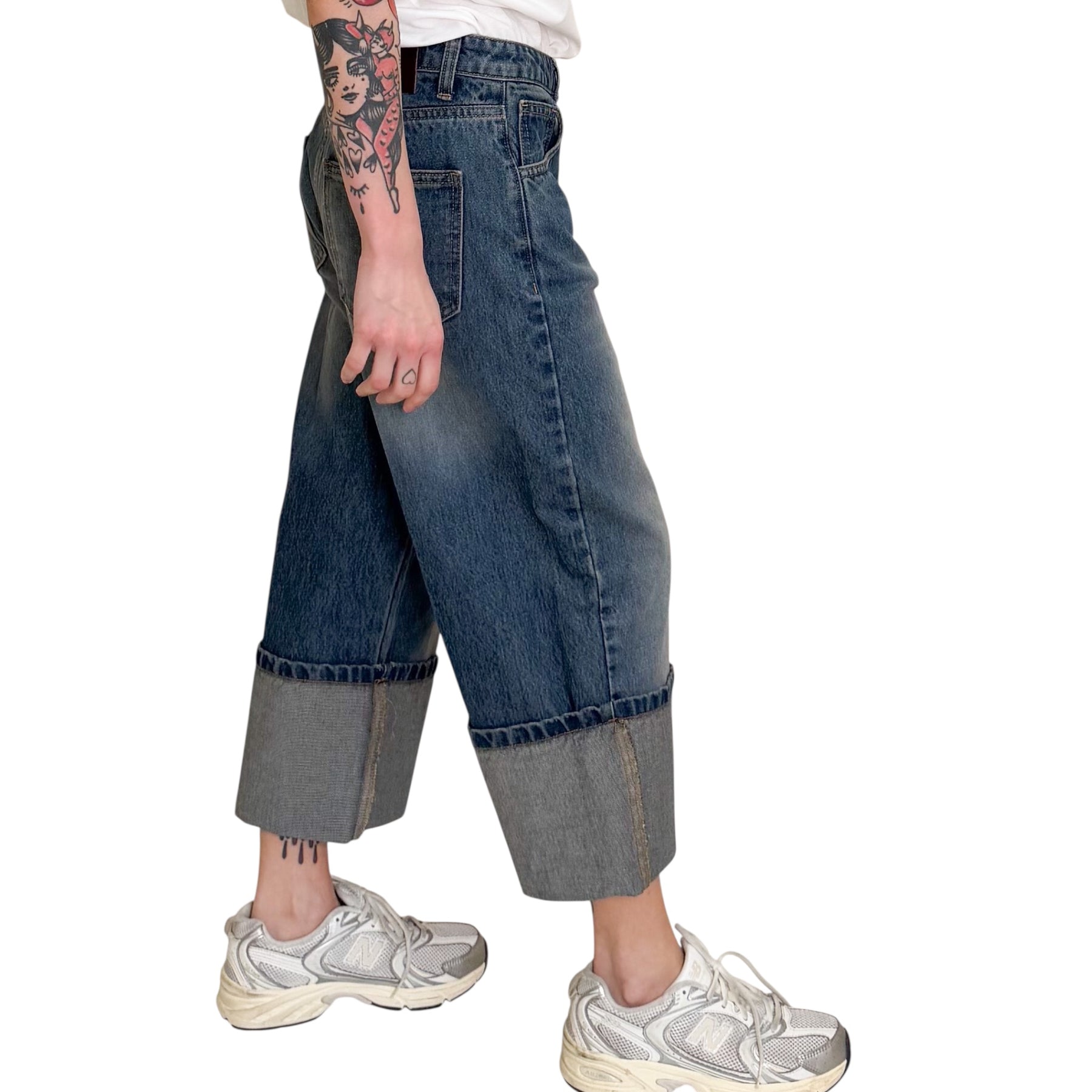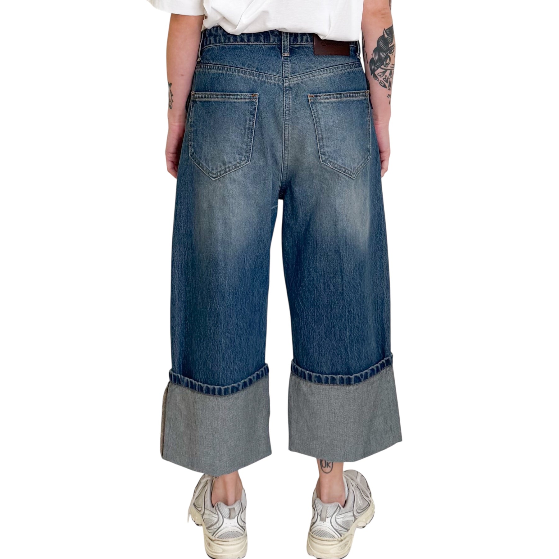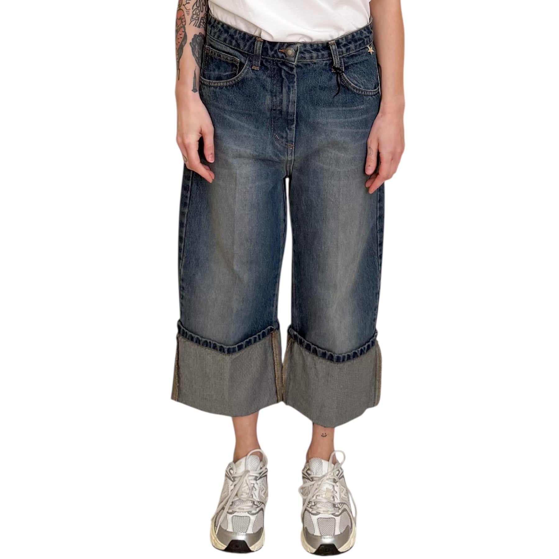 Jeans in denim lavaggio delavè corto con risvolto .